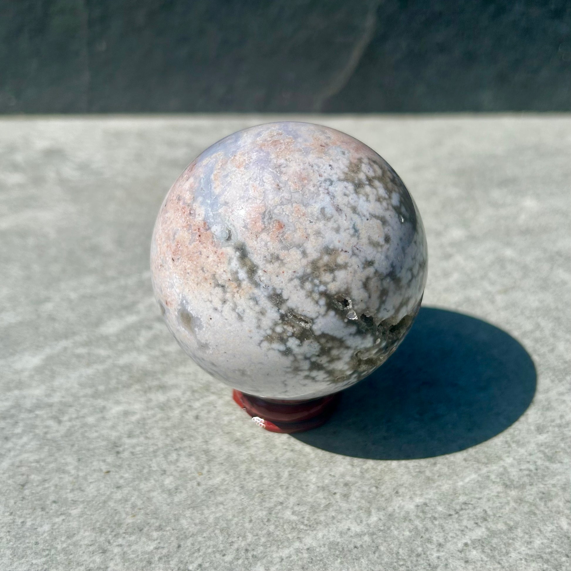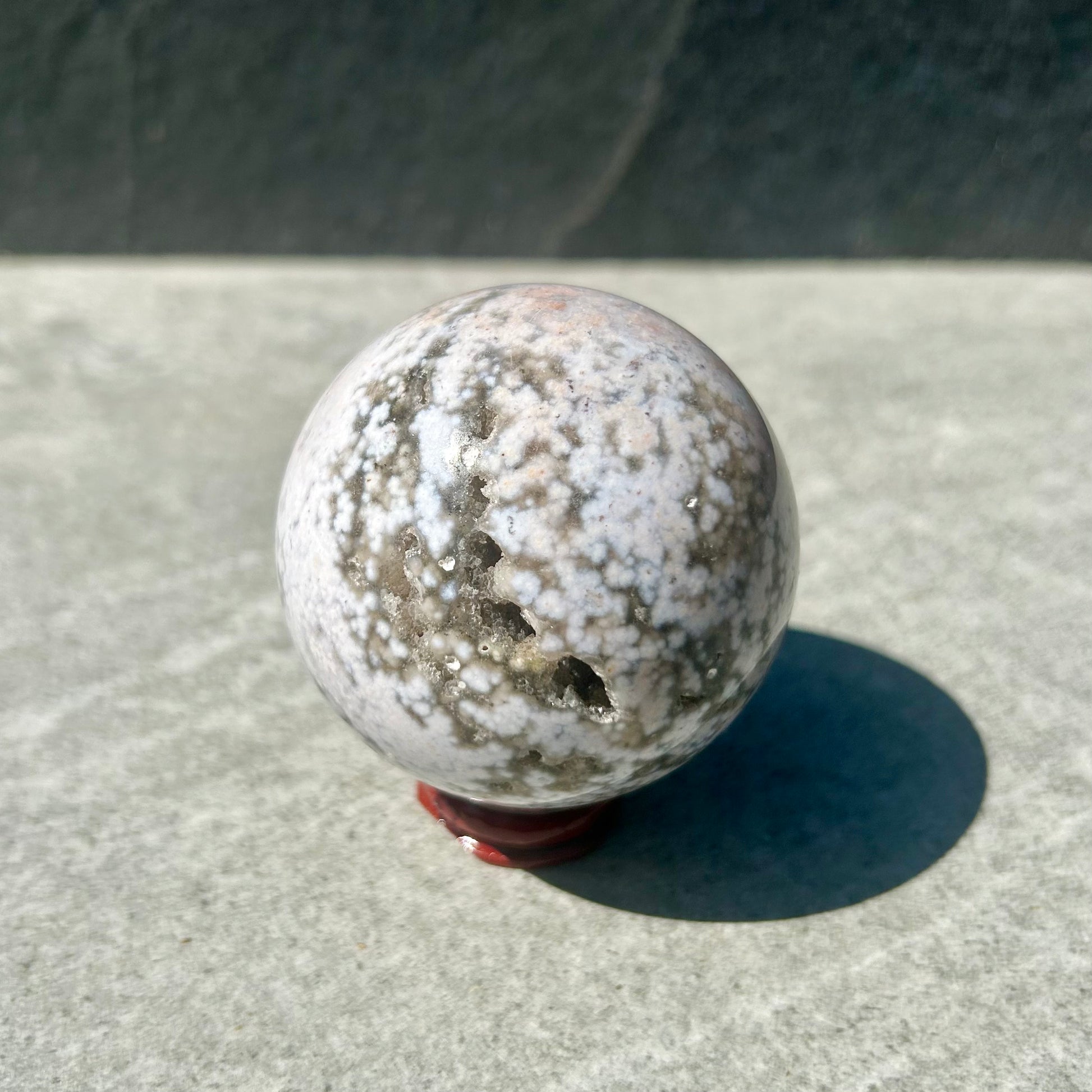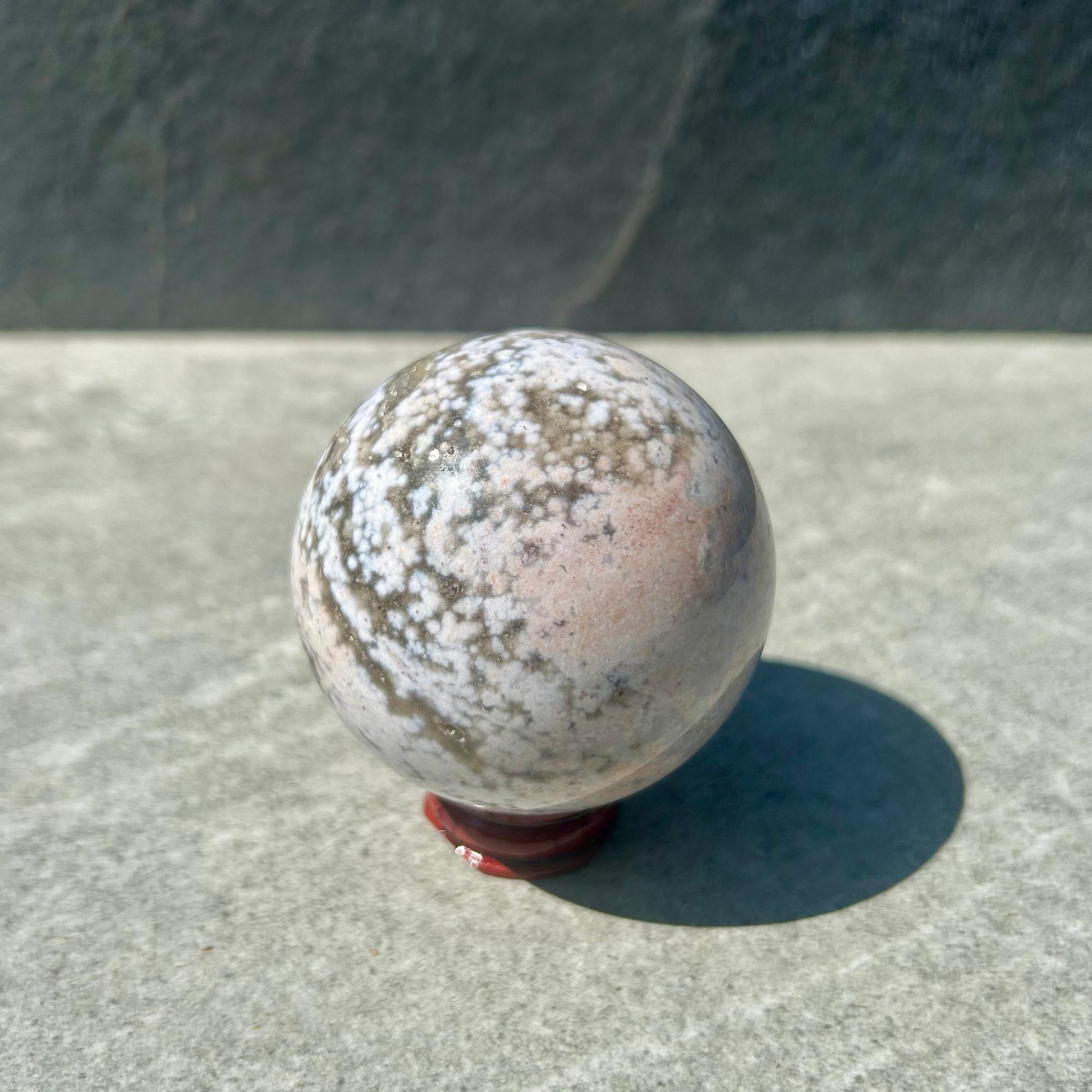 This 8 Vein Ocean Jasper Sphere showcases a rare and intricate pattern of eight distinct veins, highlighting the stone’s natural beauty and complexity. Known for its grounding and calming properties, Ocean Jasper is prized by collectors and crystal enthusiasts alike. Perfect for meditation or display, this sphere offers a unique blend of aesthetic appeal and energetic balance, making it a valuable addition to any collection.