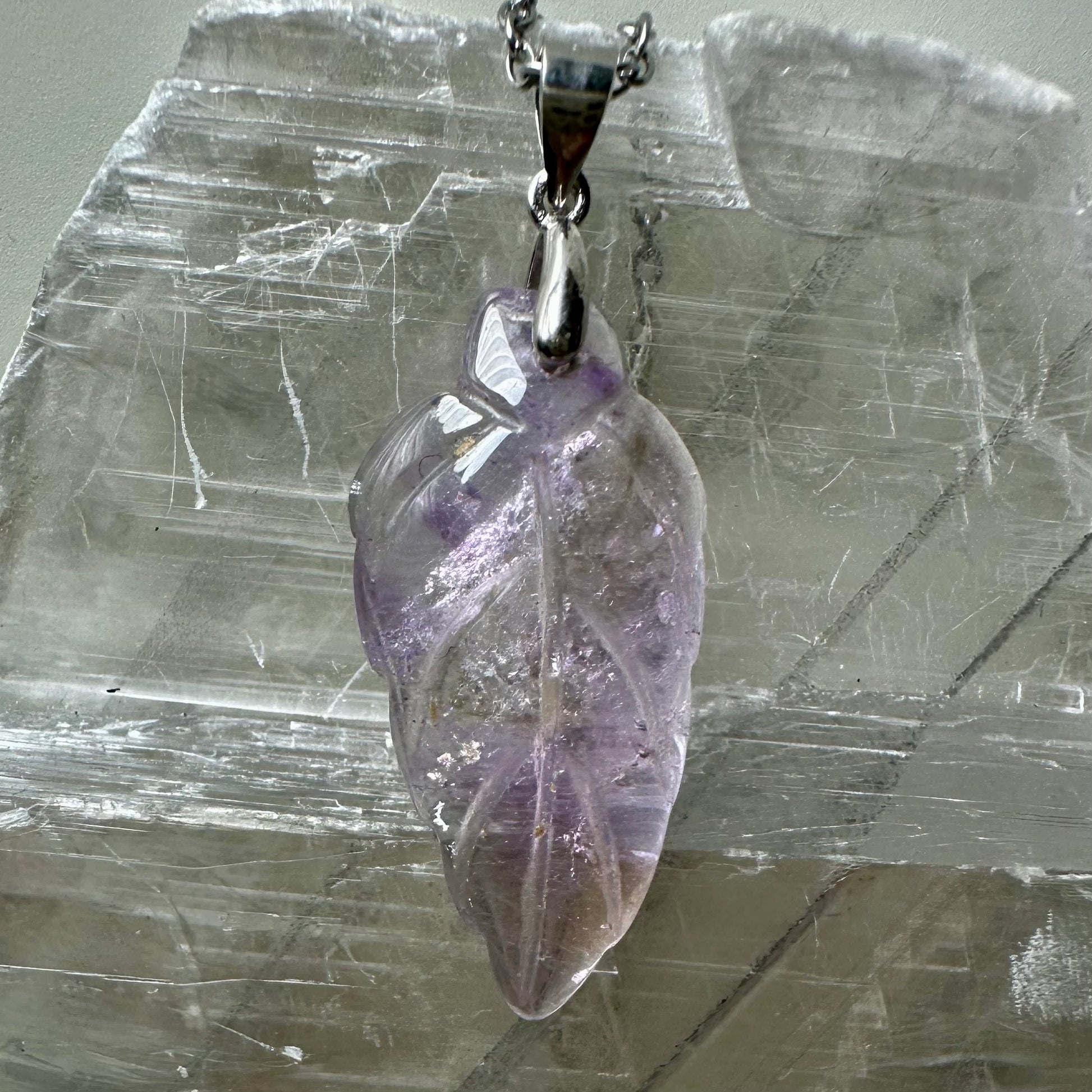 # 925 Amerturine Leaf Carving Pendant 3cm Crafted from sterling silver, this exquisite pendant features a hand-carved leaf design in Amerturine, a captivating gemstone known for its soothing energy and connection to emotional balance. Measuring 3cm, the delicate carving showcases the stone's natural beauty whilst the 925 silver setting ensures durability and timeless elegance. Amerturine is traditionally valued for promoting tranquility and inner peace, making this pendant an ideal choice for those seeking both aesthetic refinement and meaningful spiritual significance. A versatile accessory that complements any jewellery collection.