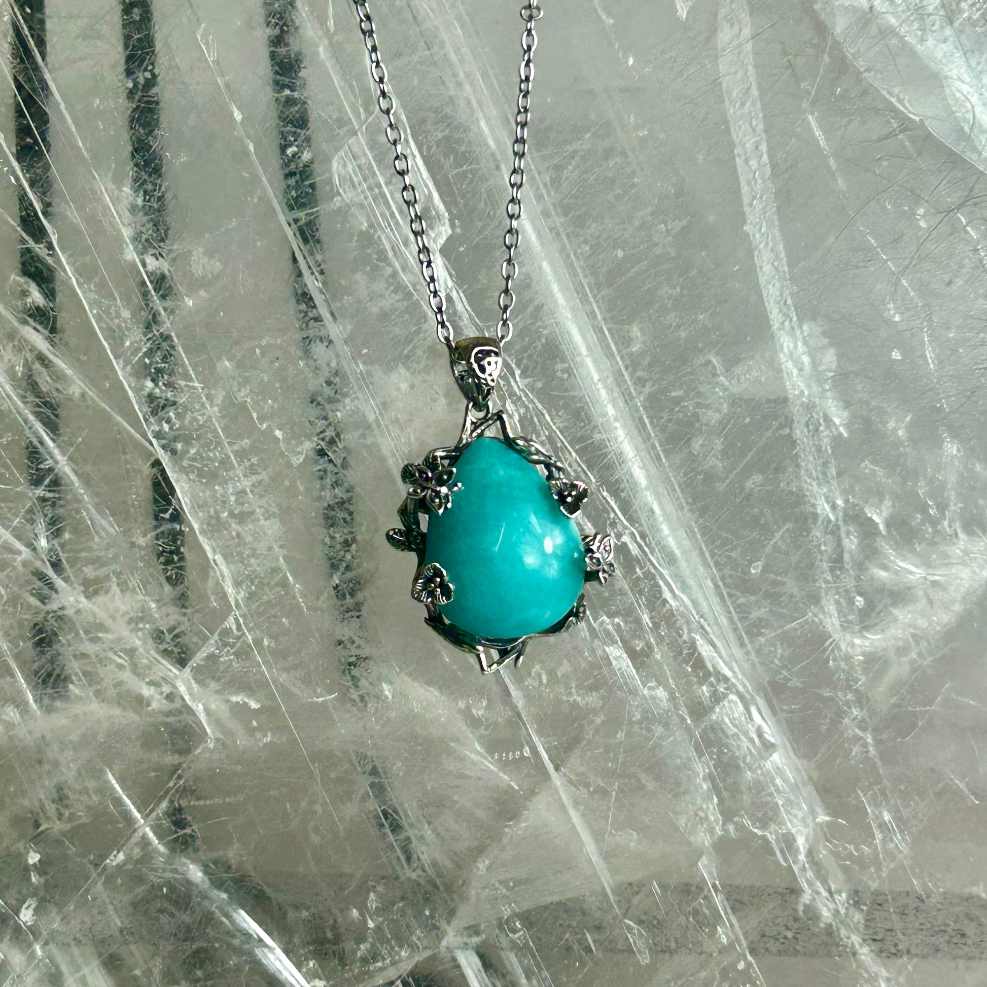 # 925 Silver Amazonite Pendant Crafted from sterling silver, this elegant pendant features a natural amazonite stone, prized for its soothing blue-green hues and calming properties. Amazonite is traditionally associated with tranquility and emotional balance, making it a meaningful choice for those seeking mindful wellness jewellery. The 925 silver setting ensures durability and timeless appeal, while the stone's unique veining guarantees each piece is one-of-a-kind. Perfect as a personal talisman or thoughtful gift for someone embarking on their wellness journey.