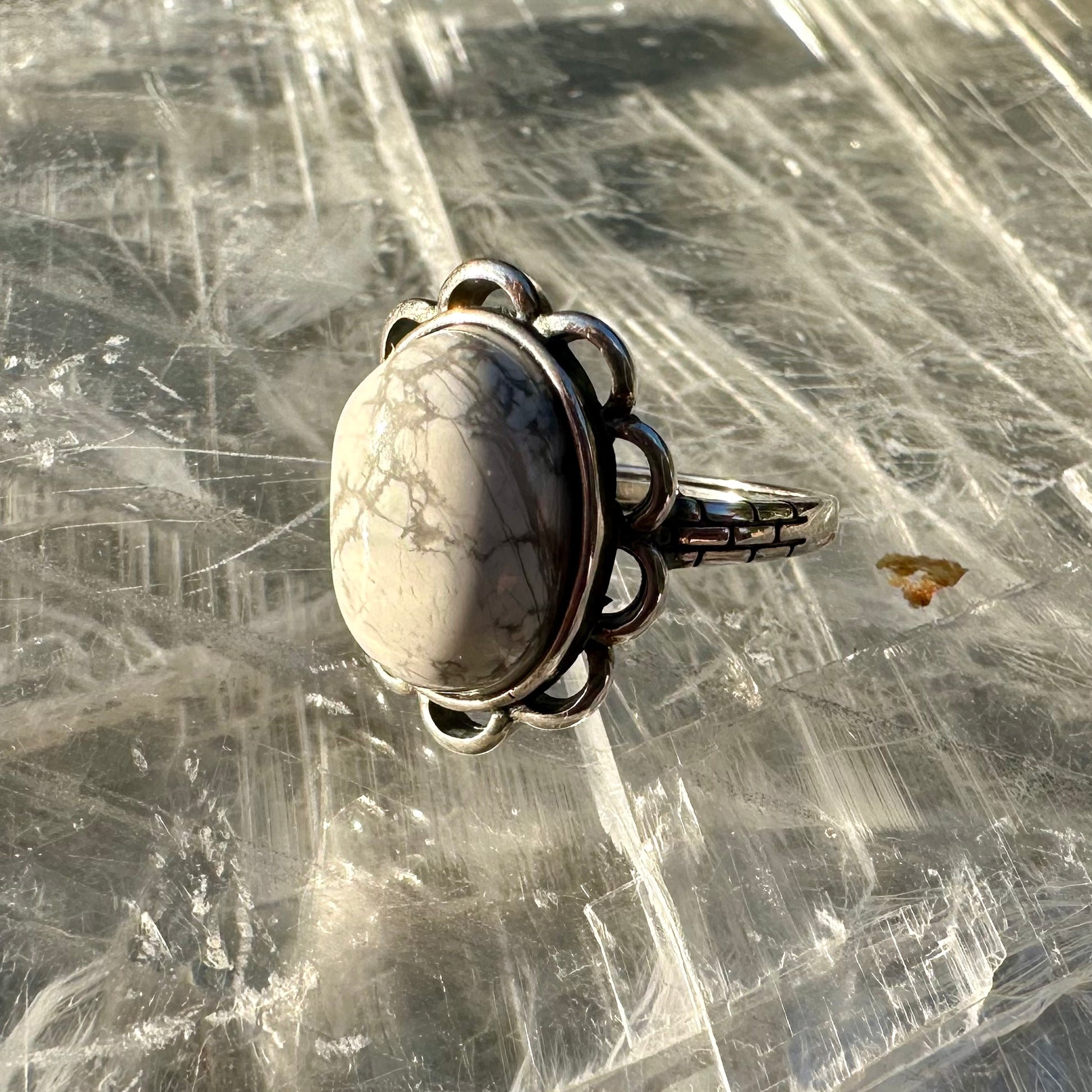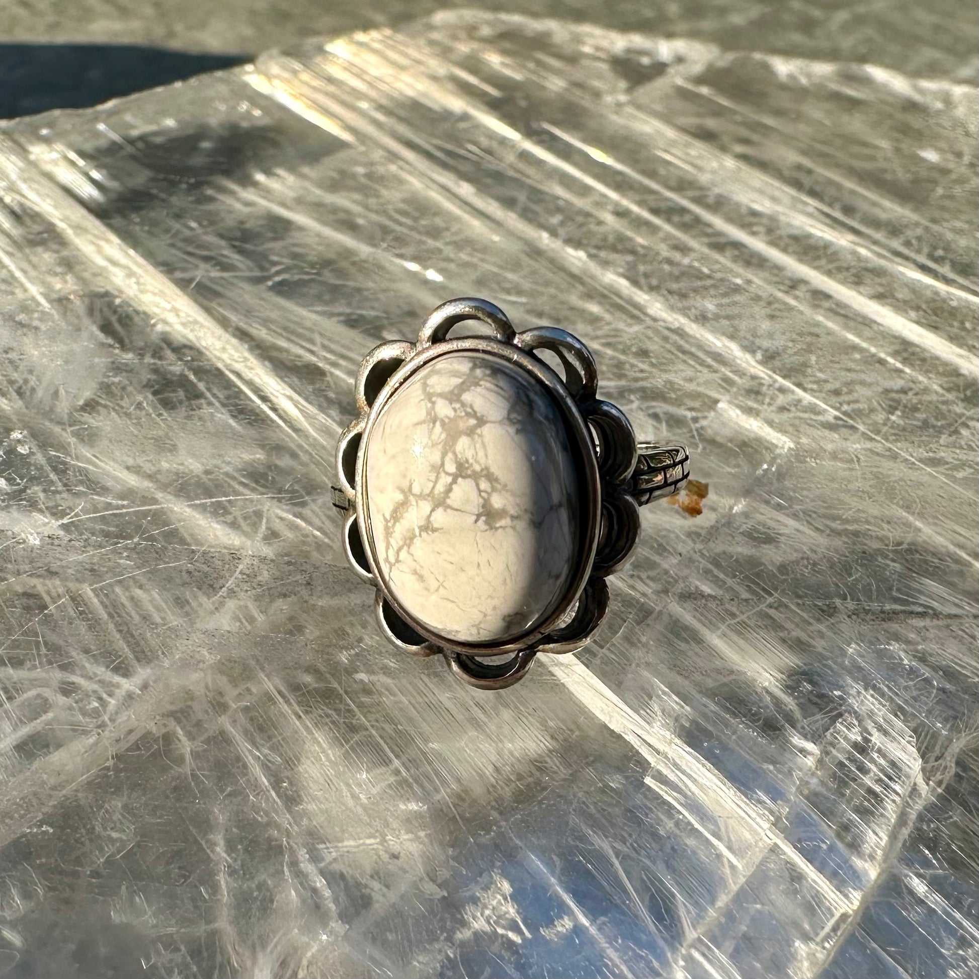 Crafted with sterling silver (925), this adjustable Howlite ring combines elegance and versatility. The smooth Howlite stone is known for its calming qualities, making this piece both stylish and beneficial for promoting peace of mind. Its adjustable design ensures a precise fit, offering comfort without compromising on sophistication—ideal for everyday wear or special occasions.