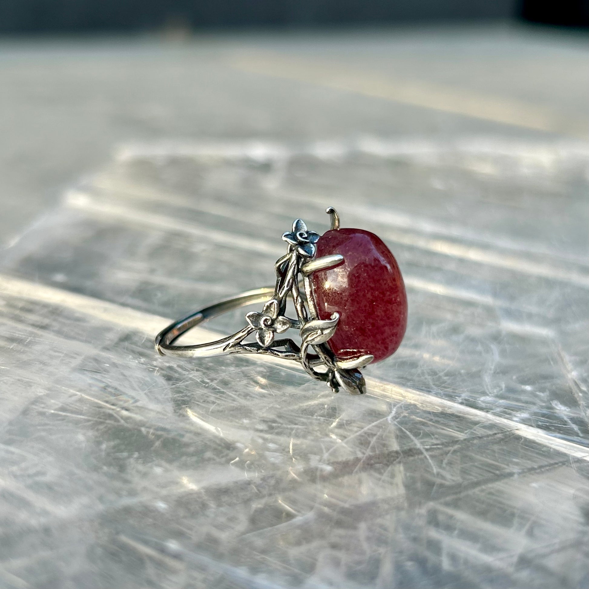 Crafted from sterling silver, this adjustable ring features a stunning strawberry quartz gemstone known for its gentle pink hues and natural inclusions. The adjustable band ensures a comfortable fit for any finger size, making it a versatile addition to your jewelry collection. Perfect for those who appreciate both elegance and the subtle beauty of natural stones, this piece combines quality craftsmanship with expert design.