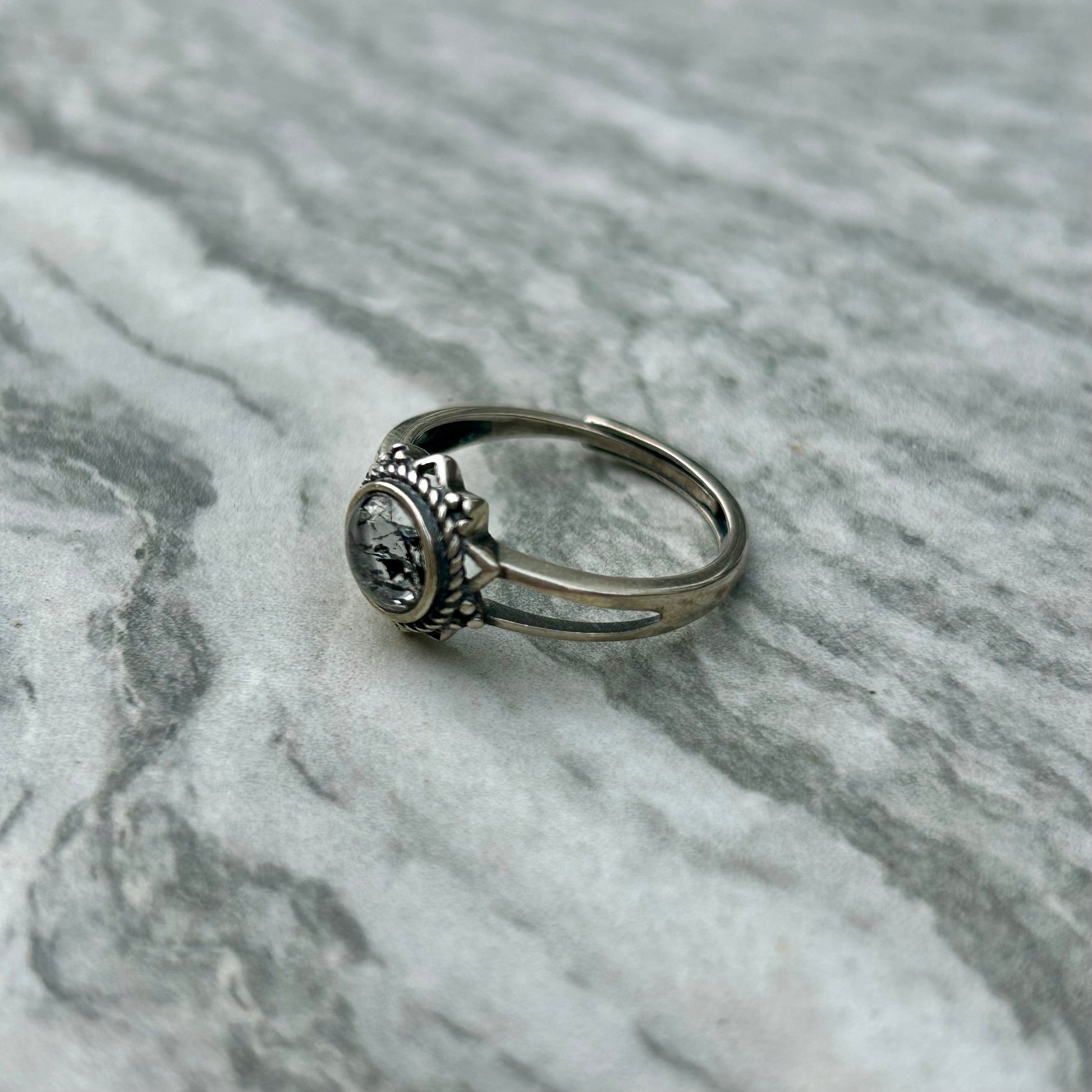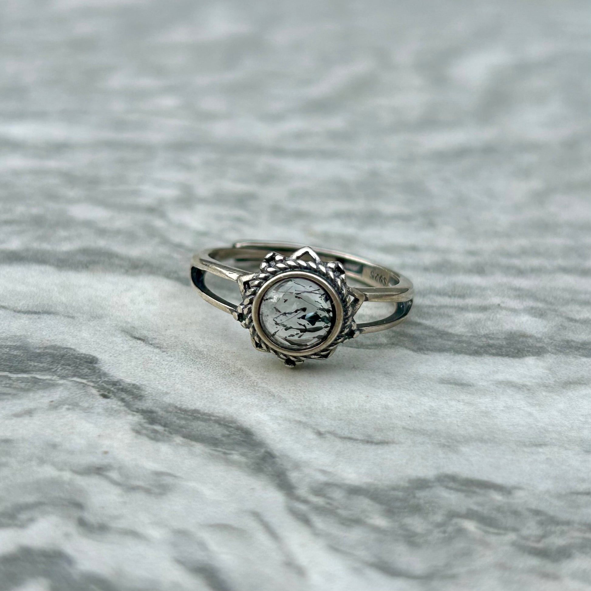 This high-grade adjustable ring is expertly crafted from 925 sterling silver and showcases a premium tourmalinated quartz stone, known for its distinctive black needle-like inclusions embedded within clear quartz. Designed for a precise yet flexible fit, the ring combines superior craftsmanship with natural beauty, offering both durability and elegance. Its sophisticated appearance complements any ensemble while highlighting the unique patterns of the tourmalinated quartz.