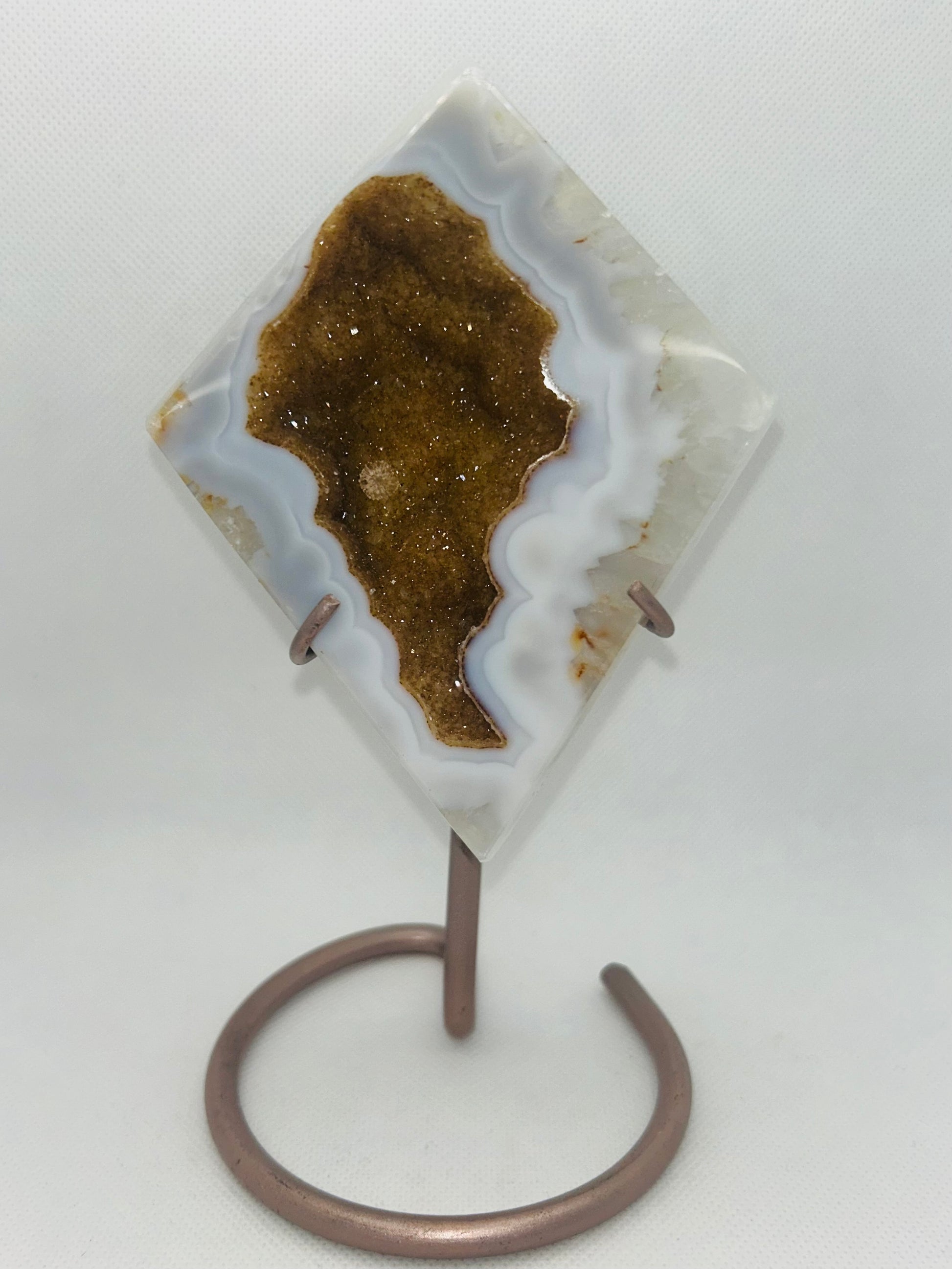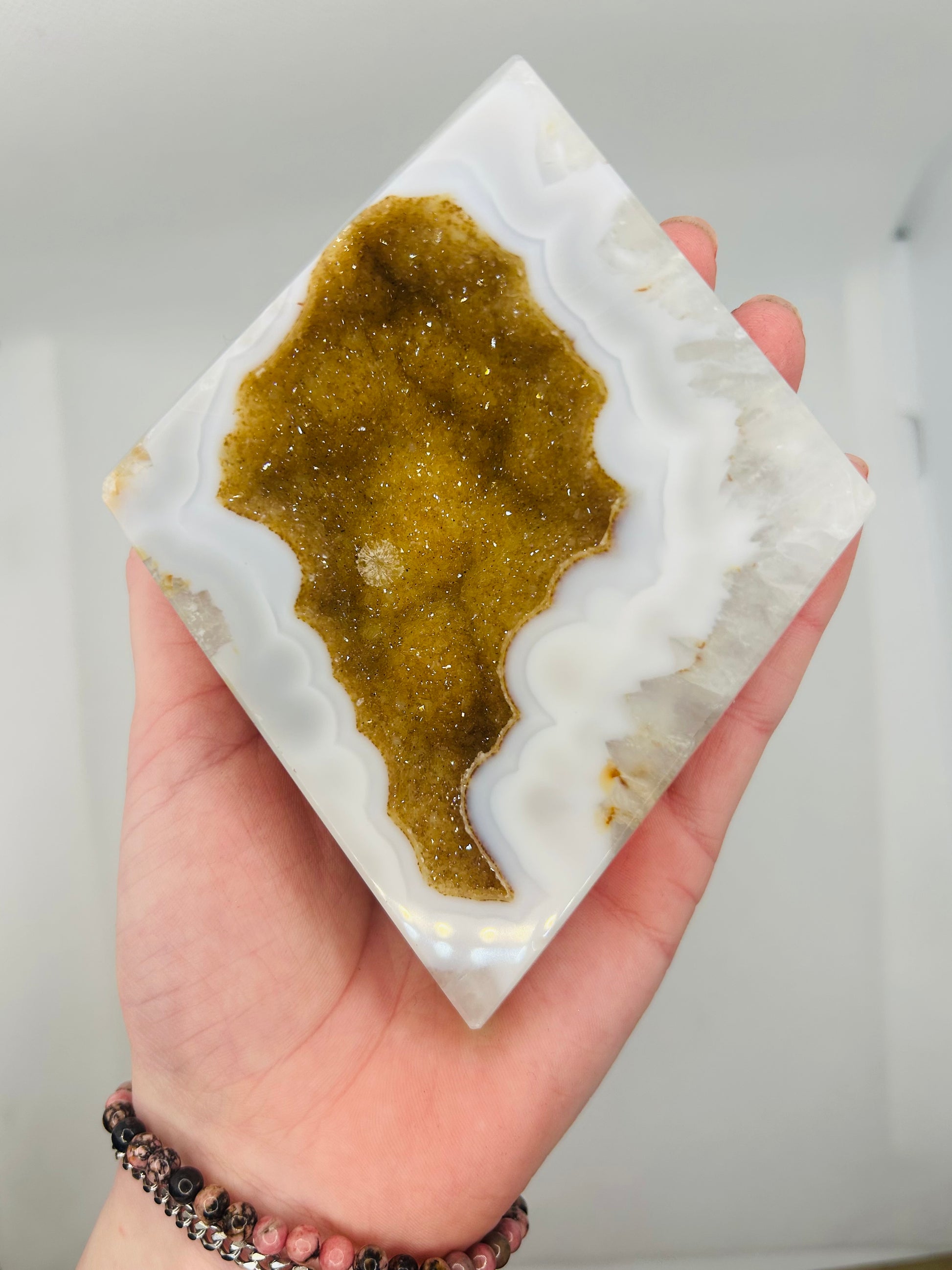 This handcrafted Agate and Quartz statement piece is meticulously carved to showcase the natural beauty and unique patterns of the stones. The intricate diamond carving adds a touch of elegance to this one-of-a-kind creation. Display it as a centrepiece or use it to elevate any room's decor.