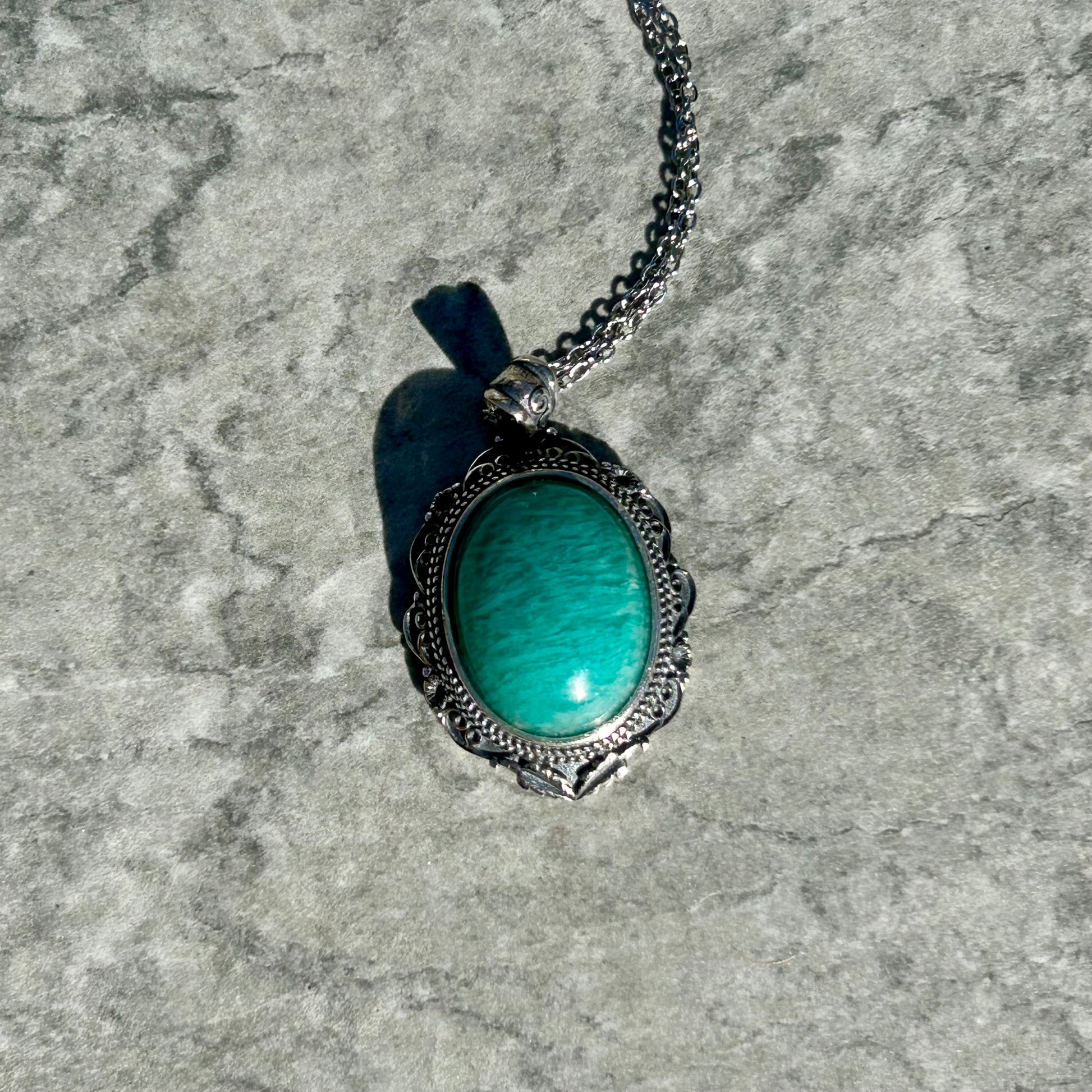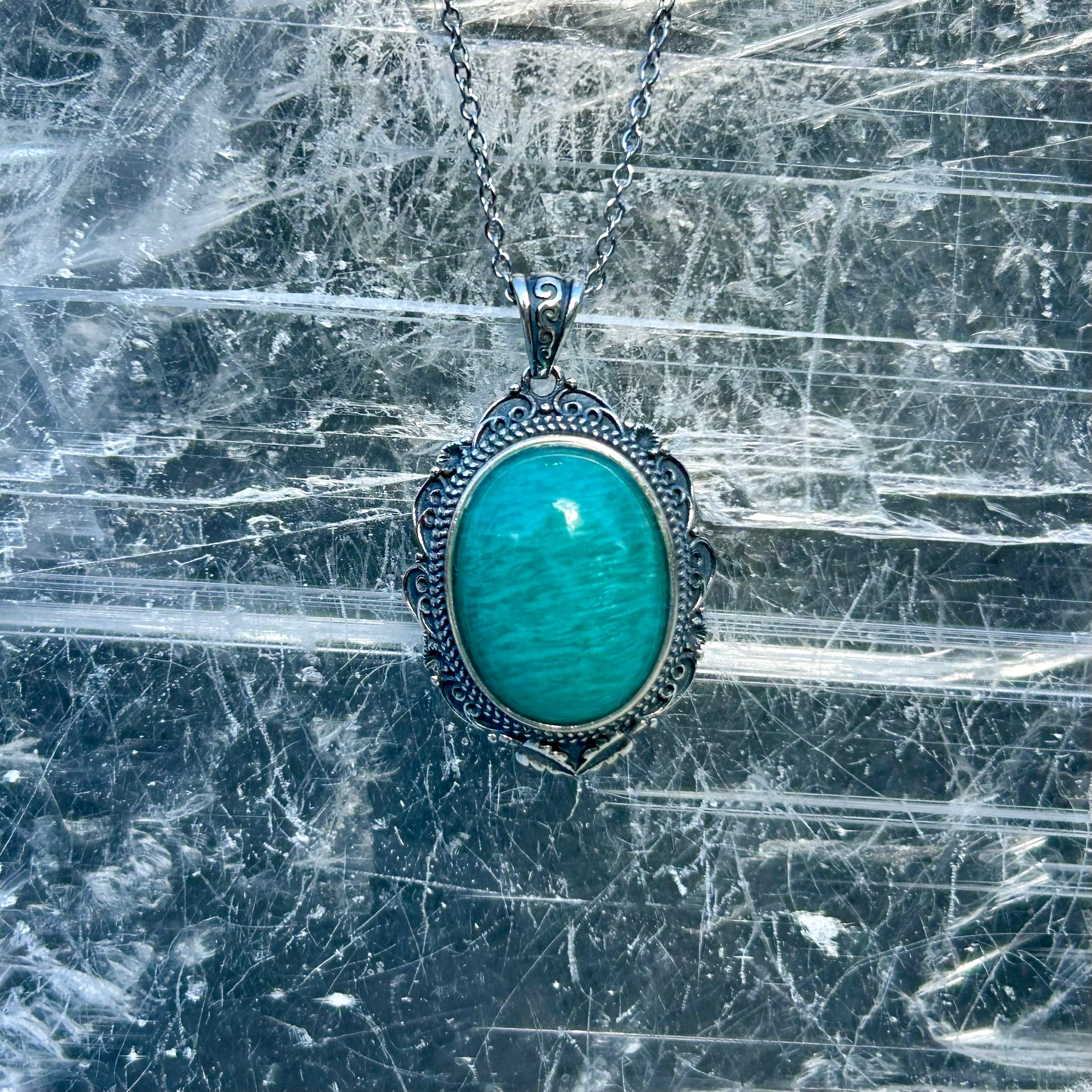 Crafted from sterling silver, this Amazonite 925 pendant showcases the stone's calming blue-green hue, known for promoting balance and clarity. Expertly set to highlight its natural beauty, it offers both elegance and a connection to soothing energy, making it a refined accessory for everyday wear or special occasions.