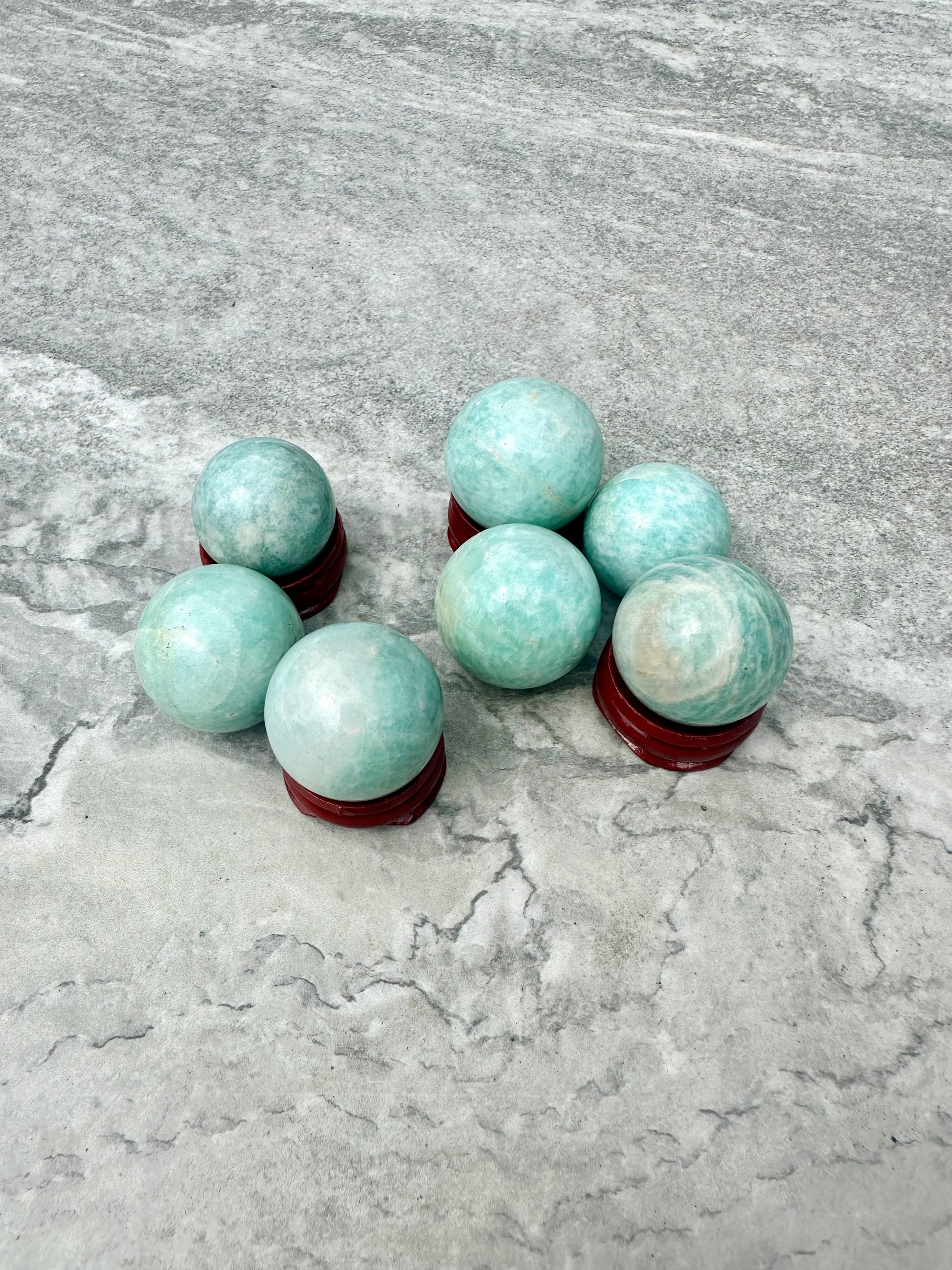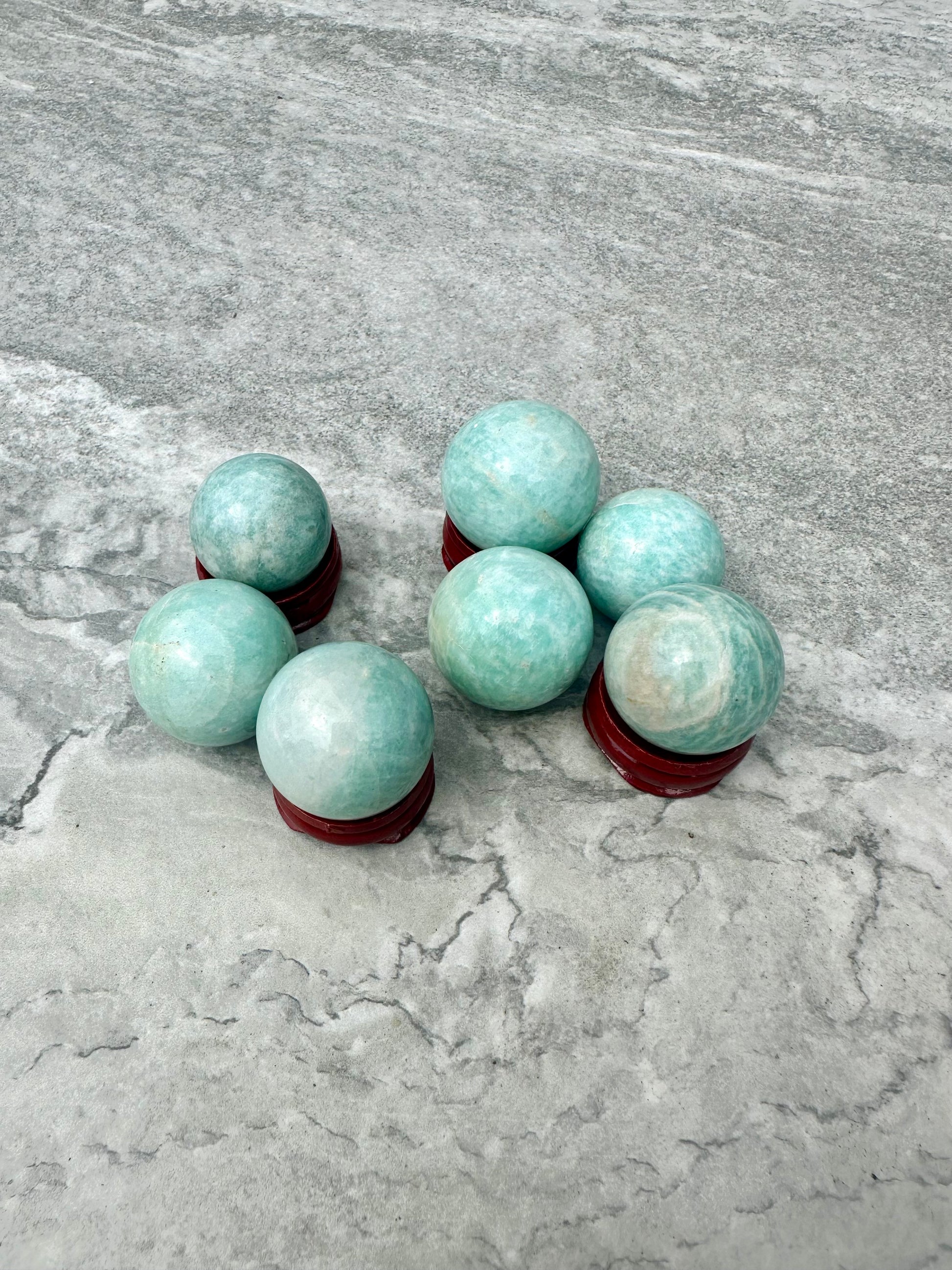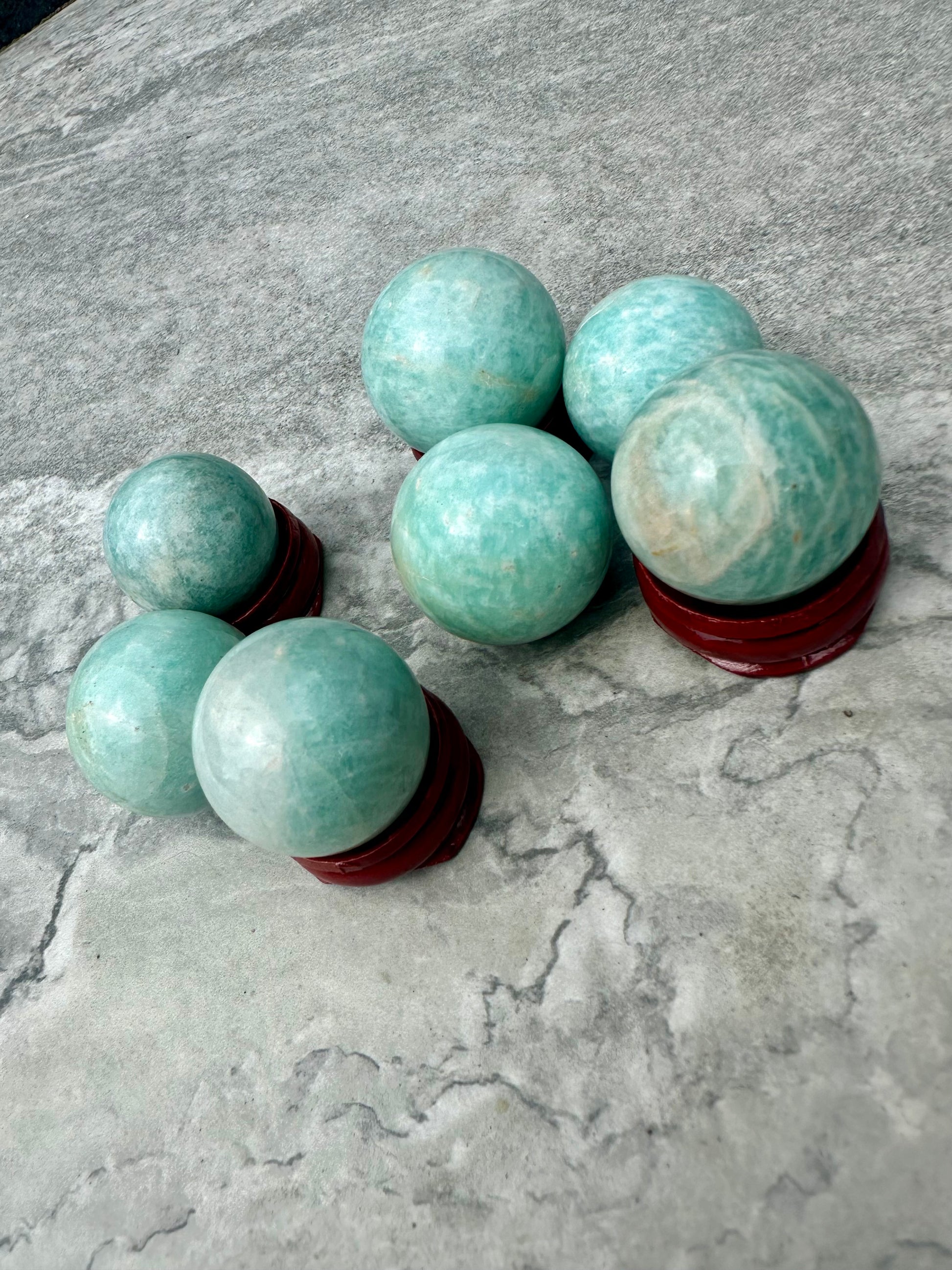 Add depth and beauty to your crystal collection with Amazonite Spheres. Each purchase comes with the rare opportunity to own one of only 7 remaining in stock. They are all 11 pound each.Don't wait any longer to experience the grounding and calming properties of this stunning stone. Get yours today before they're gone!