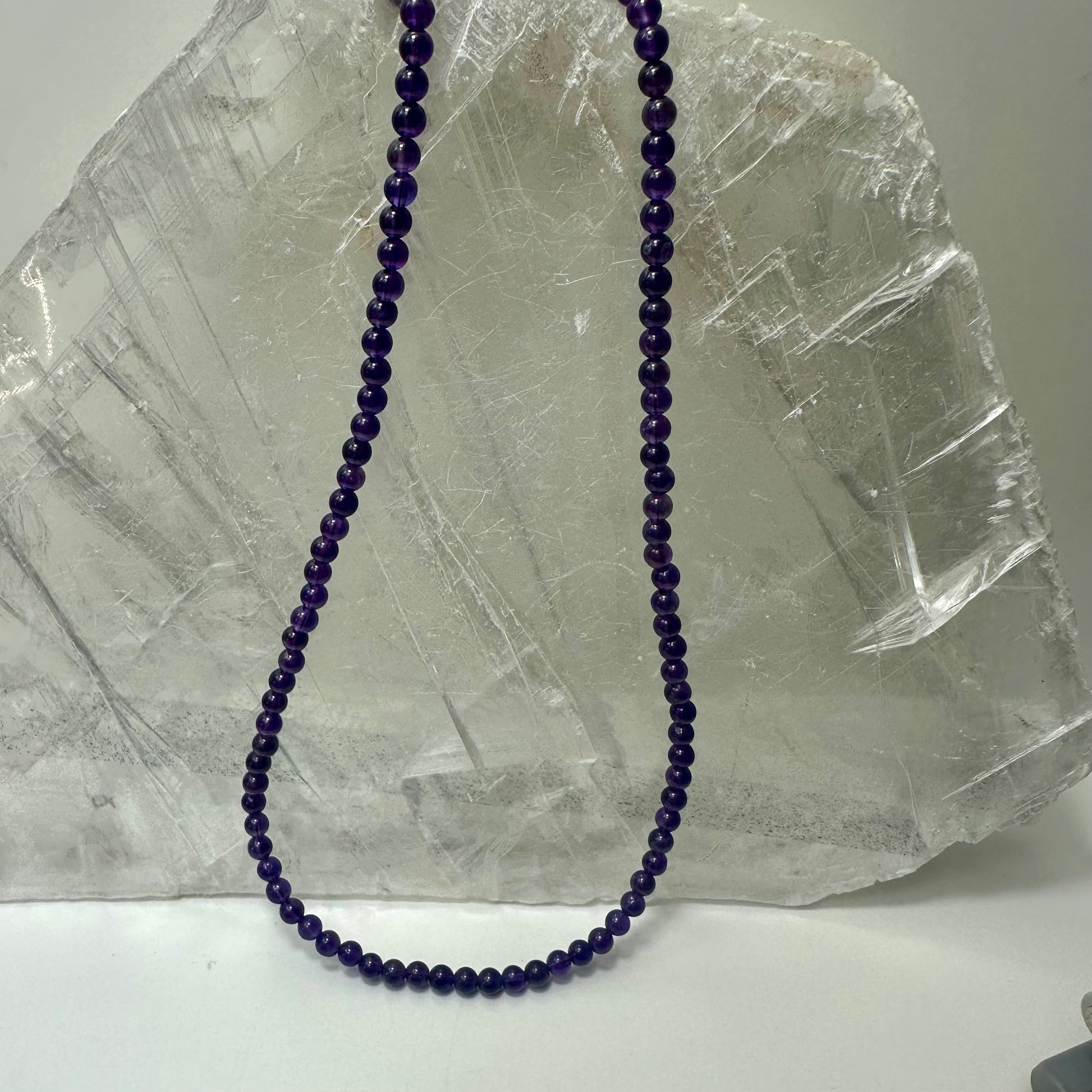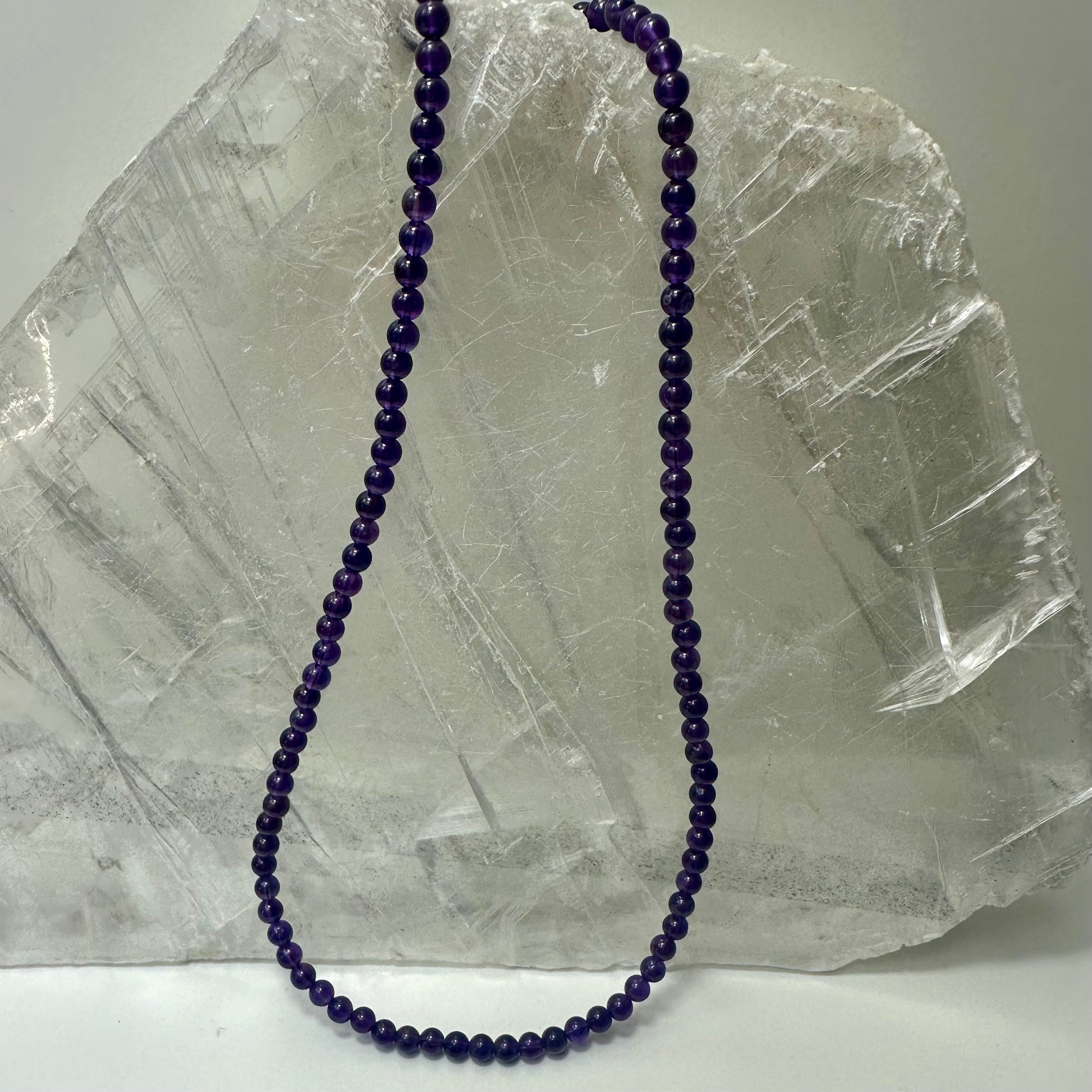 Amethyst Beaded Necklace Crafted with 4.9mm amethyst beads, this 51cm necklace weighs just 19g, making it comfortable for everyday wear. Amethyst is traditionally valued for its calming properties and is believed to promote clarity, tranquility, and spiritual awareness. The deep purple stone has been cherished throughout history as a symbol of protection and inner peace. This delicate piece combines natural beauty with meaningful symbolism, ideal for those seeking both aesthetic appeal and energetic support.