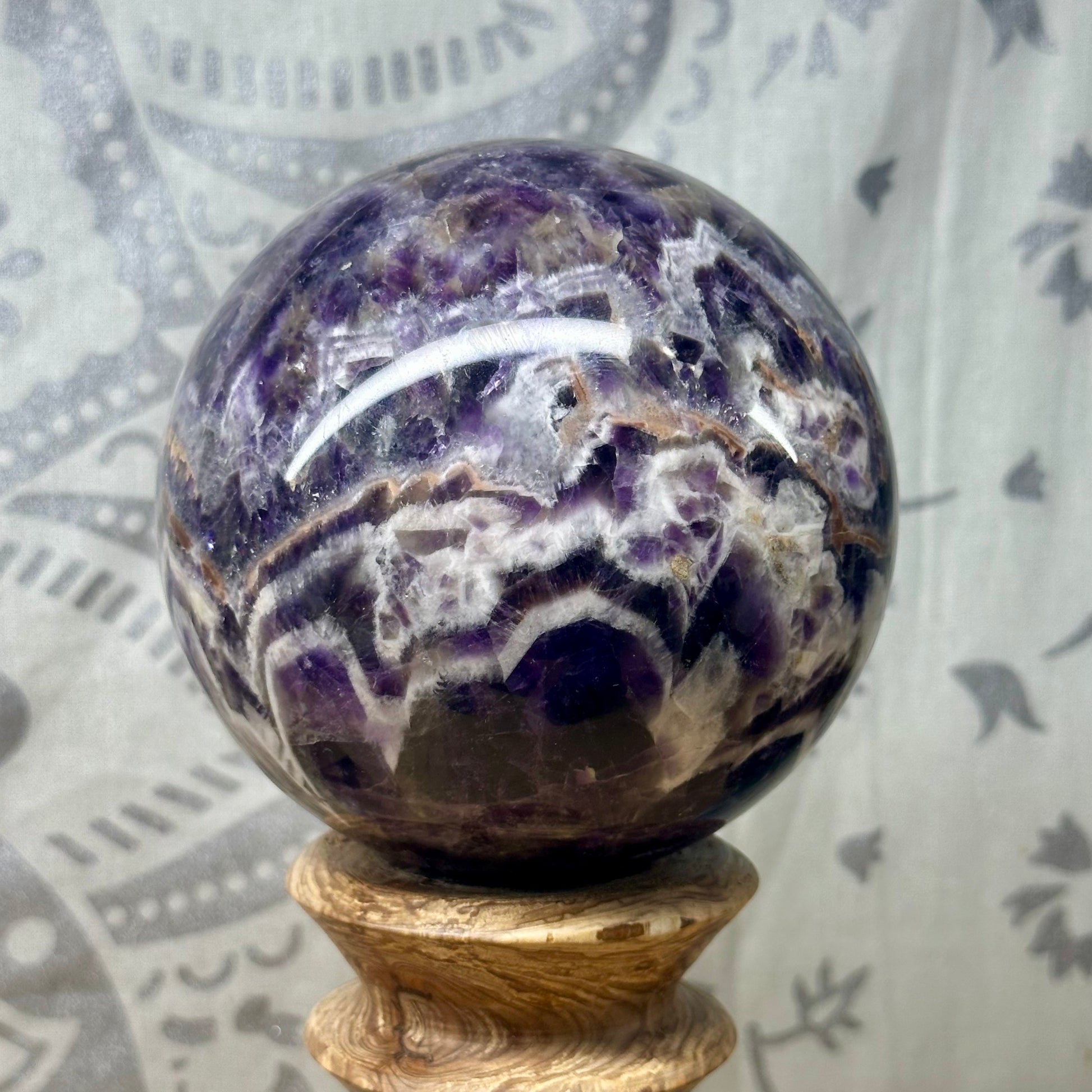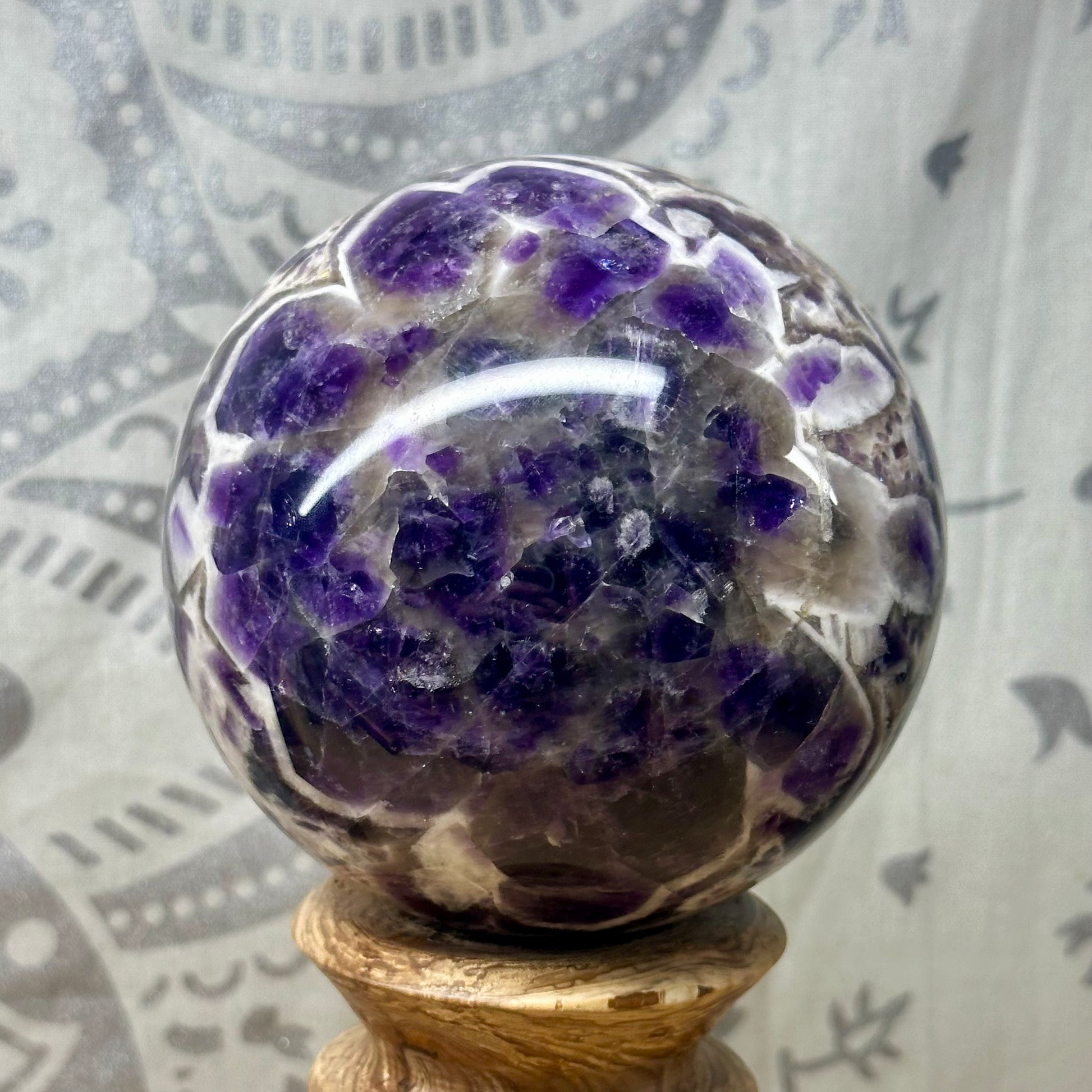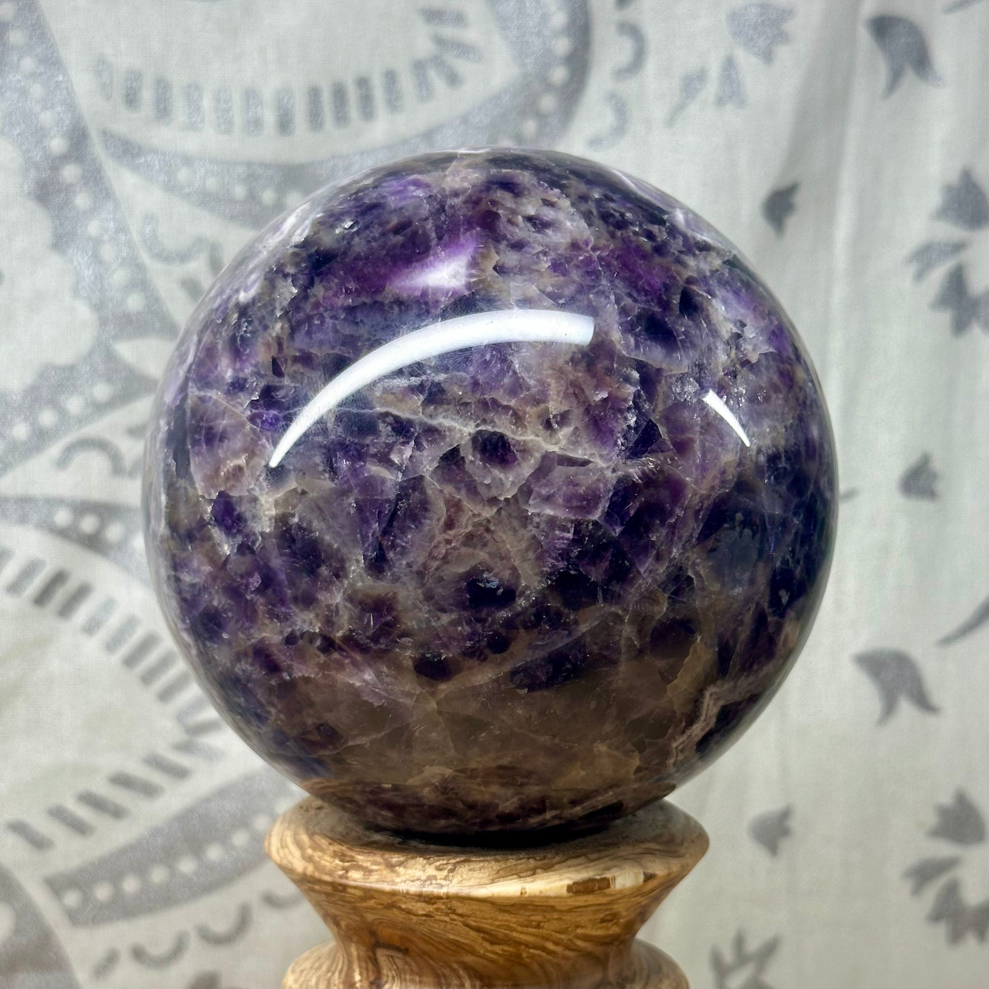 The Amethyst Sphere Statement, measuring 12cm in diameter and weighing 1900g, is a finely crafted crystal known for its profound calming and healing properties. Its perfectly polished surface ensures even energy flow, making it an excellent tool for meditation, stress relief, and enhancing spiritual awareness. The deep purple tones of this sphere symbolize protection and transformation, promoting emotional stability and mental clarity. Ideal for collectors and practitioners alike, this piece combines natural beauty with powerful metaphysical benefits.