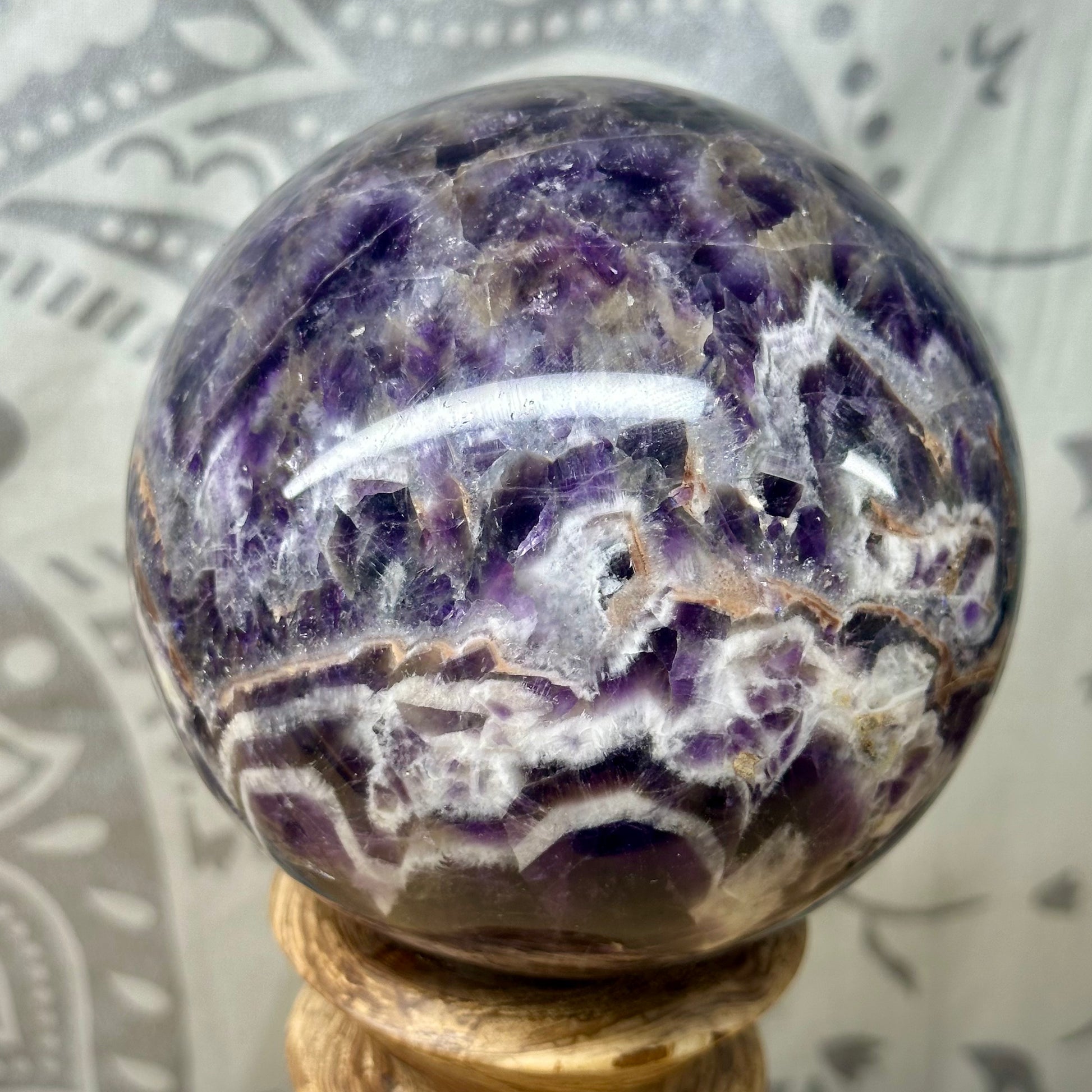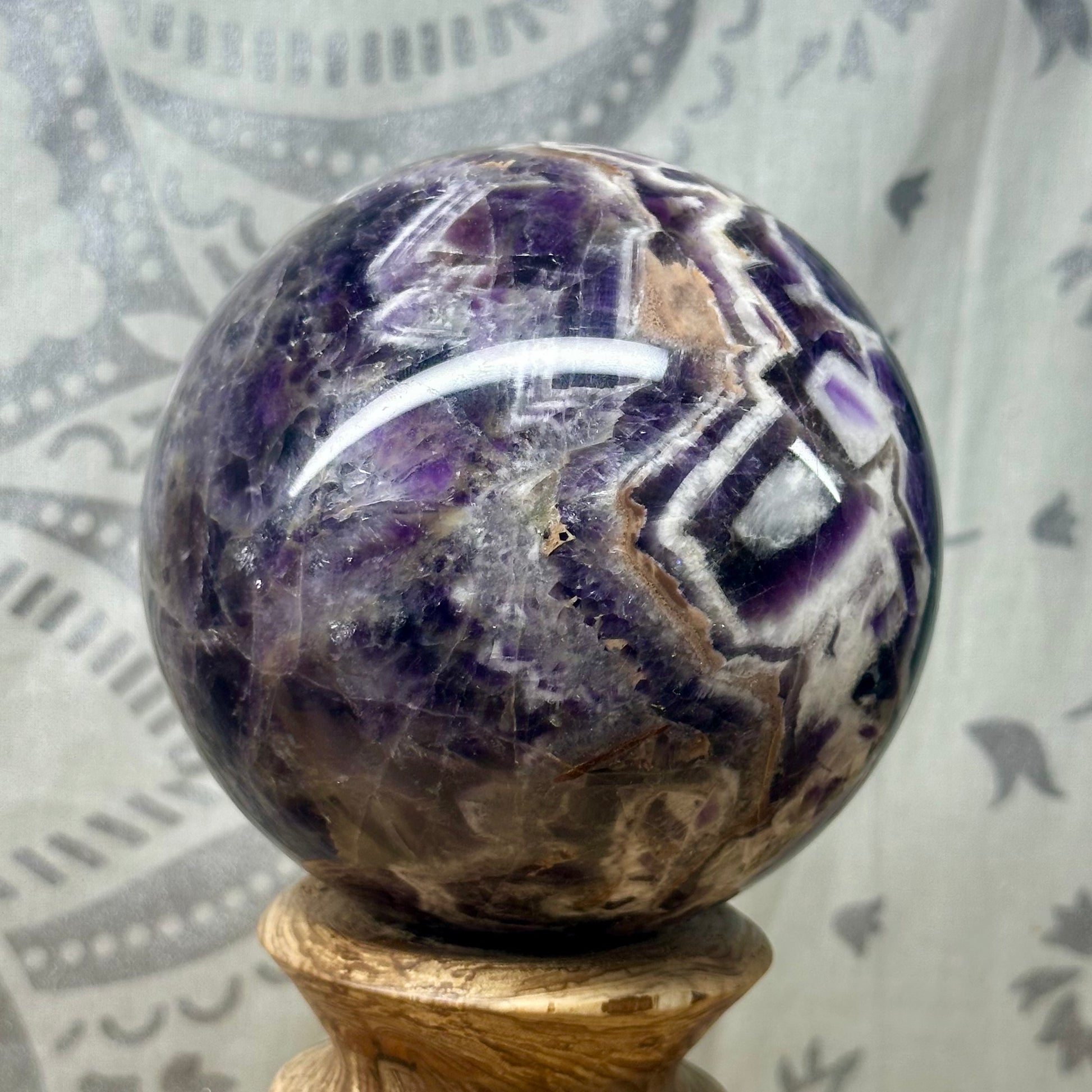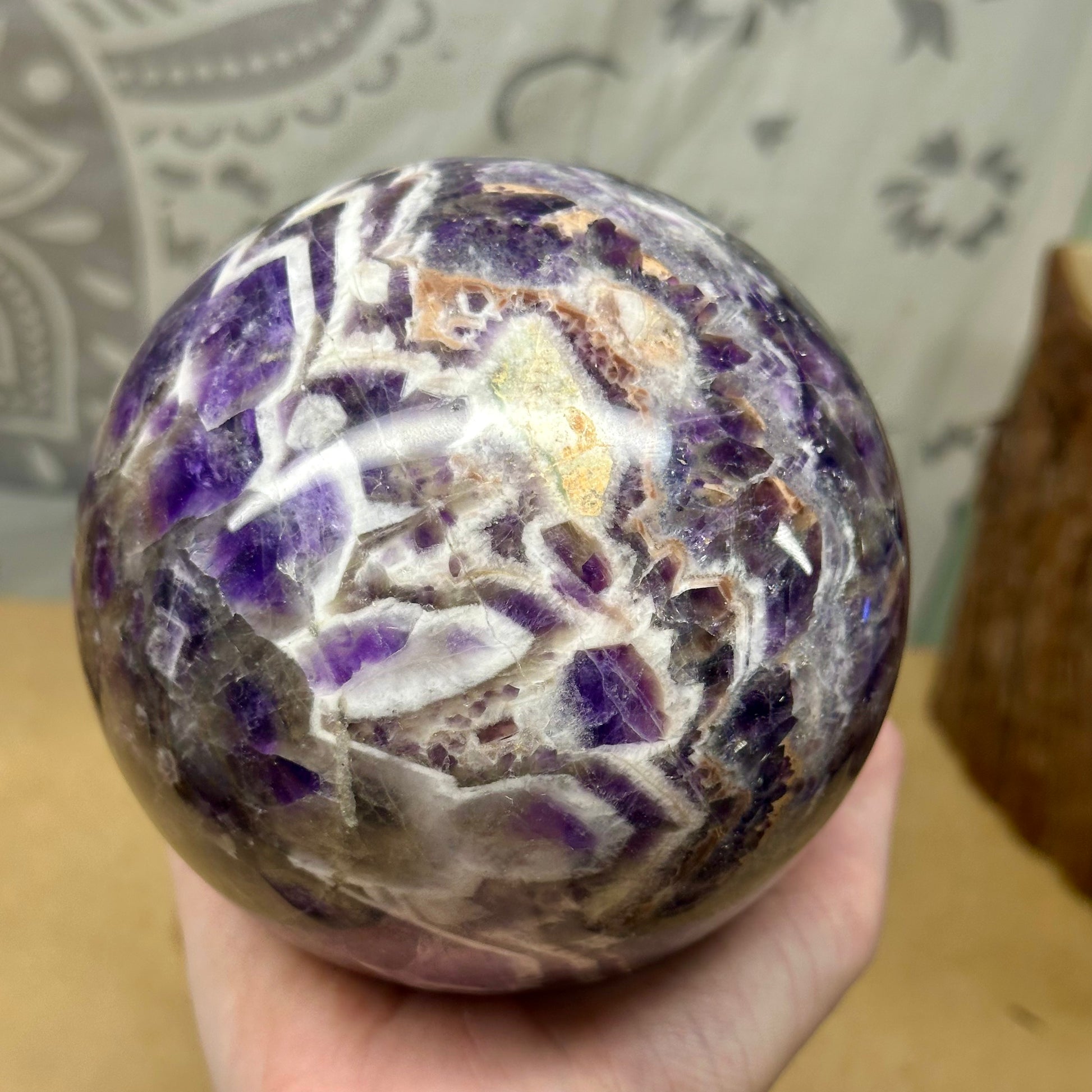 The Amethyst Sphere Statement, measuring 12cm in diameter and weighing 1900g, is a finely crafted crystal known for its profound calming and healing properties. Its perfectly polished surface ensures even energy flow, making it an excellent tool for meditation, stress relief, and enhancing spiritual awareness. The deep purple tones of this sphere symbolize protection and transformation, promoting emotional stability and mental clarity. Ideal for collectors and practitioners alike, this piece combines natural beauty with powerful metaphysical benefits.