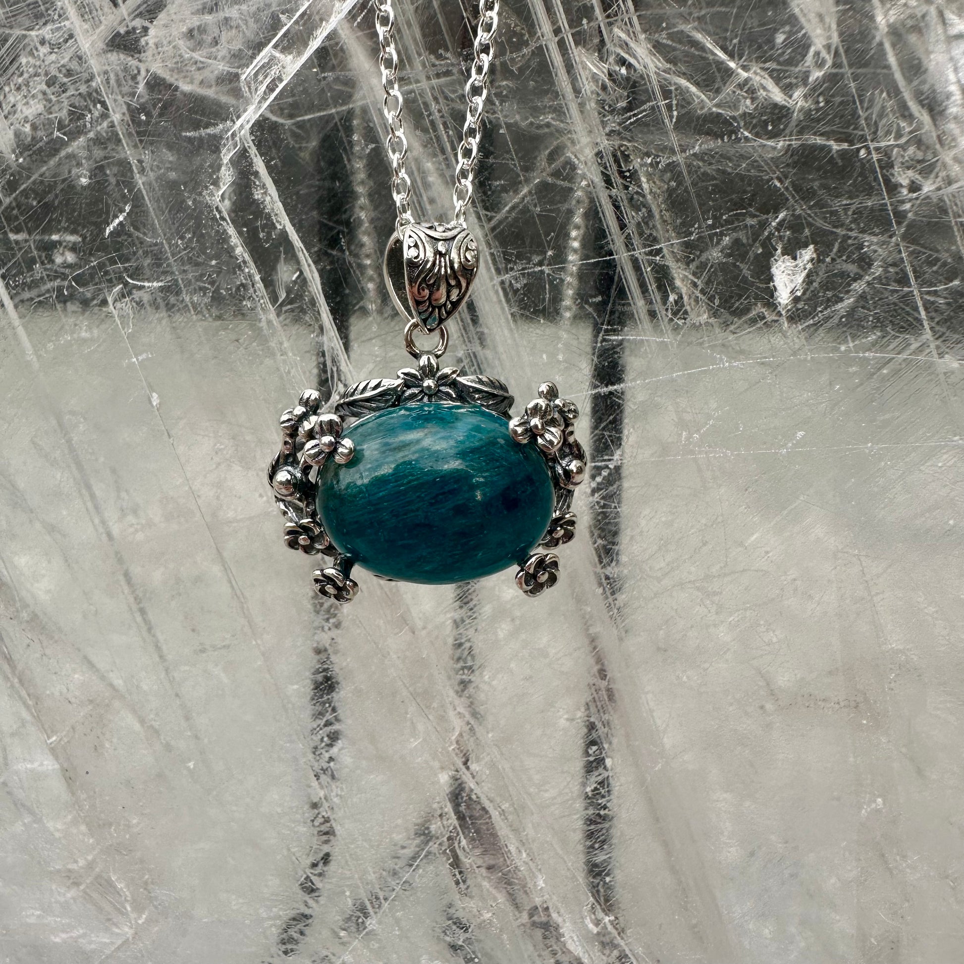 Blue Apatite Pendant & Ring Harness the clarifying energy of blue apatite with this elegant dual-piece set. Blue apatite is prized by crystal enthusiasts for its association with mental clarity, communication, and spiritual insight. This pendant and ring combination allows you to carry the stone's grounding properties throughout your day, whether worn together or separately. Each piece showcases the stone's distinctive blue hues, ranging from soft sky tones to deeper ocean shades. Perfect for meditation practitioners, energy workers, or anyone seeking a meaningful addition to their crystal collection.
