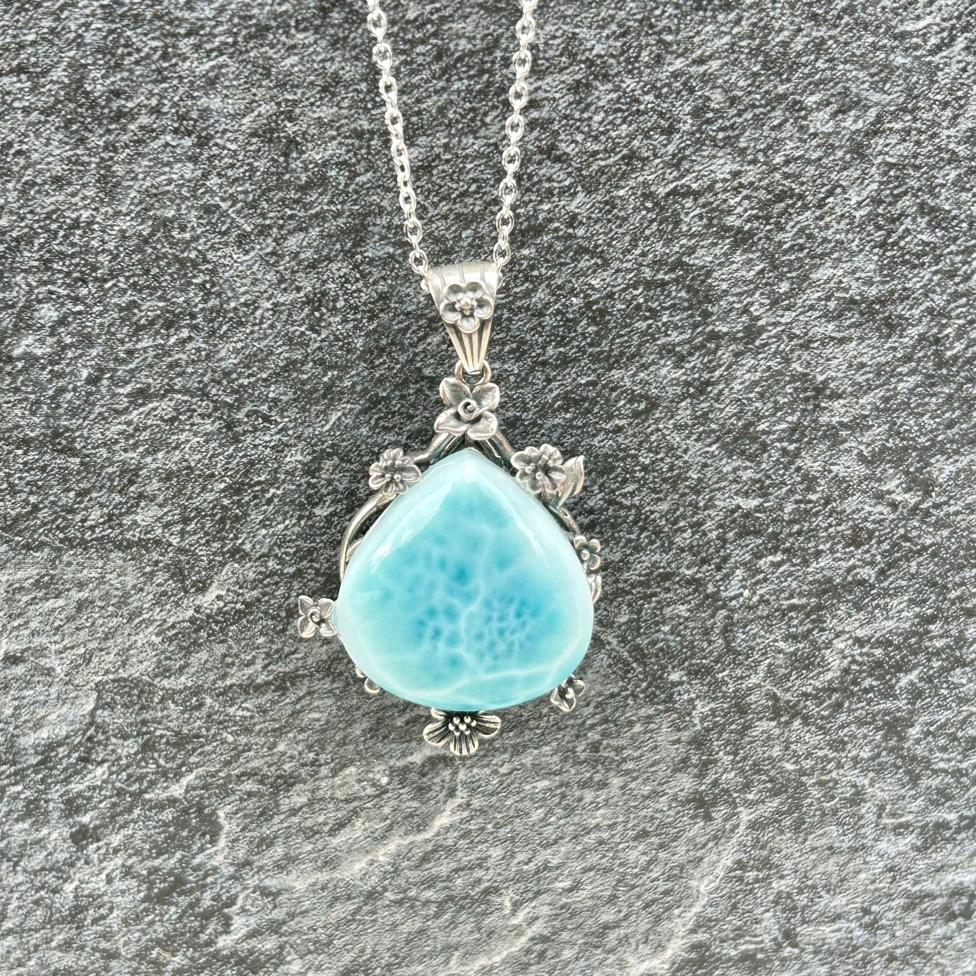 This high-grade Blue Larimar pendant, set in sterling silver 925, showcases exceptional clarity and vibrant oceanic hues. Valued for its calming and restorative properties, Blue Larimar supports emotional healing and clear communication. The sterling silver setting enhances durability while offering a polished, sophisticated look, perfect for those who appreciate both craftsmanship and spiritual balance. Ideal for everyday wear or special occasions, it delivers refined elegance with meaningful energy.