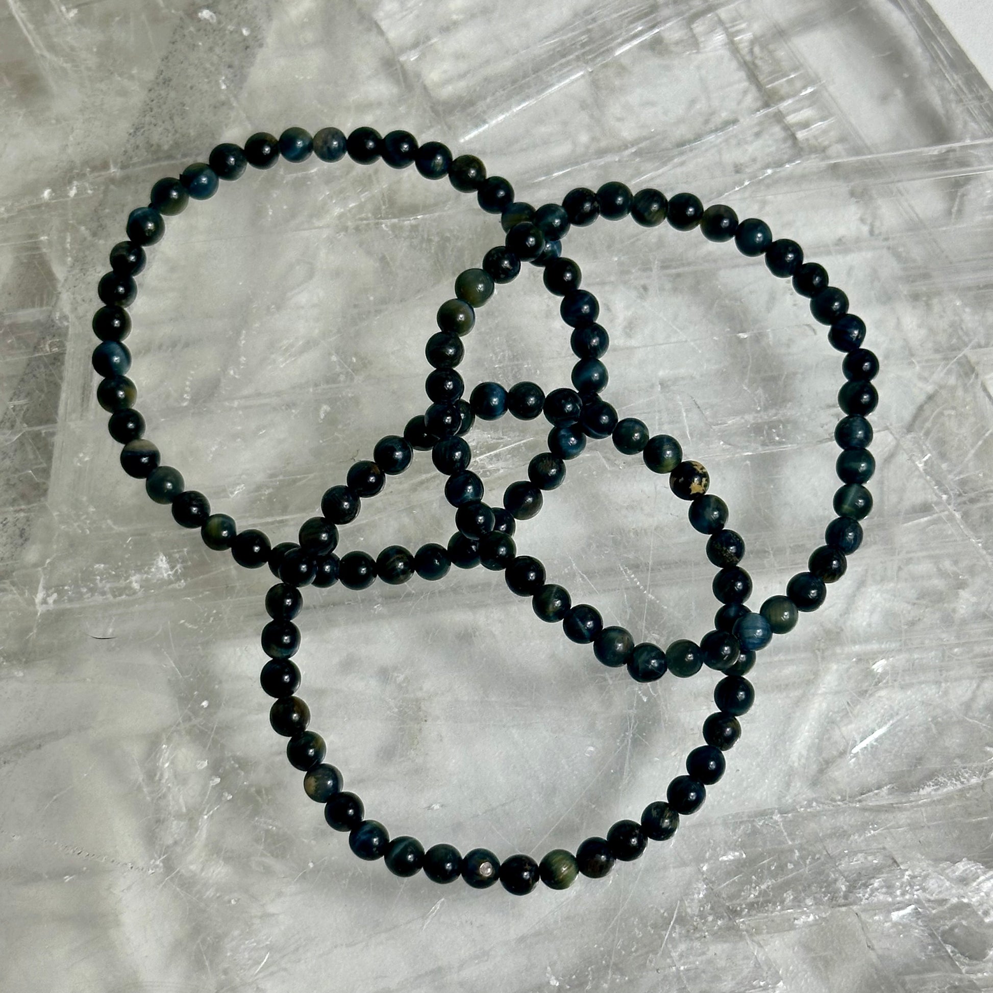 Blue Tiger's Eye harnesses the calming energy of the ocean, traditionally believed to enhance clarity, communication, and inner peace. These 4mm beaded bracelets feature polished natural stone with distinctive striped patterns in shades of blue and grey. Each bead is carefully selected for quality and consistency, creating a wearable piece that complements both casual and spiritual practices. Ideal for meditation, energy work, or everyday wear, this bracelet serves as a gentle reminder to stay grounded and centred throughout your day.