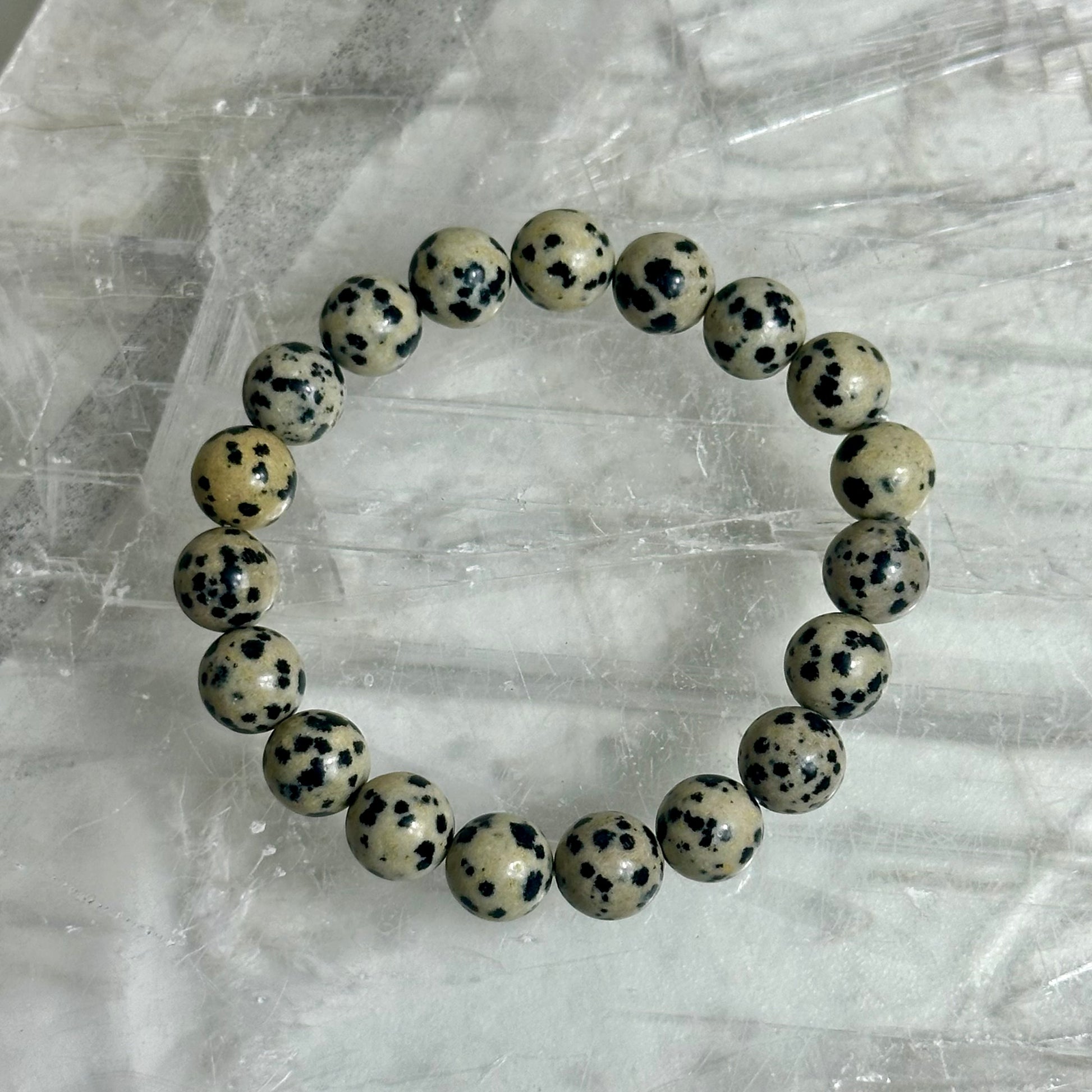 Dalmatian Jasper 10mm bracelets combine striking natural beauty with grounding energy. Each bead showcases the stone's distinctive black and white spotted pattern, a result of iron oxide inclusions within cream-coloured jasper. Traditionally valued for promoting playfulness and joy, Dalmatian Jasper is believed to enhance loyalty and protect against negativity. The 10mm bead size offers a balanced, wearable aesthetic suitable for both everyday wear and intentional practice. These bracelets make thoughtful gifts for crystal enthusiasts and those seeking a touch of natural elegance with purpose.