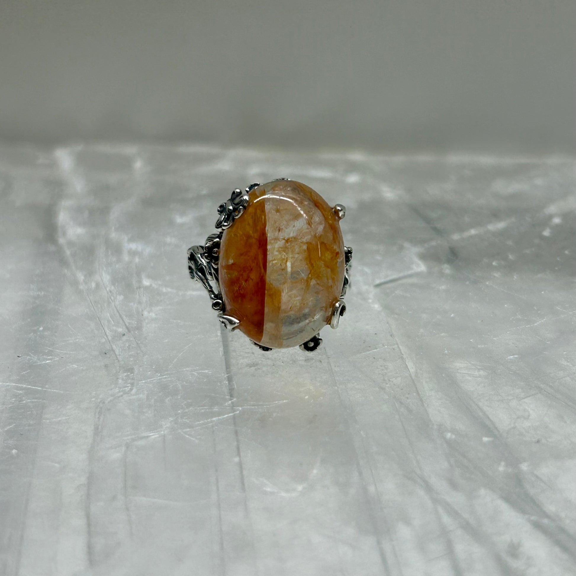 The Fire Quartz Adjustable Ring features a unique design that allows for size customization. Fire quartz is known for its energetic properties, potentially enhancing creativity and vitality. The adjustable band ensures a comfortable fit for various finger sizes, making it accessible to a wider audience.