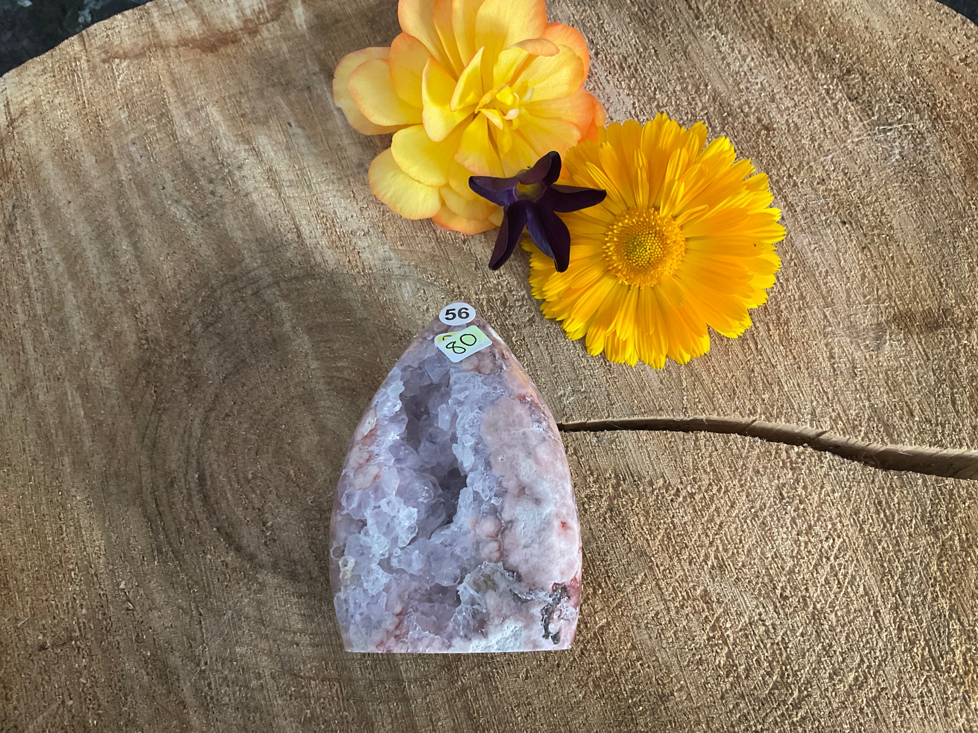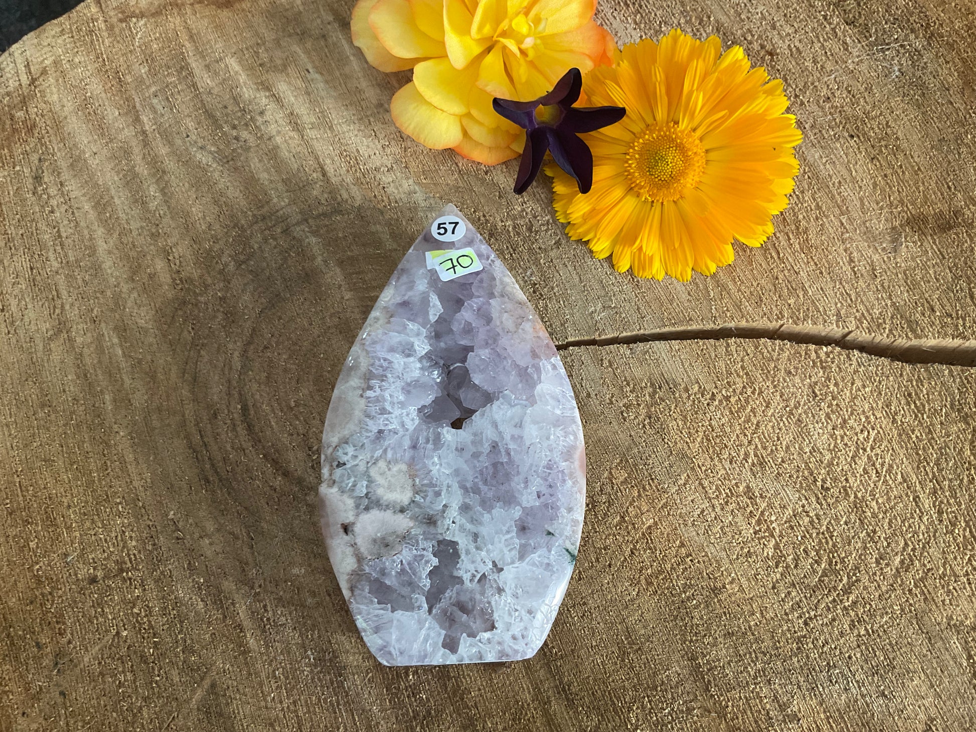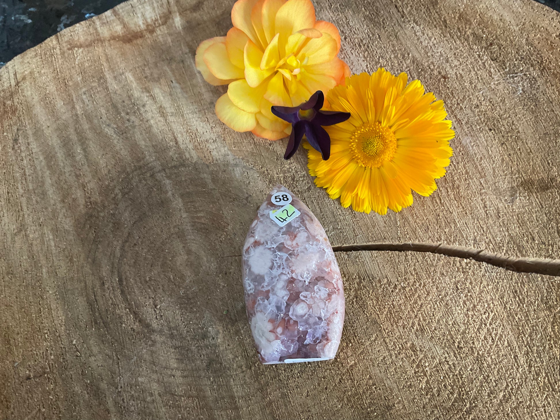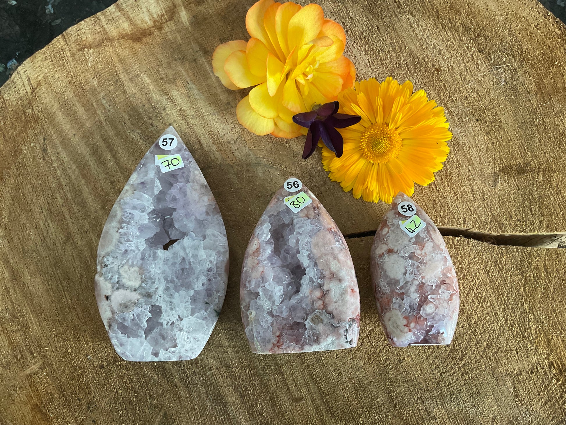 These Flower Agate & Pink Amethyst Flames are a stunning addition to any crystal collection. The unique combination of Flower Agate and Pink Amethyst provides both the calming energy of the flower and the spiritual properties of Amethyst. Experience the balance and harmony these beautiful flames bring into your space.