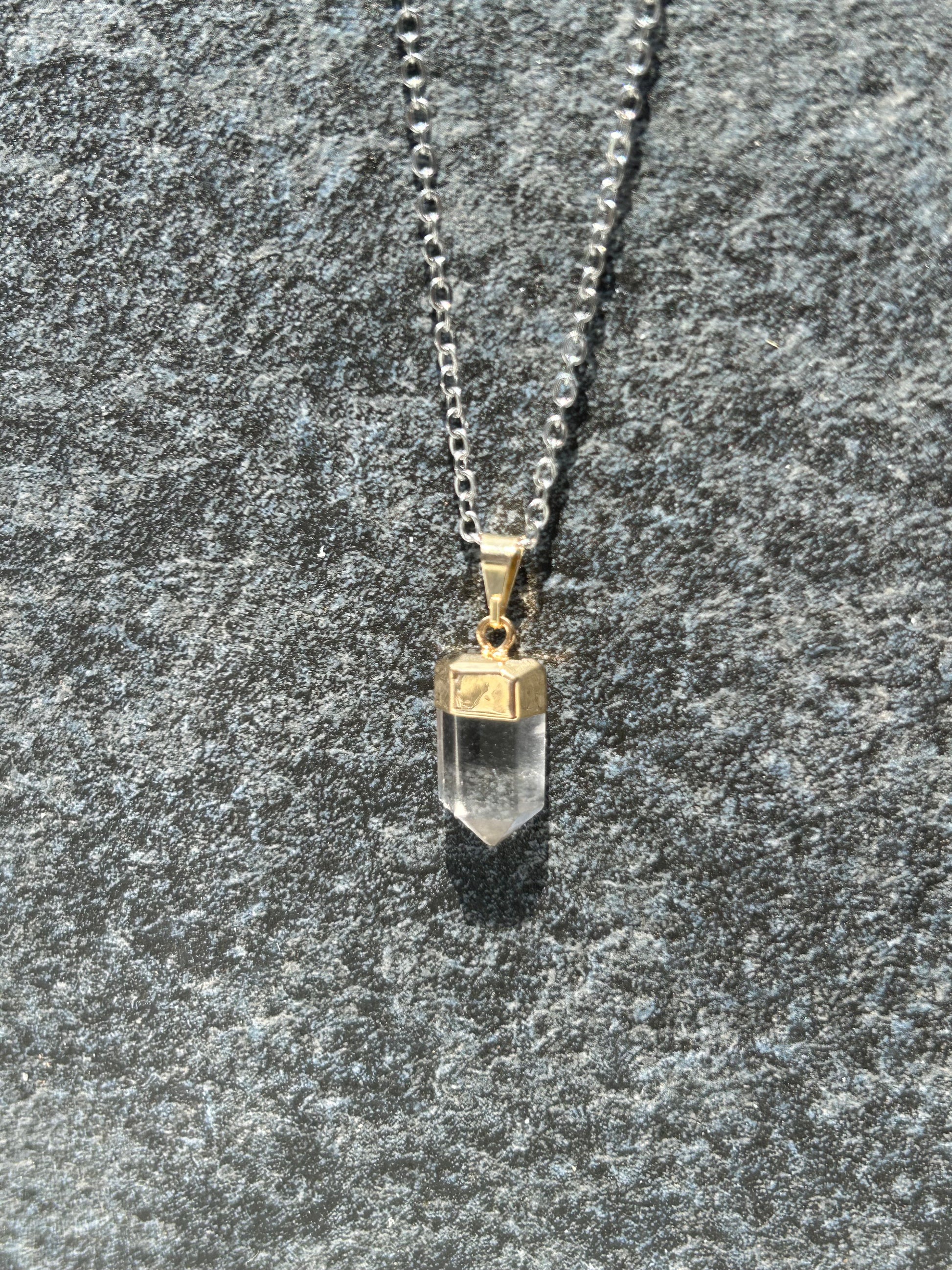 This Gold Plated Quartz Point Pendant features a natural quartz crystal elegantly coated in gold plating, combining durability with refined aesthetics. Its pointed design is ideal for focusing energy, making it a sophisticated accessory for those who appreciate both style and the metaphysical properties of quartz. Perfect for layering or wearing solo, this pendant offers a subtle yet powerful statement piece for everyday wear.
