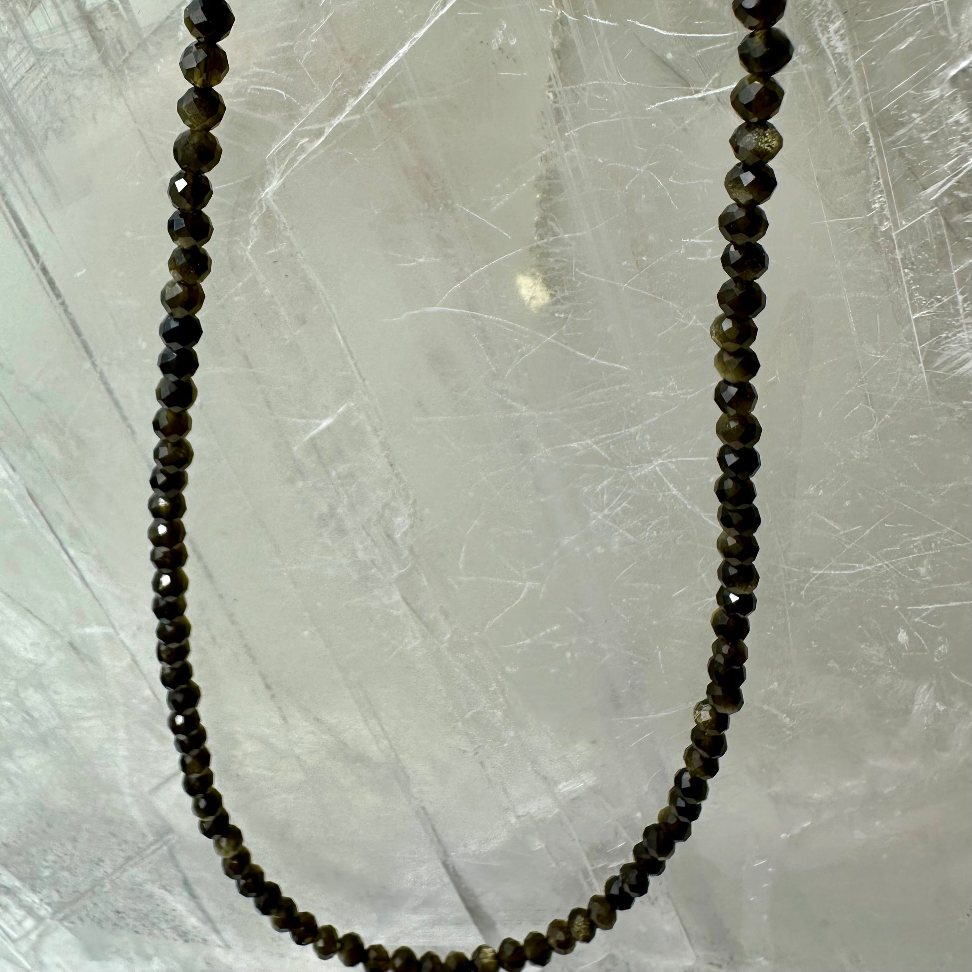 Gold Sheen Obsidian Beaded Necklace This elegant necklace features 4mm gold sheen obsidian beads strung along a 39cm strand, weighing just 7g for effortless everyday wear. Gold sheen obsidian is traditionally valued for its grounding properties and is believed to promote emotional clarity and inner strength. The lustrous golden shimmer across the deep black stone creates a sophisticated aesthetic suitable for both casual and formal occasions. A timeless piece that combines natural beauty with meaningful crystal energy.