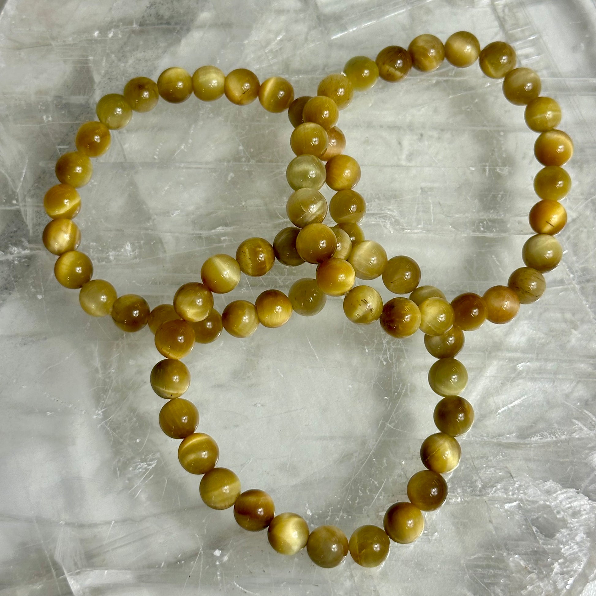 Golden Tiger's Eye beads radiate warmth and protective energy in this classic 8mm bracelet. Prized for centuries, this golden-brown stone is believed to enhance courage, clarity, and grounding while promoting emotional balance. The smooth, polished beads showcase the stone's distinctive chatoyant bands—a mesmerizing optical effect that shifts with light. Perfect for daily wear or meditation practice, this bracelet combines natural beauty with timeless appeal. An ideal choice for those seeking both aesthetic elegance and spiritual support.