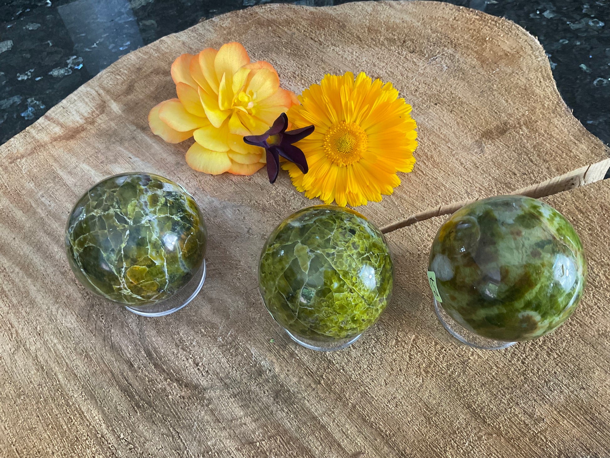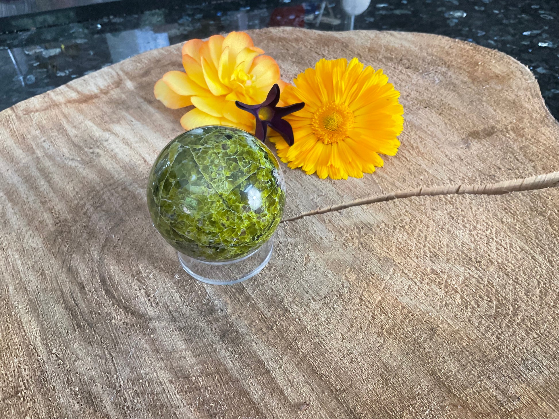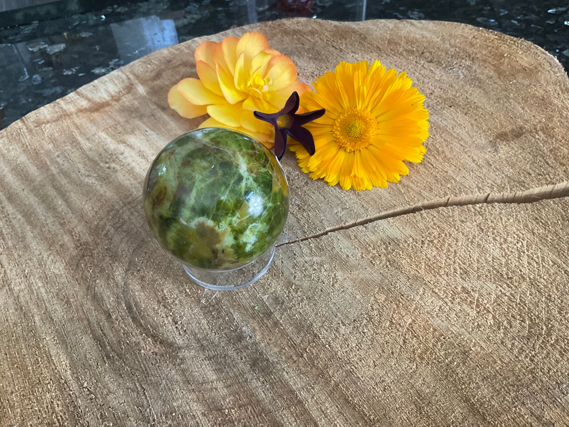Expertly crafted from green opal, this sphere offers a unique and natural addition to any crystal collection. With its soothing green color, this sphere is believed to promote emotional healing and provide a sense of calm. Add this beautiful sphere to your home or office for a touch of tranquility. Each Sphere is (200g)