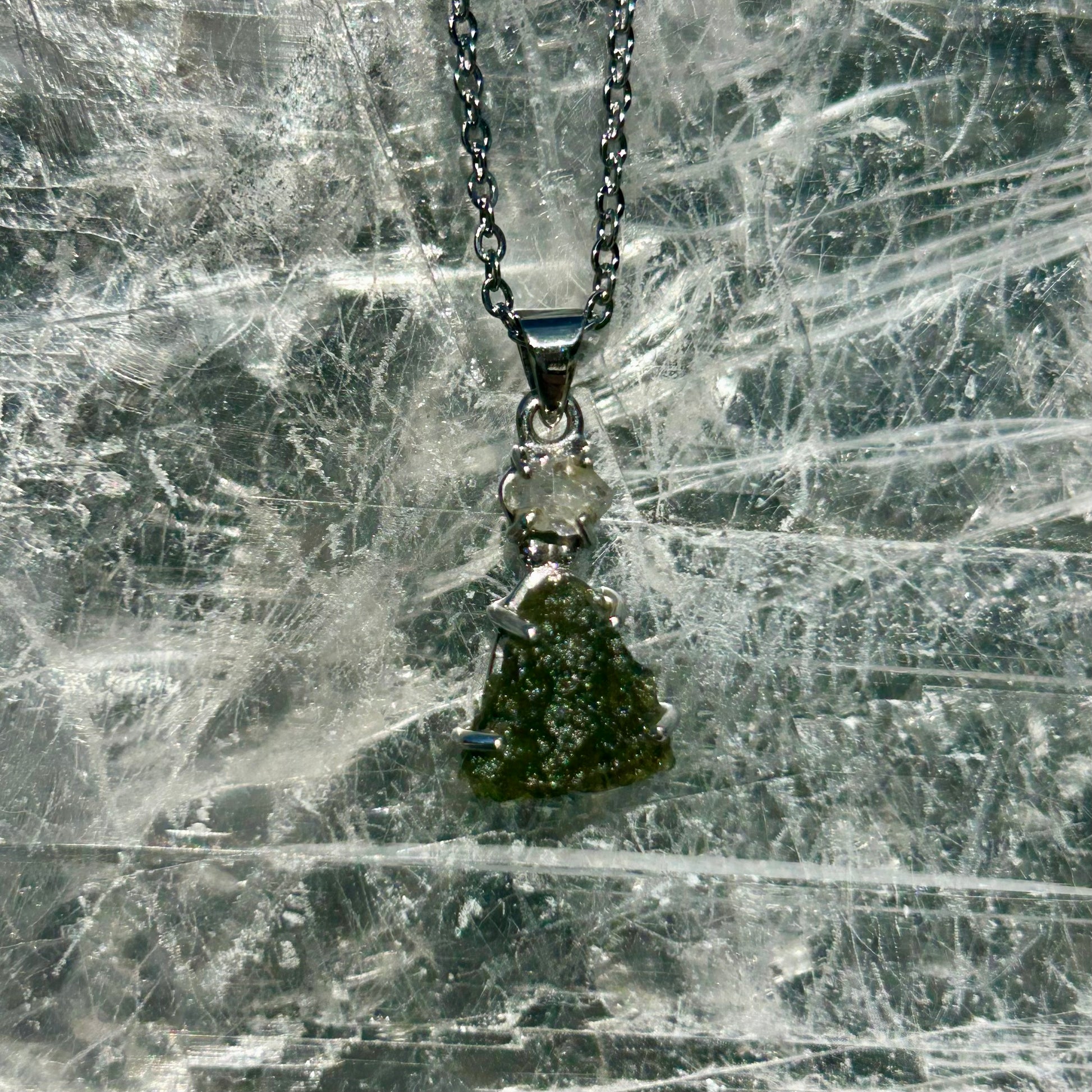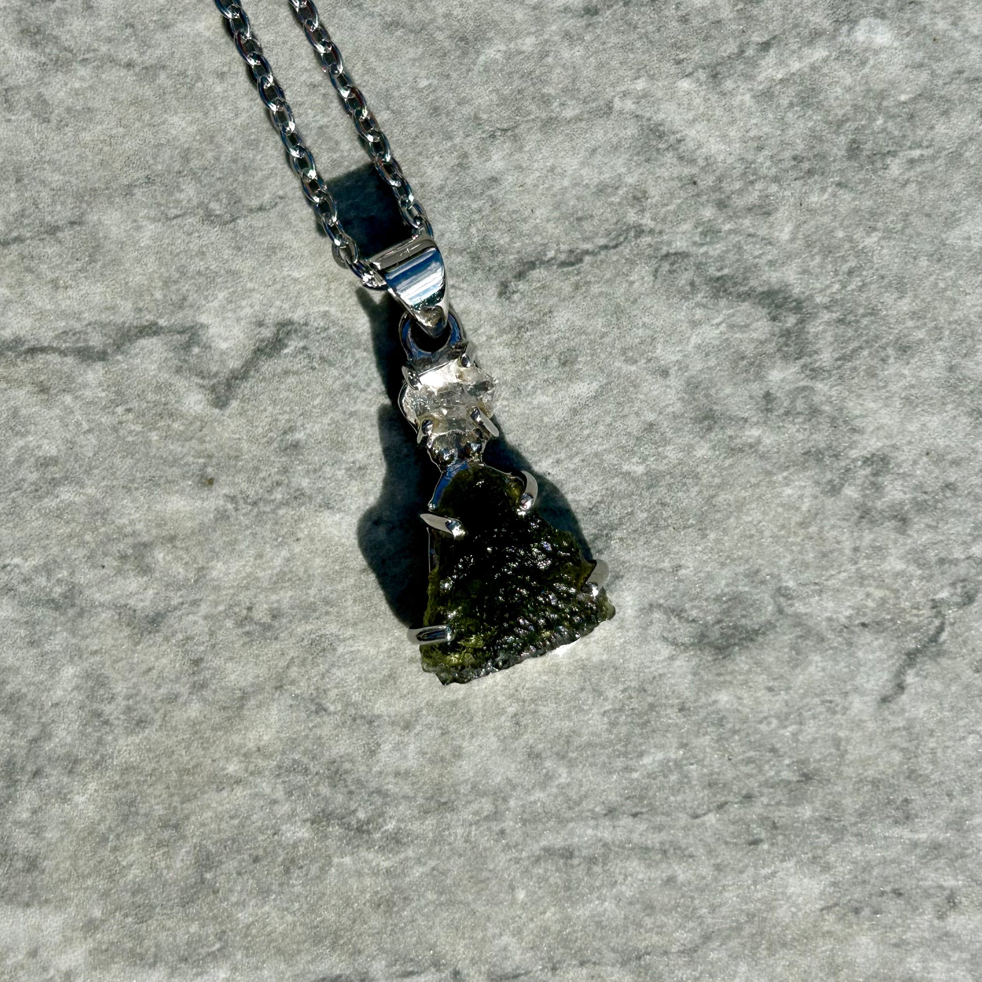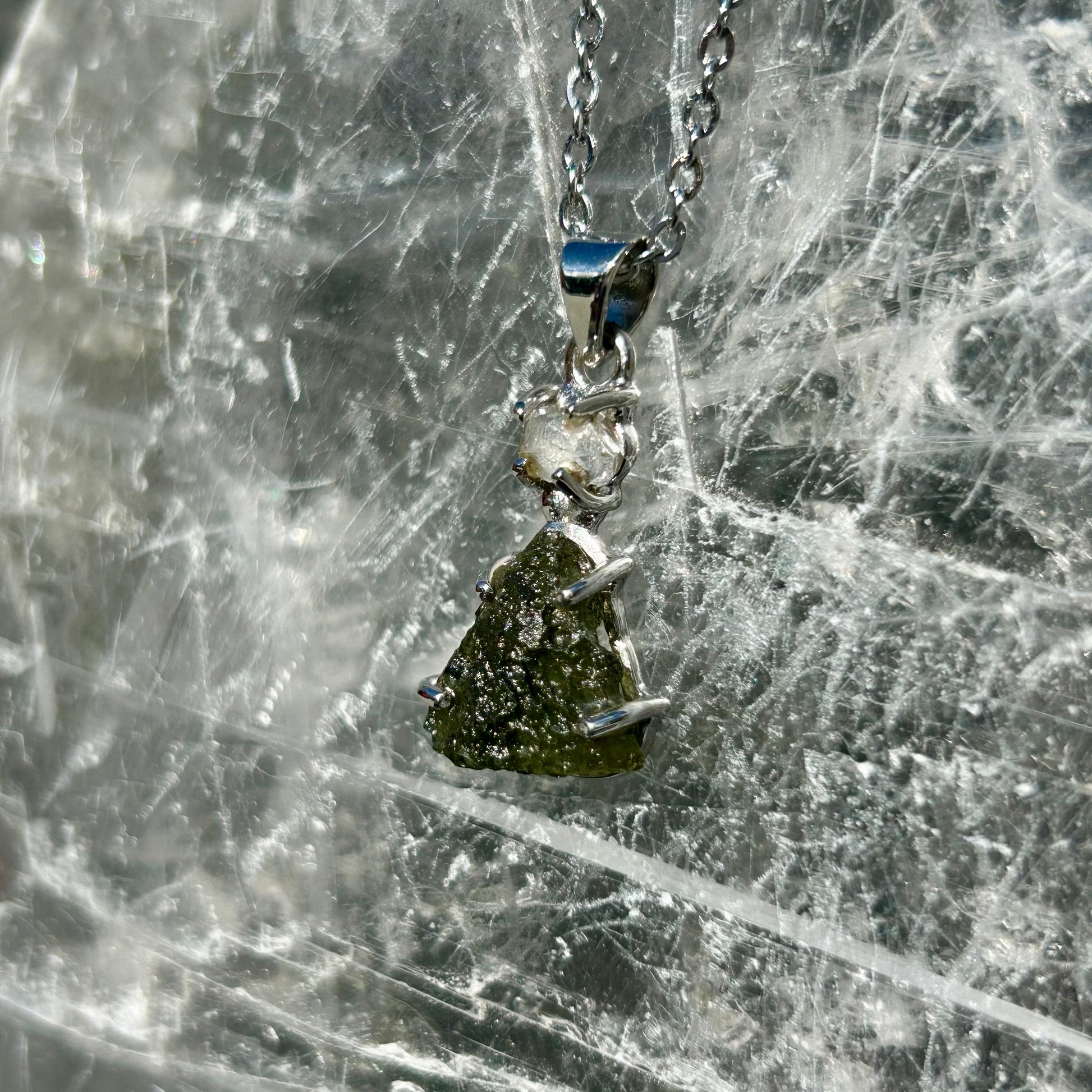 Experience the unique synergy of Herkimer diamond and Moldavite set in a high-grade 925 sterling silver pendant. Renowned for their clarity and powerful energetic properties, this pendant combines the amplifying vibration of Herkimer with the transformative qualities of Moldavite. Expertly crafted, it offers both aesthetic elegance and a meaningful spiritual accessory designed to support personal growth and clarity. Perfect for those seeking a refined, potent piece to enhance meditation, energy work, or everyday wear.
