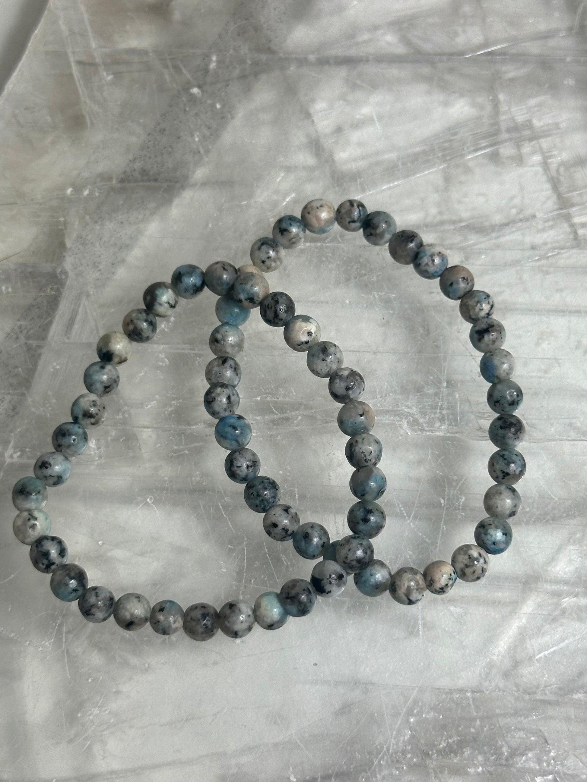 K2 stone, recognisable by its striking blue and white patterns, forms the foundation of these elegant 6mm bracelets. Each bead showcases the natural variation inherent to this granite-feldspar composite, making every piece genuinely unique. K2 is traditionally valued for its grounding properties and is believed to support emotional balance and clarity. The 6mm size offers a refined aesthetic suitable for both everyday wear and layering. These bracelets appeal to crystal enthusiasts, collectors, and those seeking meaningful jewellery with geological significance.