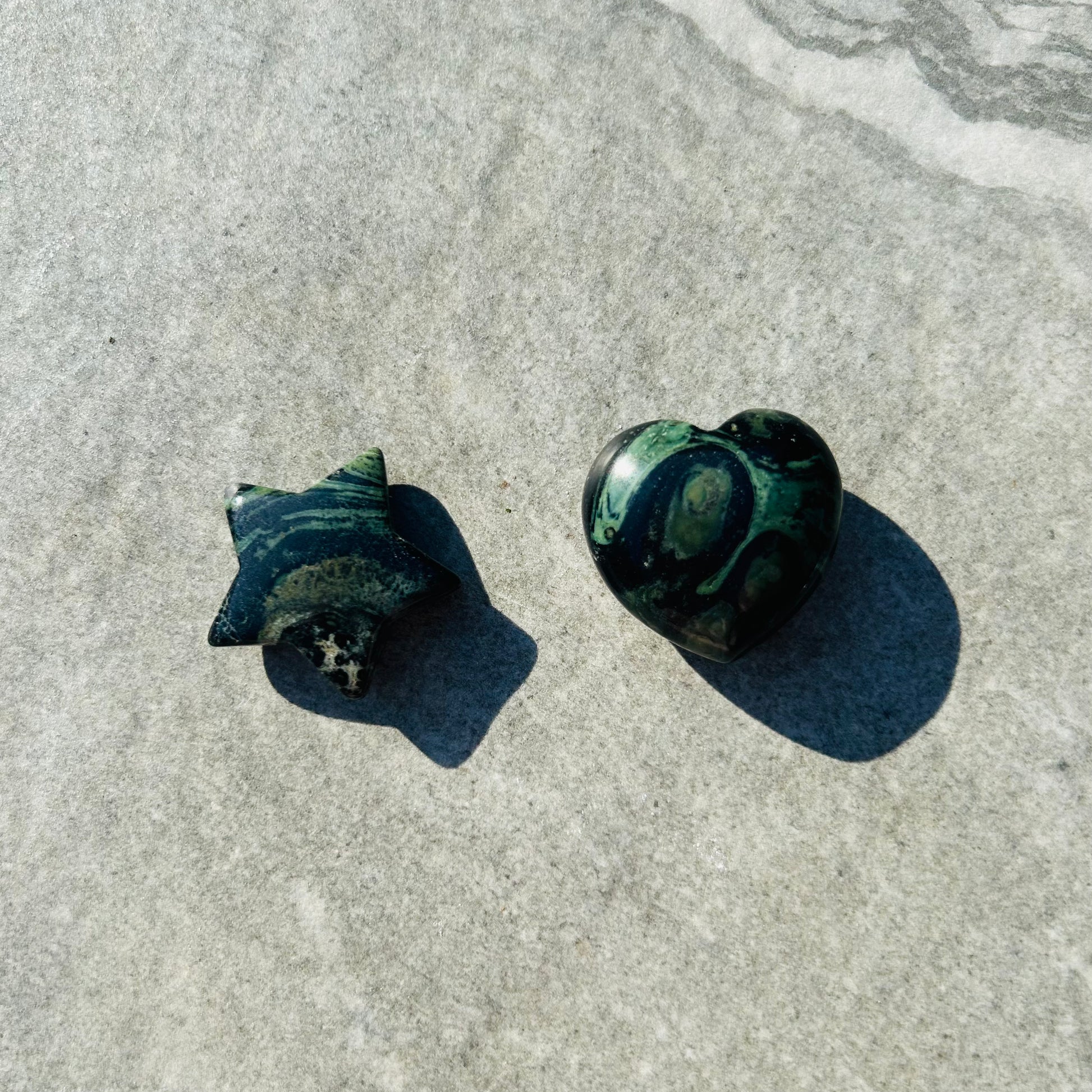 Discover the unique beauty and grounding energy of Kambaba Jasper with our Kambaba Jasper Star & Heart Tumbles. These naturally formed crystals provide strength and stability, promoting a sense of peace and tranquility. Add them to your collection for a touch of elegance and calmness.