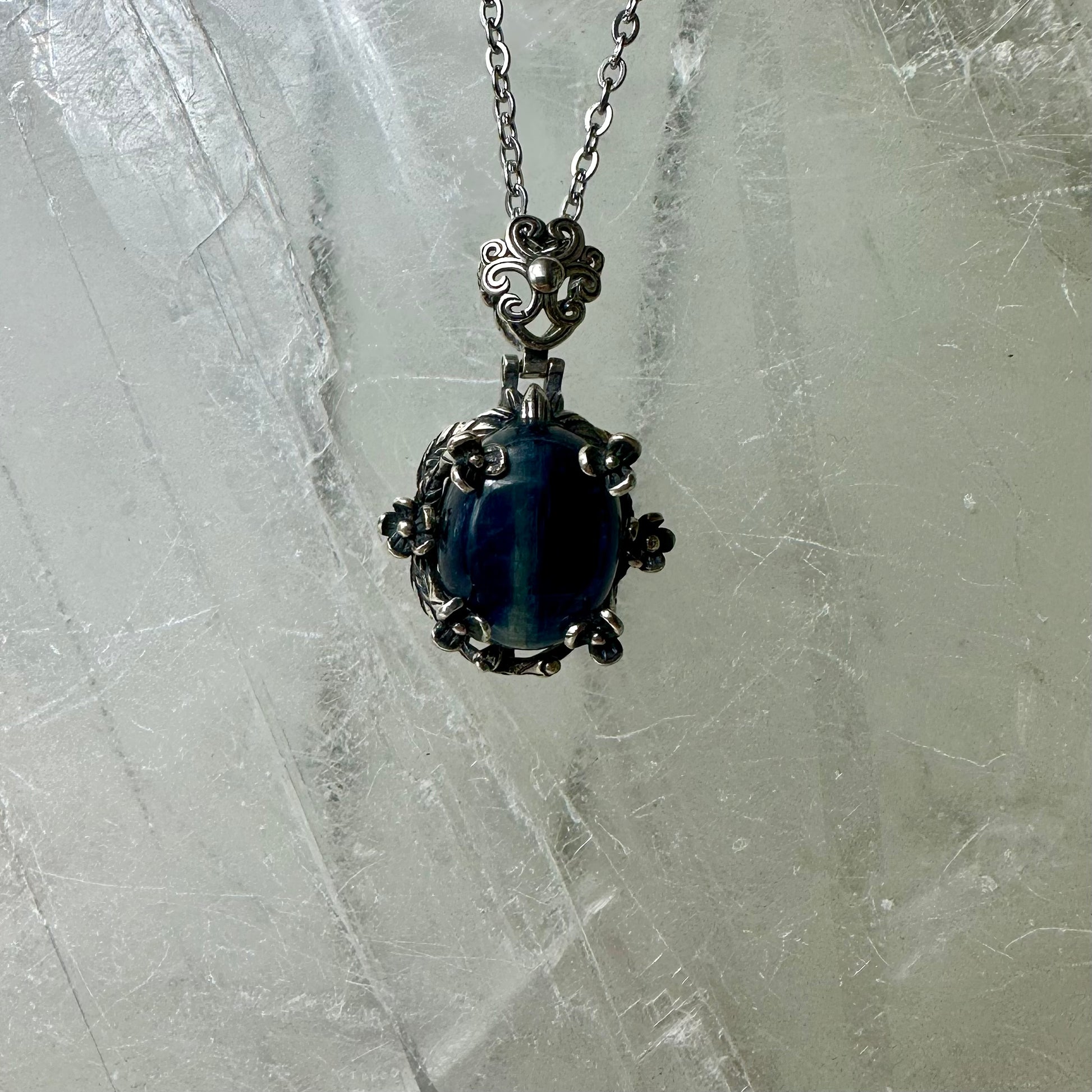 Kyanite is a powerful stone of communication and truth, known for its ability to align all chakras and promote inner peace. This striking pendant harnesses the crystal's natural energy to help you express yourself with clarity and confidence. Kyanite is believed to calm anxiety, enhance intuition, and support emotional balance. Wear this pendant as a reminder to speak your authentic truth and connect with your inner wisdom. A beautiful addition to any crystal collection for those seeking clarity, calm, and spiritual alignment.