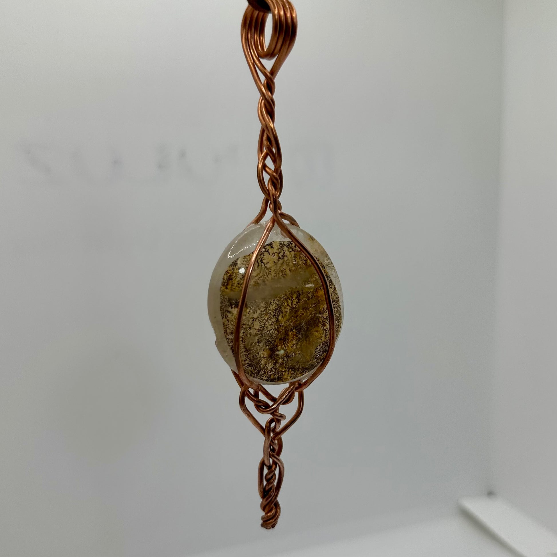 Expertly crafted by Lee's, the Dentrick Pendant boasts a stunning copper wrap and a sleek brown cord. Enhance any outfit with its elegant design and quality materials. Add a touch of sophistication to your look with this exquisite pendant.