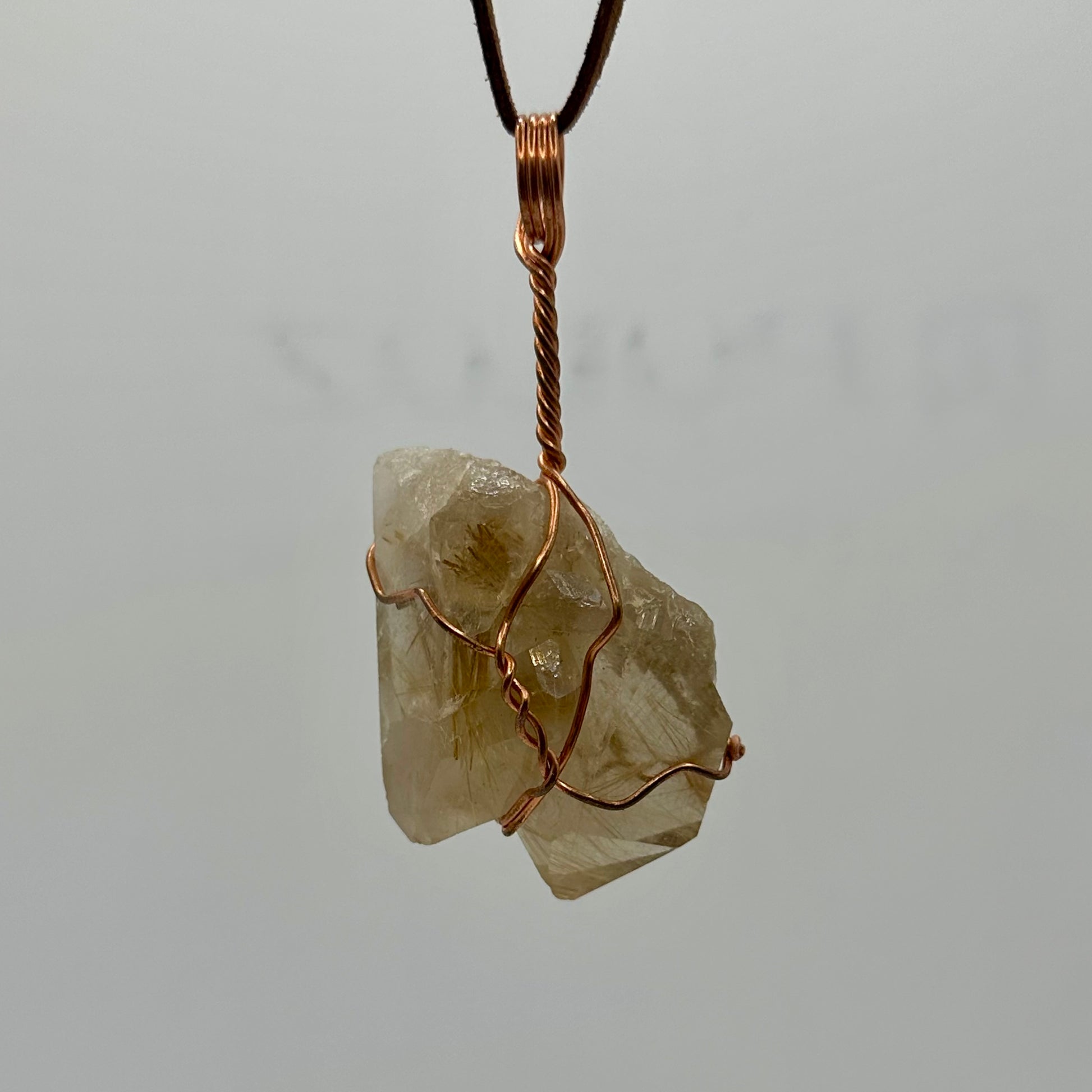 Expertly crafted by Lee's Makes, this Golden Rutile Pendant is a stunning addition to any jewelry collection. Expertly wrapped in copper and hung on a durable brown cord, this pendant showcases the natural beauty and unique patterns of golden rutile stones. Add a touch of elegance to any outfit with this one-of-a-kind piece.