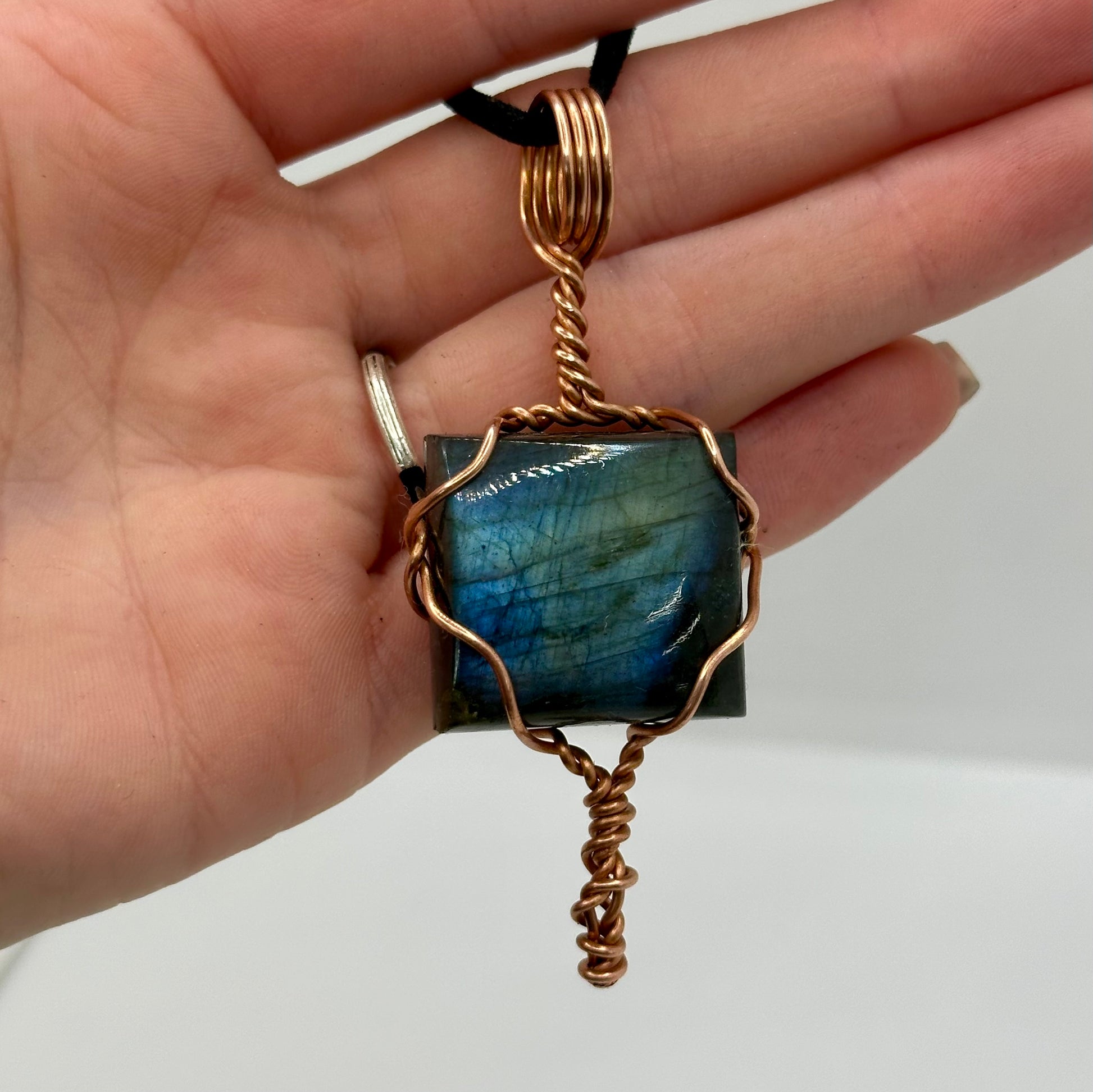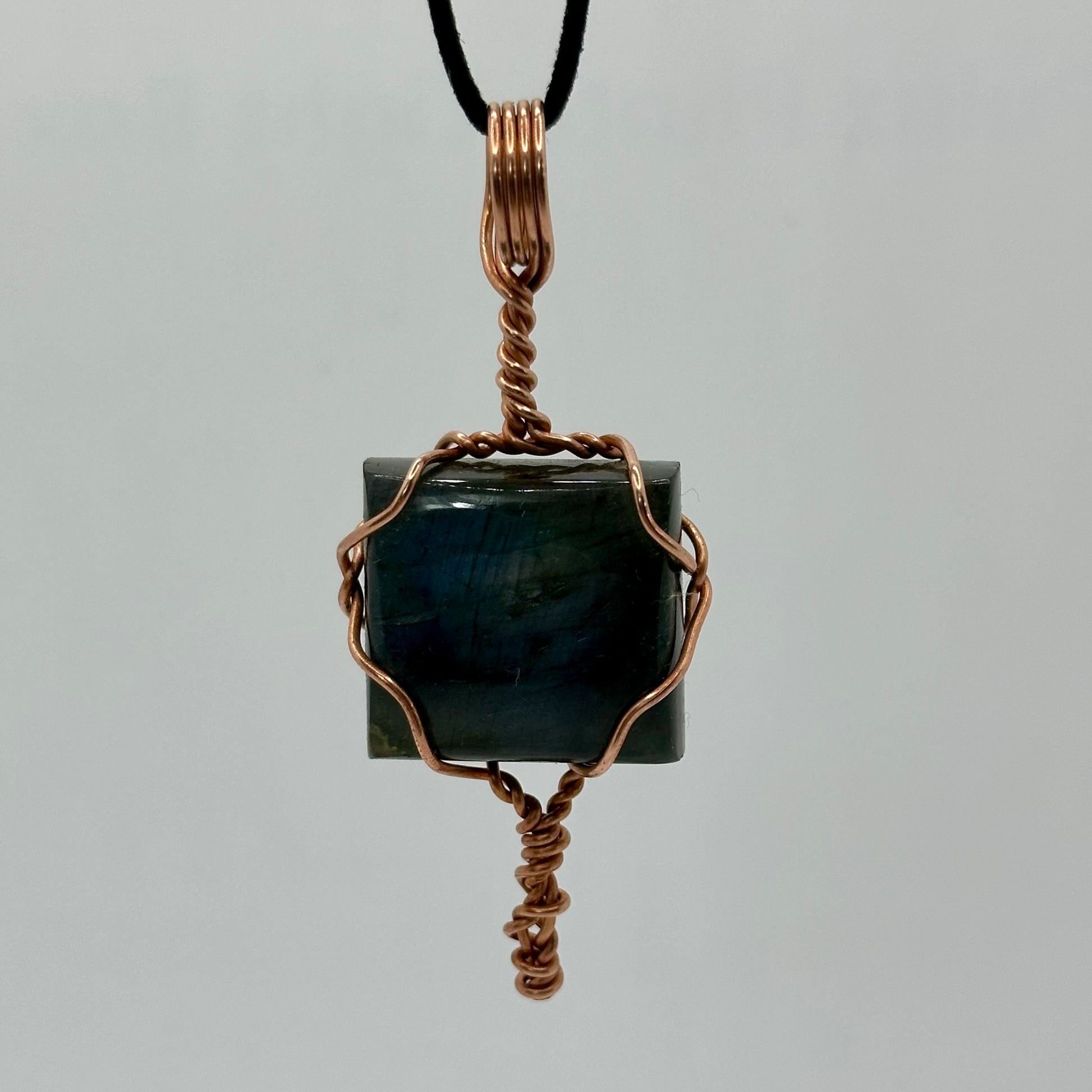 This exquisite Labradorite Pendant, handcrafted by Lee's Makes, features a stunning labradorite gemstone suspended from a sleek black cord. The unique iridescence of the labradorite stone provides a touch of elegance and mystique to any outfit. Add this piece to your collection for a touch of natural beauty.