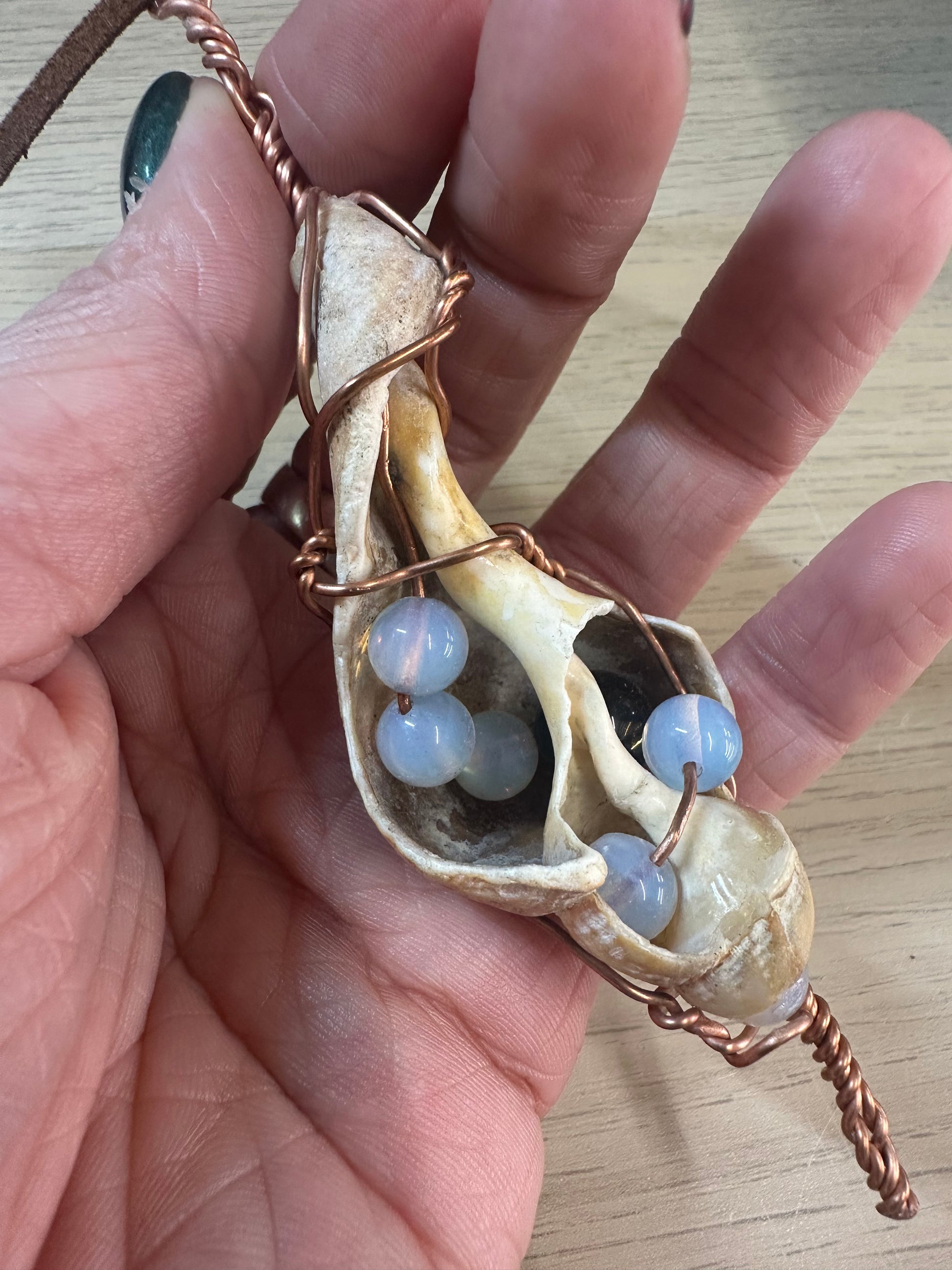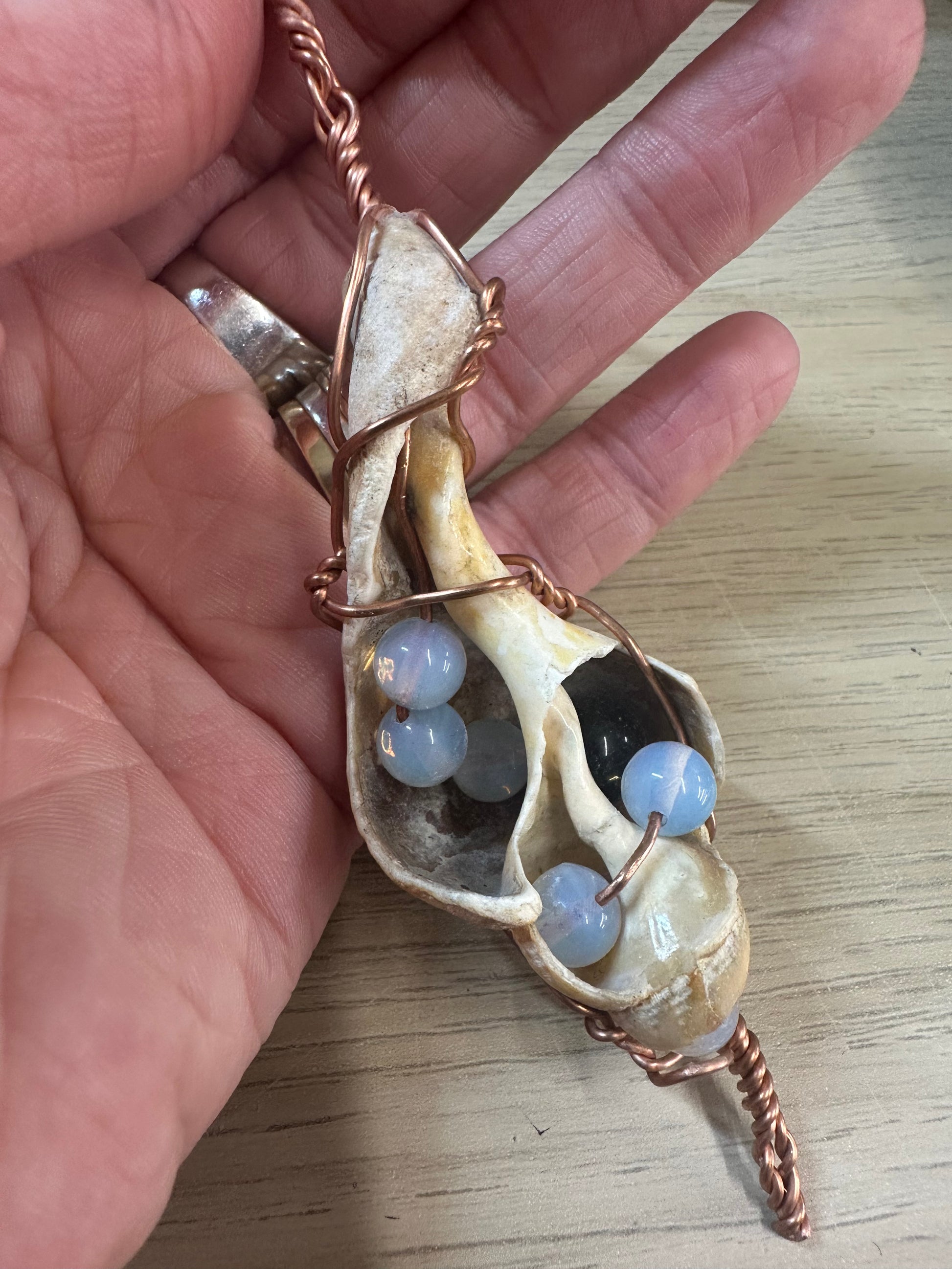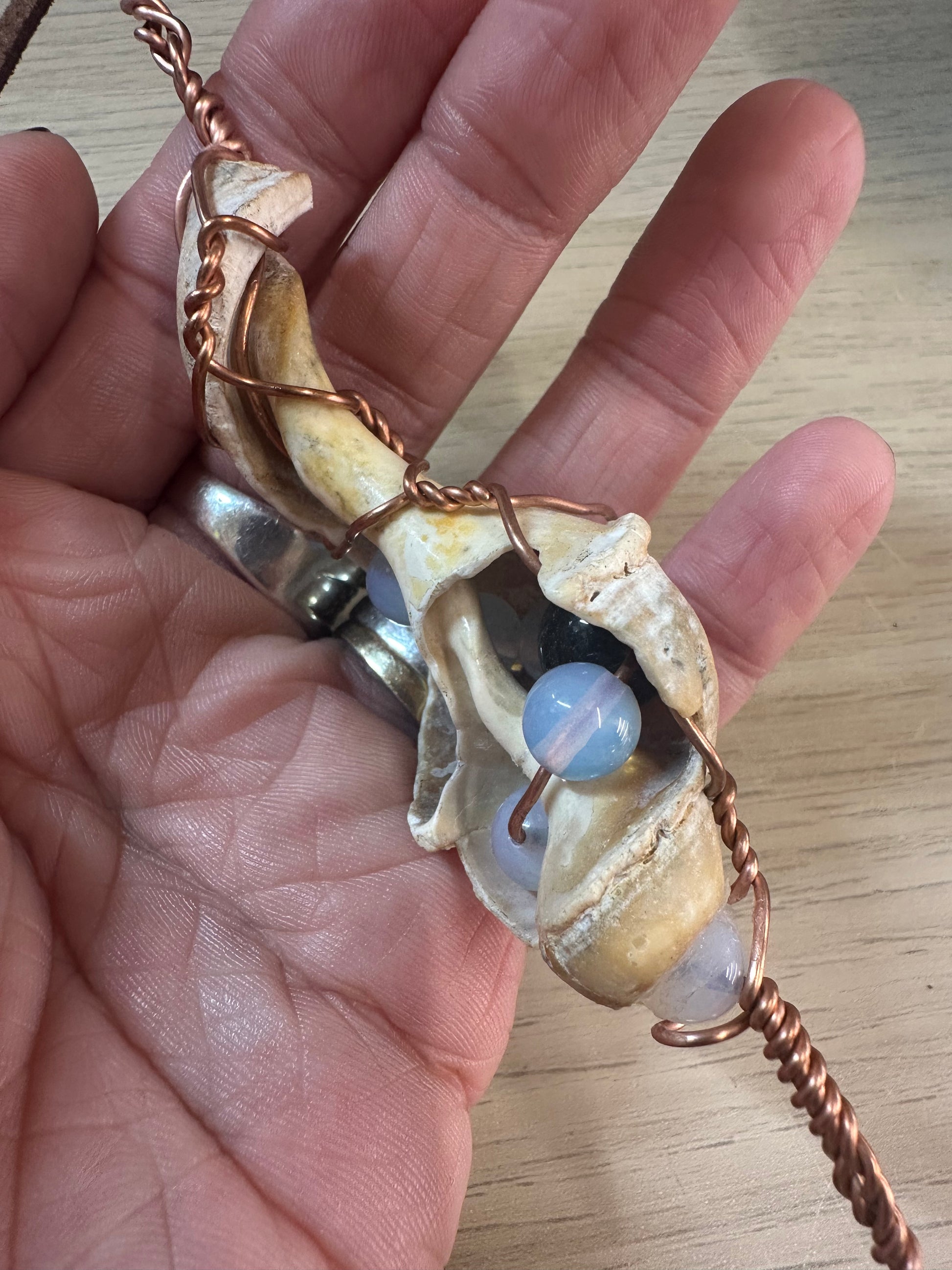 This Lee's Makes pendant features a unique combination of shell and opalite, creating a stunning and eye-catching accessory. The natural shell adds a touch of organic beauty while the opalite shimmers and shines, making this pendant a must-have statement piece. Elevate your style with this one-of-a-kind pendant.