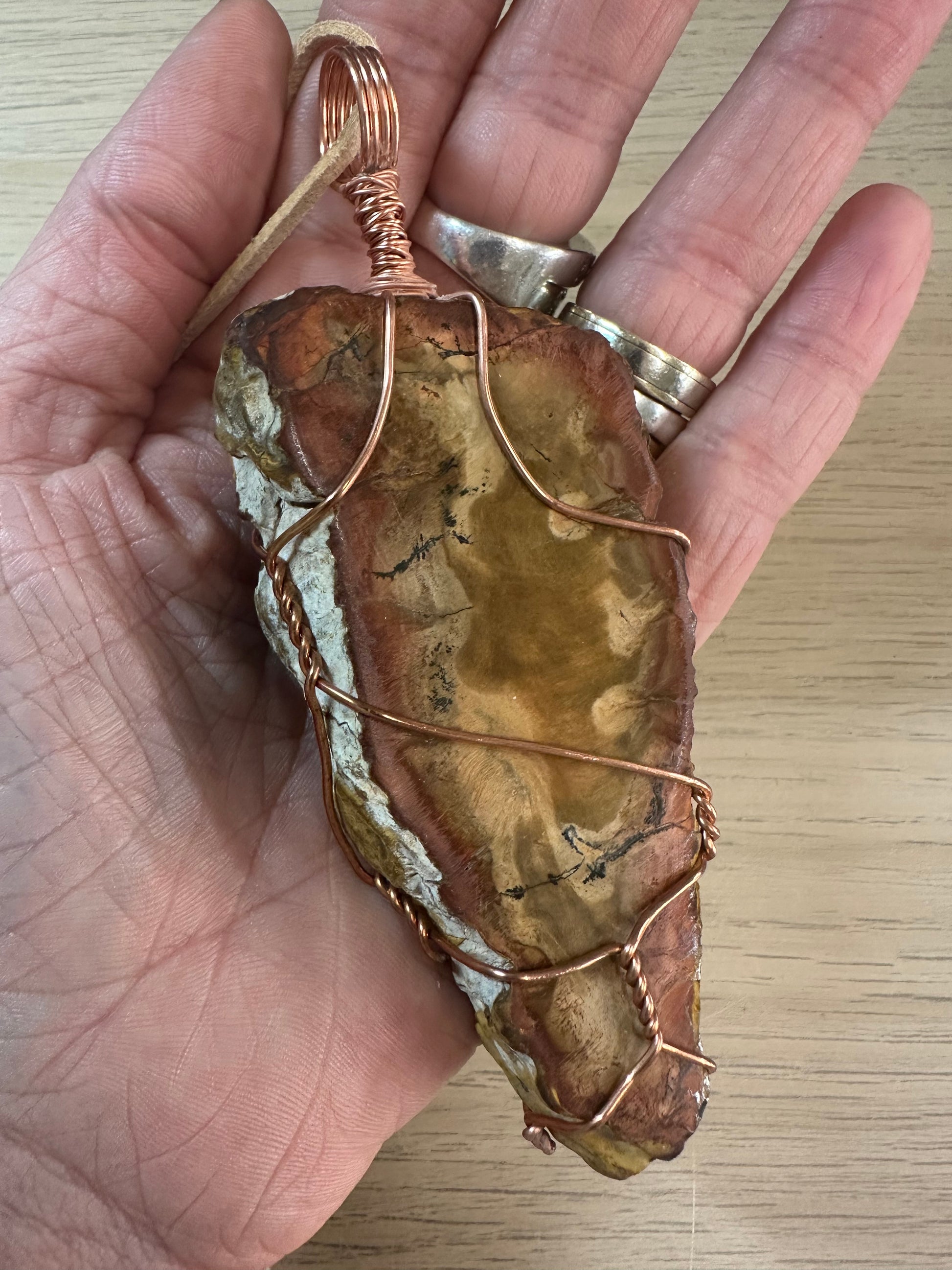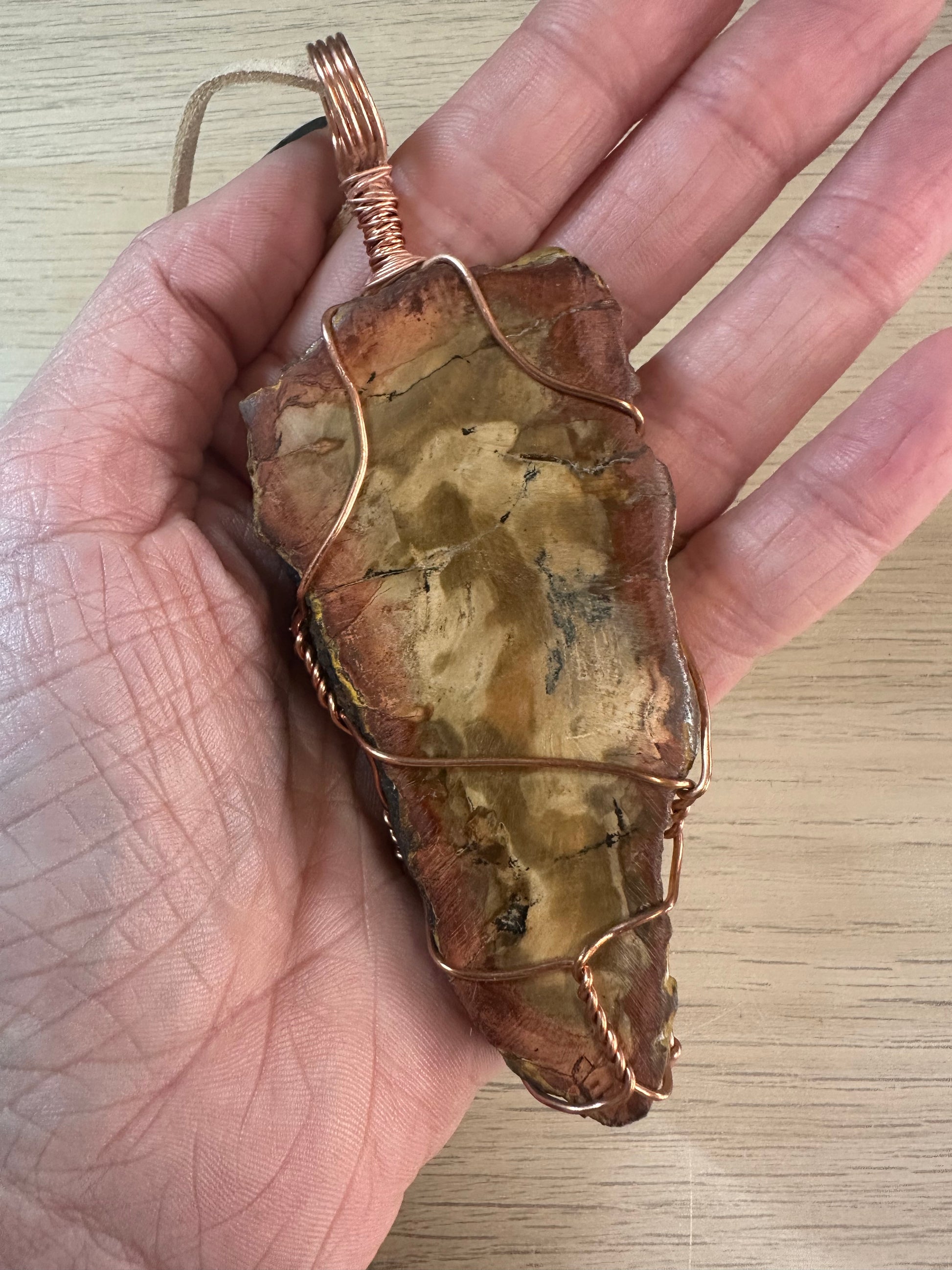 This pendant by Lee's Makes features a unique and rare fossilized wood design. Handcrafted with precision and expertise, this pendant adds a touch of elegance to any outfit. Show off your appreciation for natural history and style with this one-of-a-kind piece.