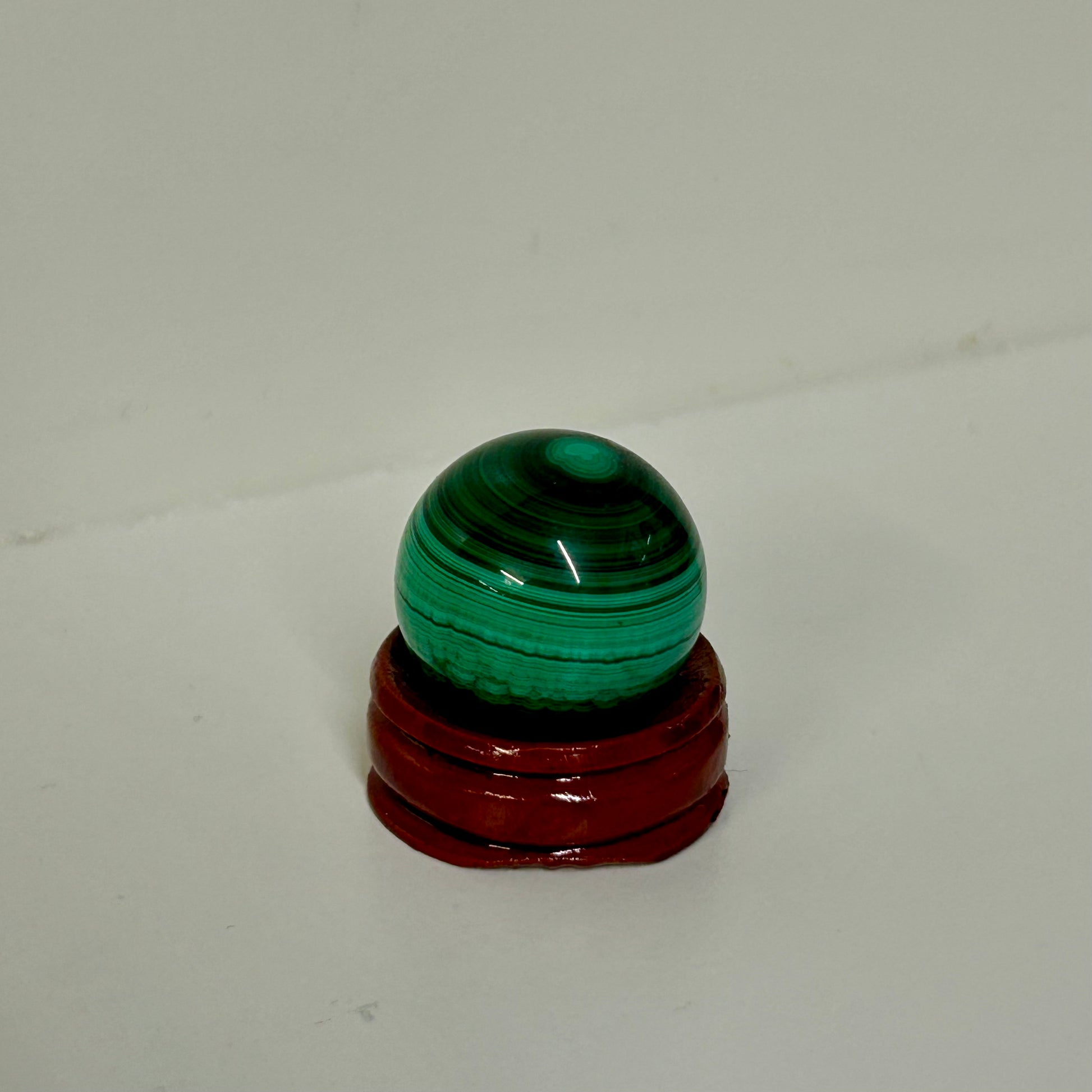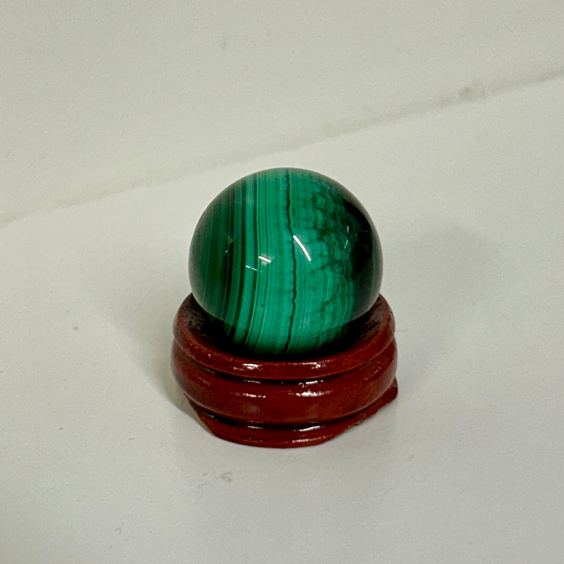Malachite Sphere Malachite is a striking copper carbonate mineral renowned for its distinctive banded green patterns and polished lustre. This natural sphere showcases the stone's characteristic layered formations, each piece displaying unique swirls and colour variations ranging from pale to deep forest green. Traditionally valued in crystal practices for its association with transformation and emotional balance, malachite has been treasured across cultures for centuries. The spherical form makes it an elegant display piece for shelves, desks, or meditation spaces, whilst its smooth surface invites tactile appreciation. Each sphere is a natural product, meaning variations in size, pattern intensity, and colouration are inherent to its formation. Ideal for collectors, practitioners, or those seeking a sophisticated natural accent for their home.