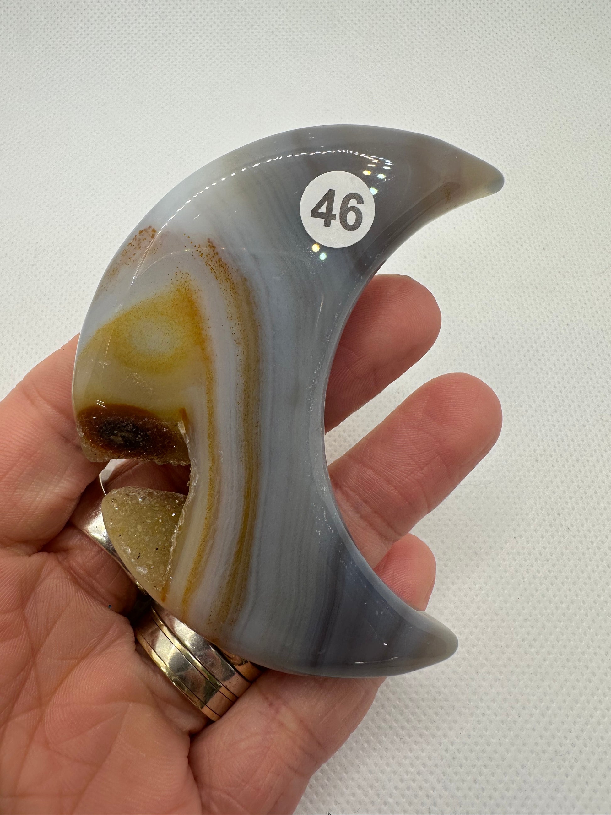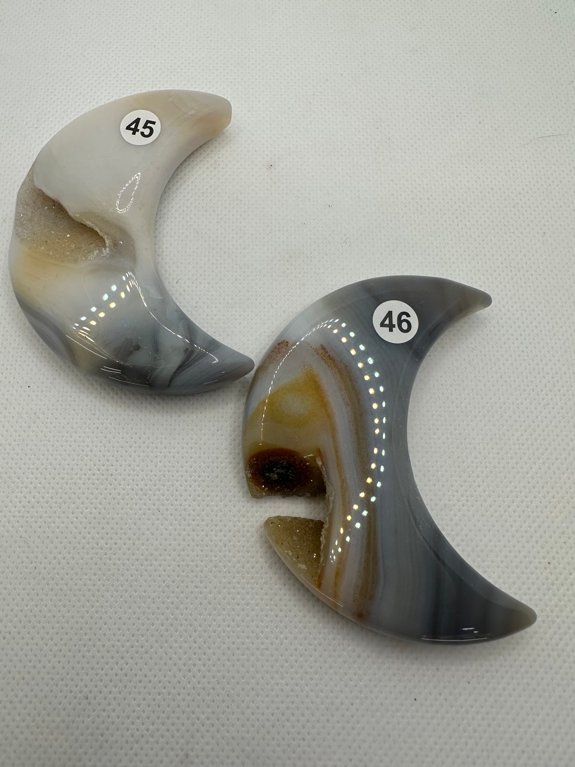 Experience the beauty of Agate Moons. Our premium quality Agate Moon features unique natural patterns, making each piece one-of-a-kind. With its soothing and grounding energy, it's perfect for enhancing balance and promoting inner strength. Add a touch of elegance to your collection with Agate Moons!