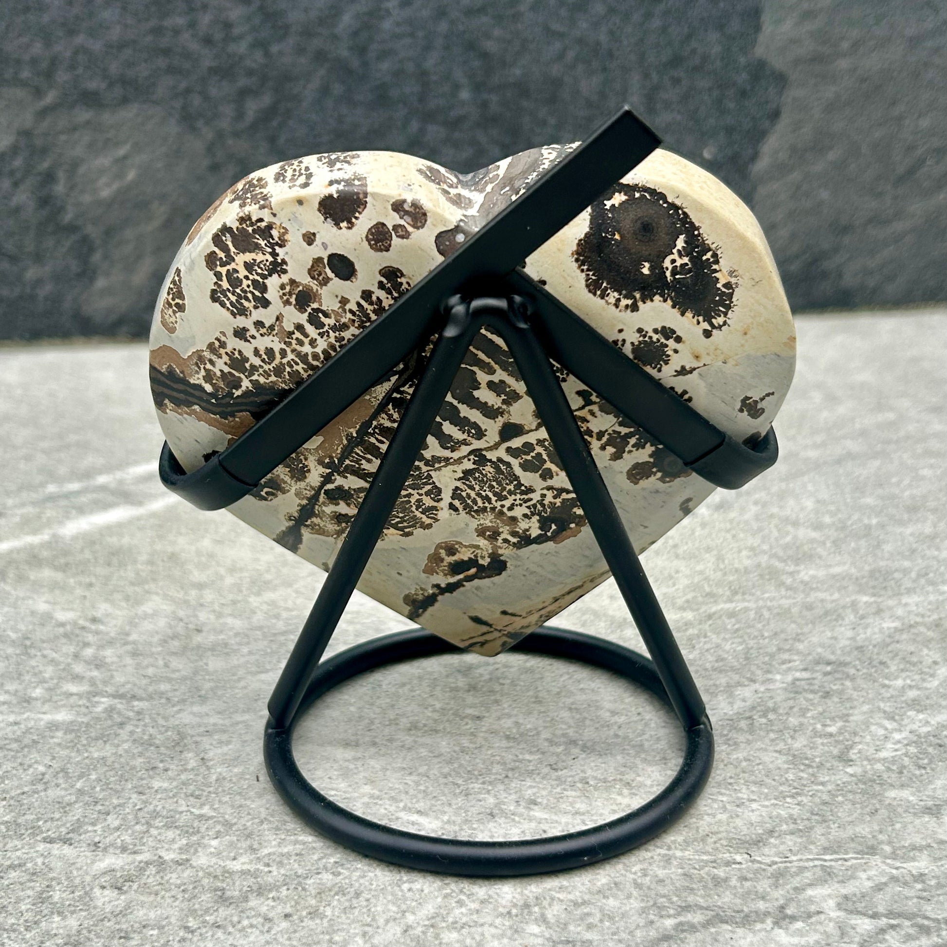 This Picture Jasper Heart on Stand showcases the natural beauty of picture jasper, known for its intricate earth-toned patterns. Perfectly polished and mounted on a sturdy stand, it makes a striking decorative piece or a meaningful gift. Its smooth, heart-shaped form invites calming energy and grounding, making it ideal for display in any space seeking a touch of natural harmony and expert craftsmanship.