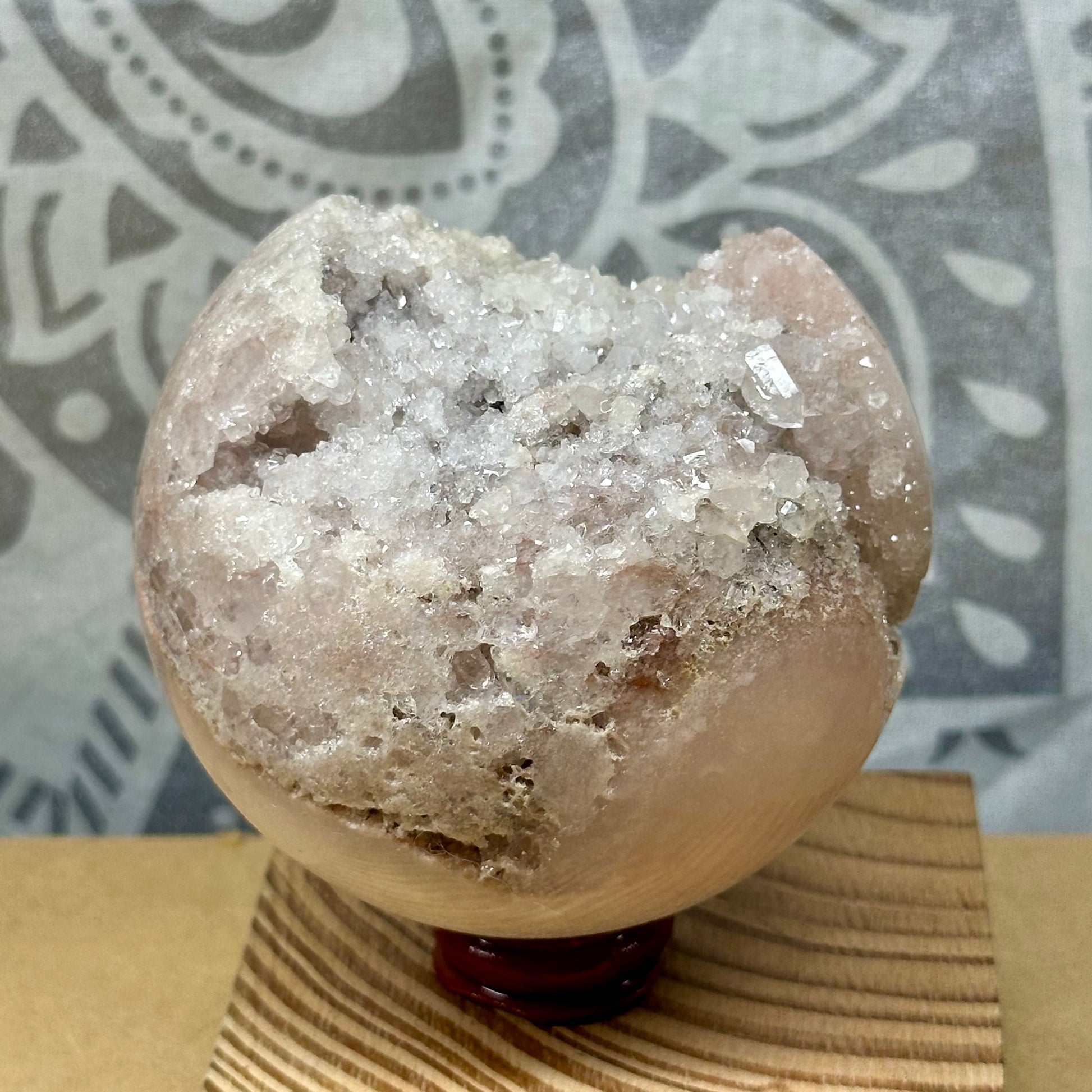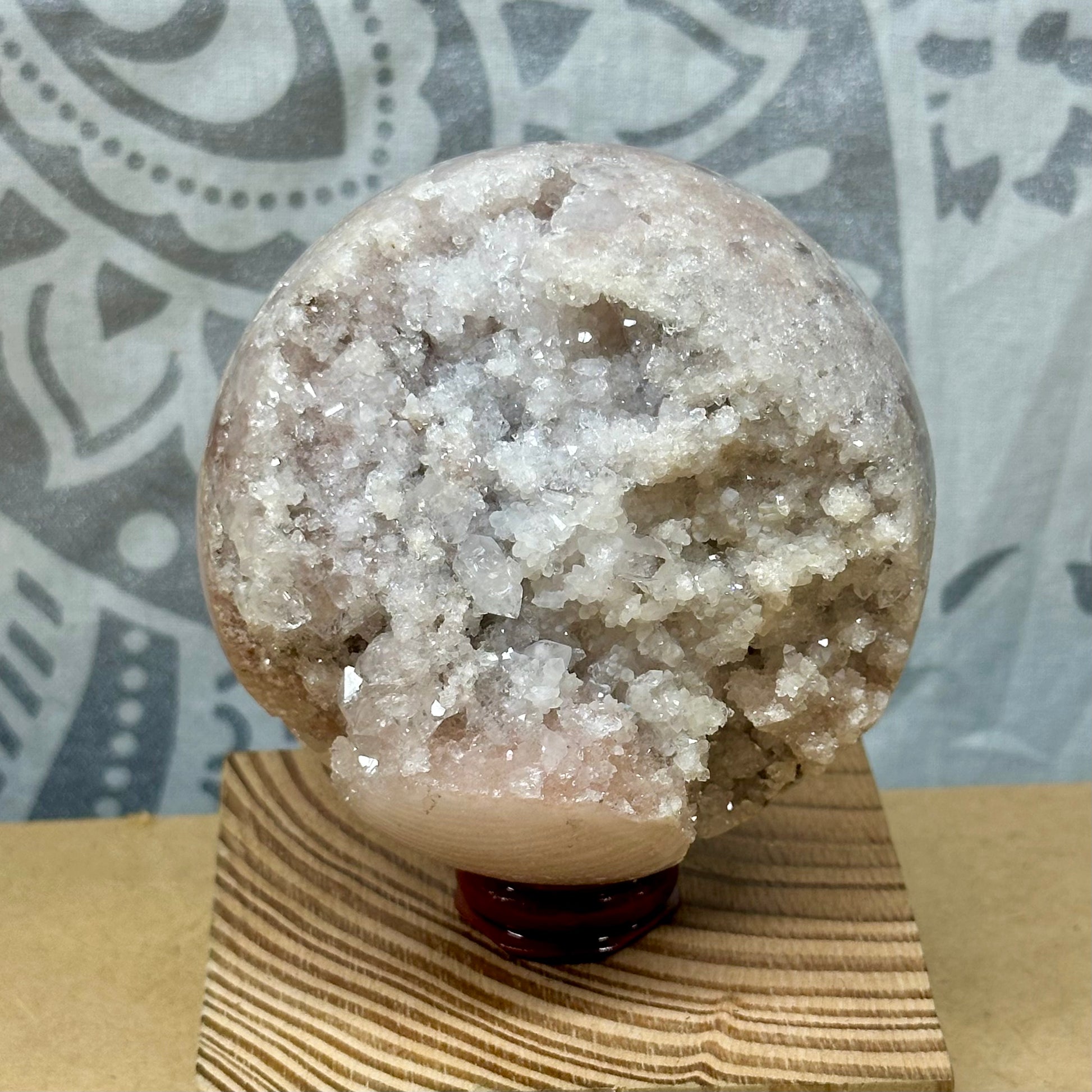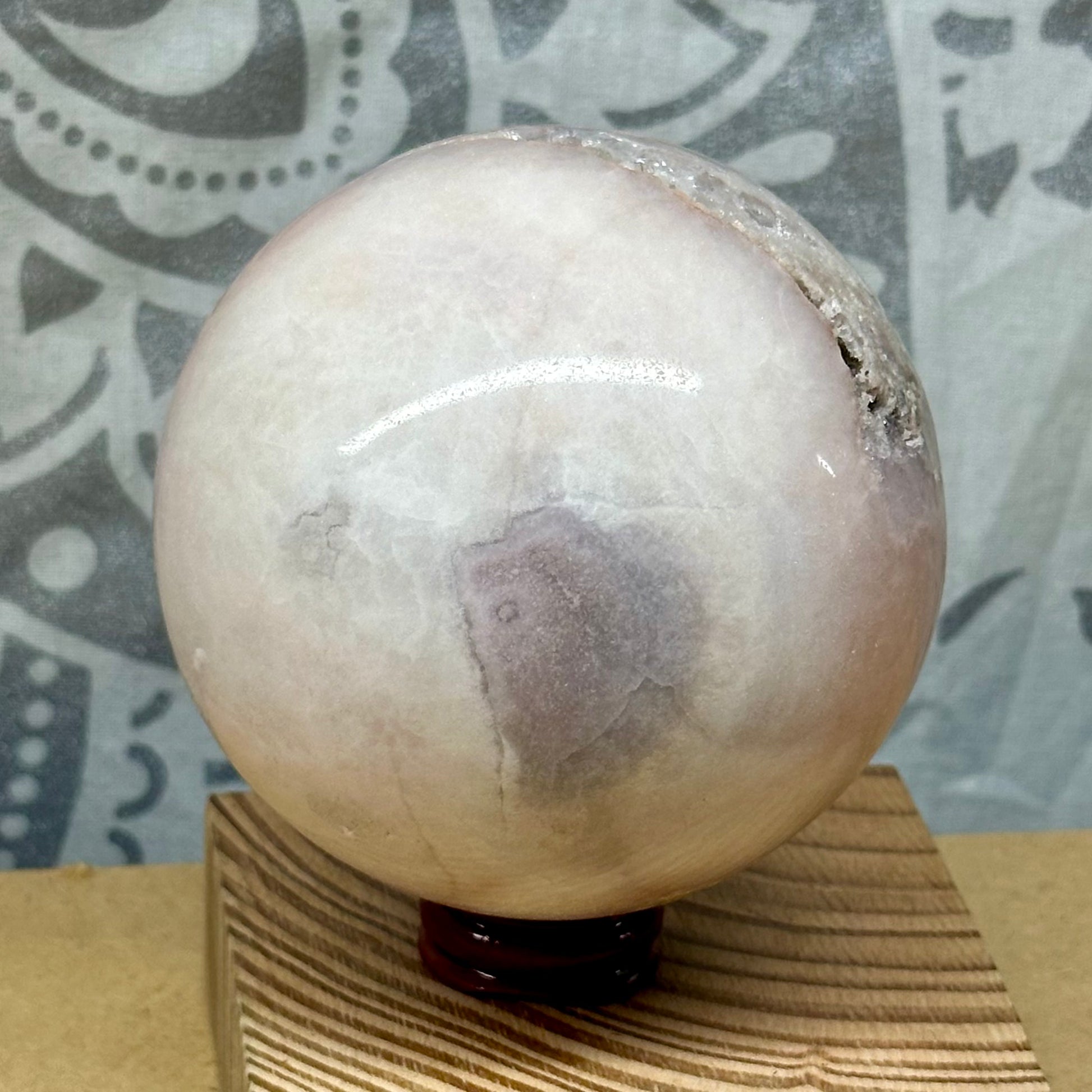 This 10cm Pink Amethyst Sphere, weighing approximately 800g, serves as an elegant statement piece. Known for its soothing pink hues, it can enhance any space with a calming visual presence. Its size and polished finish make it ideal for display, reflecting expert craftsmanship and natural beauty.