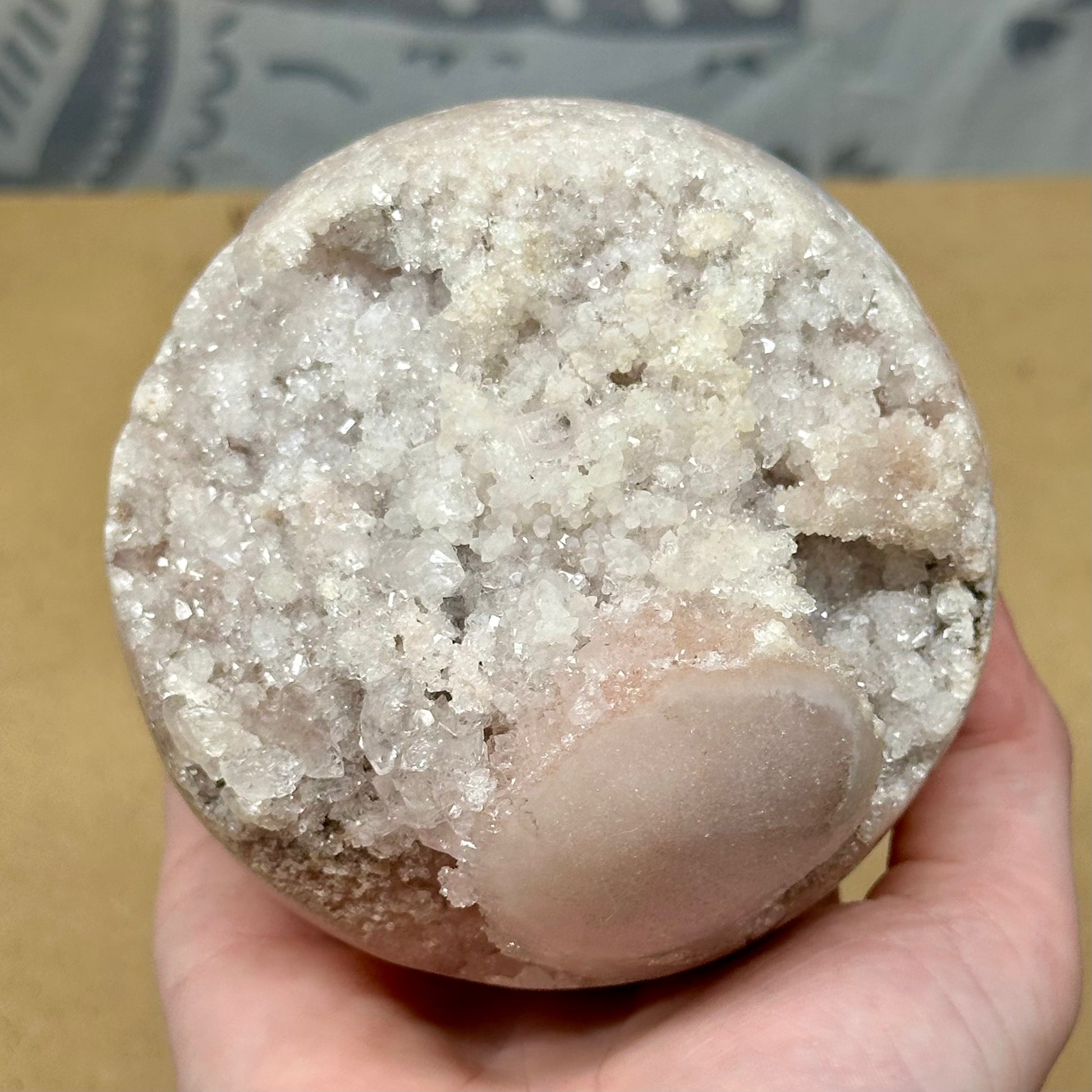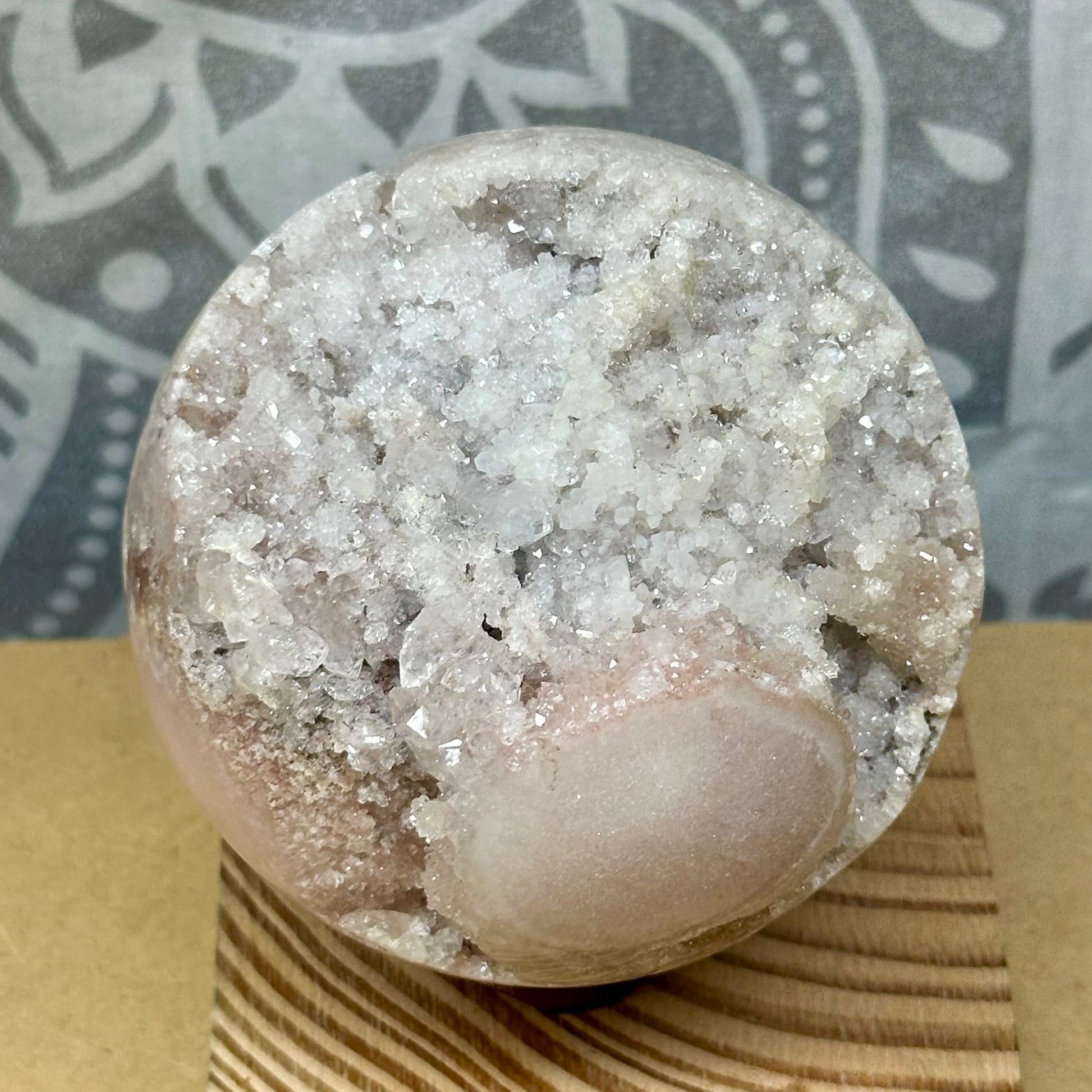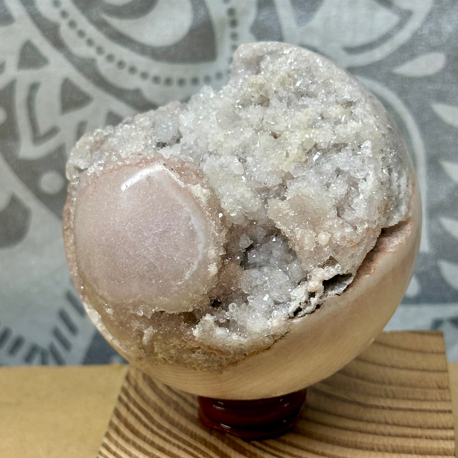 This 10cm Pink Amethyst Sphere, weighing approximately 800g, serves as an elegant statement piece. Known for its soothing pink hues, it can enhance any space with a calming visual presence. Its size and polished finish make it ideal for display, reflecting expert craftsmanship and natural beauty.