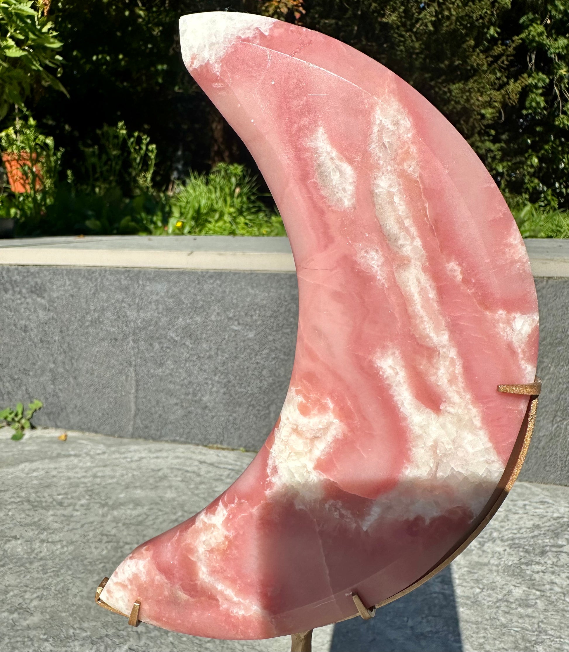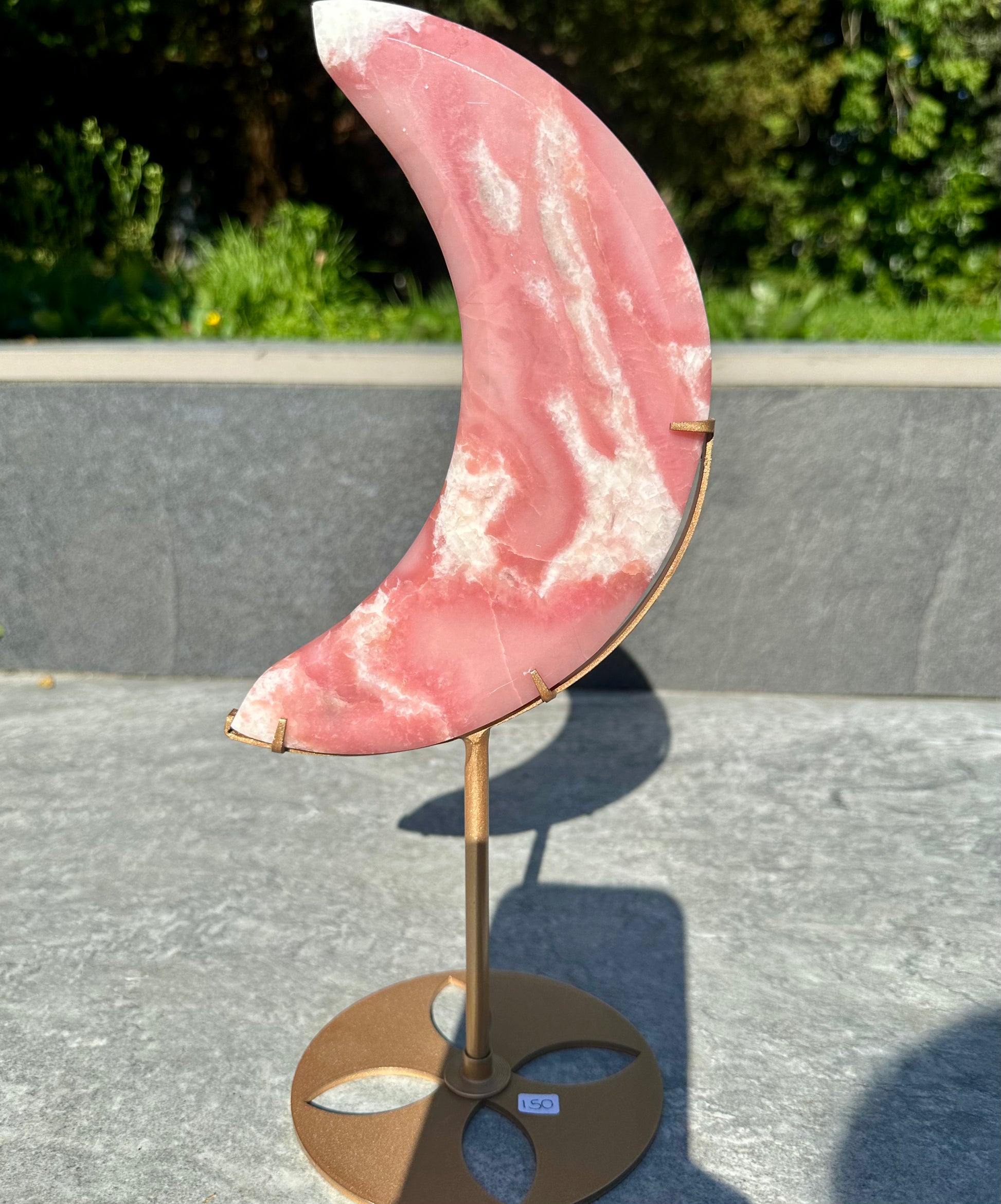 This elegant Pink Opal Moon Carving, measuring 20cm, is beautifully displayed on a 23cm tall on stand. Renowned for its soothing energy, pink opal promotes emotional balance and calm, making this piece a refined addition to any collection or healing space. The moon shape enhances its symbolism of intuition and nurturing energy, creating both a stunning visual and a meaningful aura.