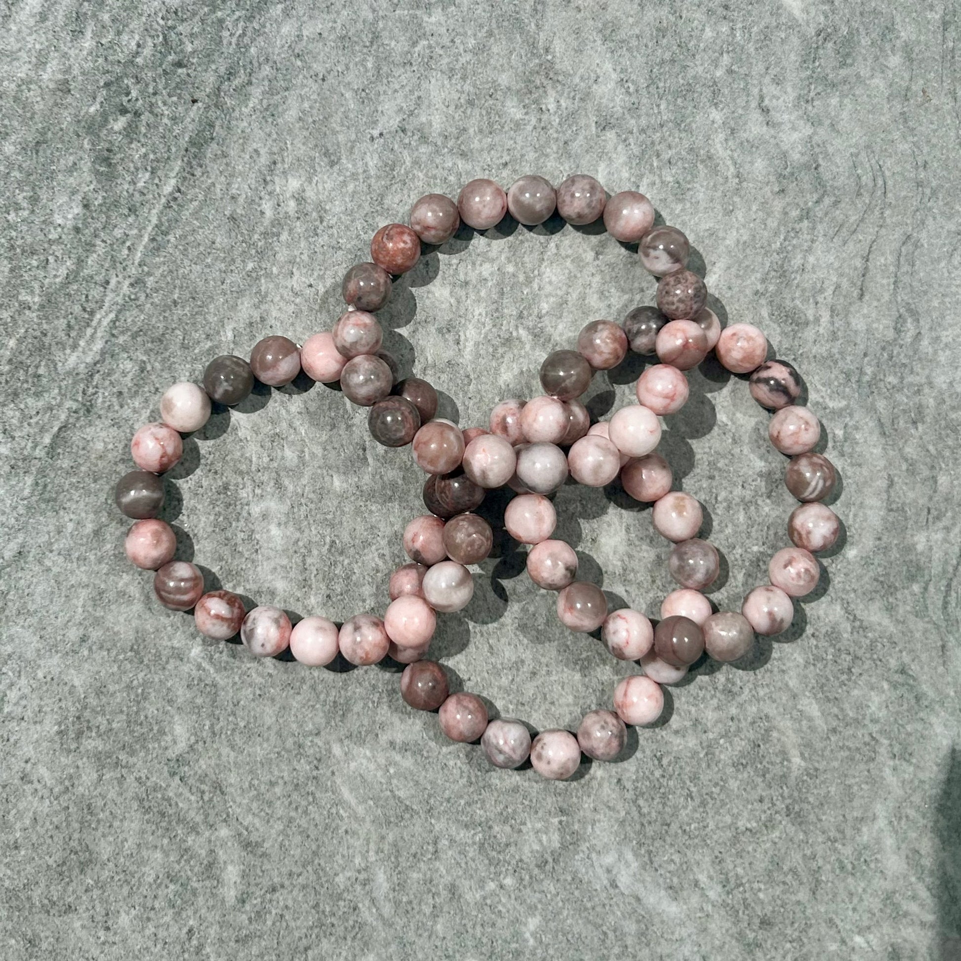 This 10mm Pink Zebra Jasper bracelet combines striking visual appeal with metaphysical properties. The distinctive pink and white striped patterns of this natural stone are believed to promote balance, strength, and emotional healing. Each bracelet features carefully selected beads to showcase the stone's unique banding characteristics.