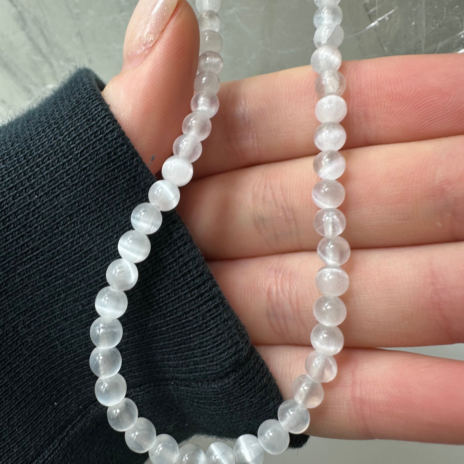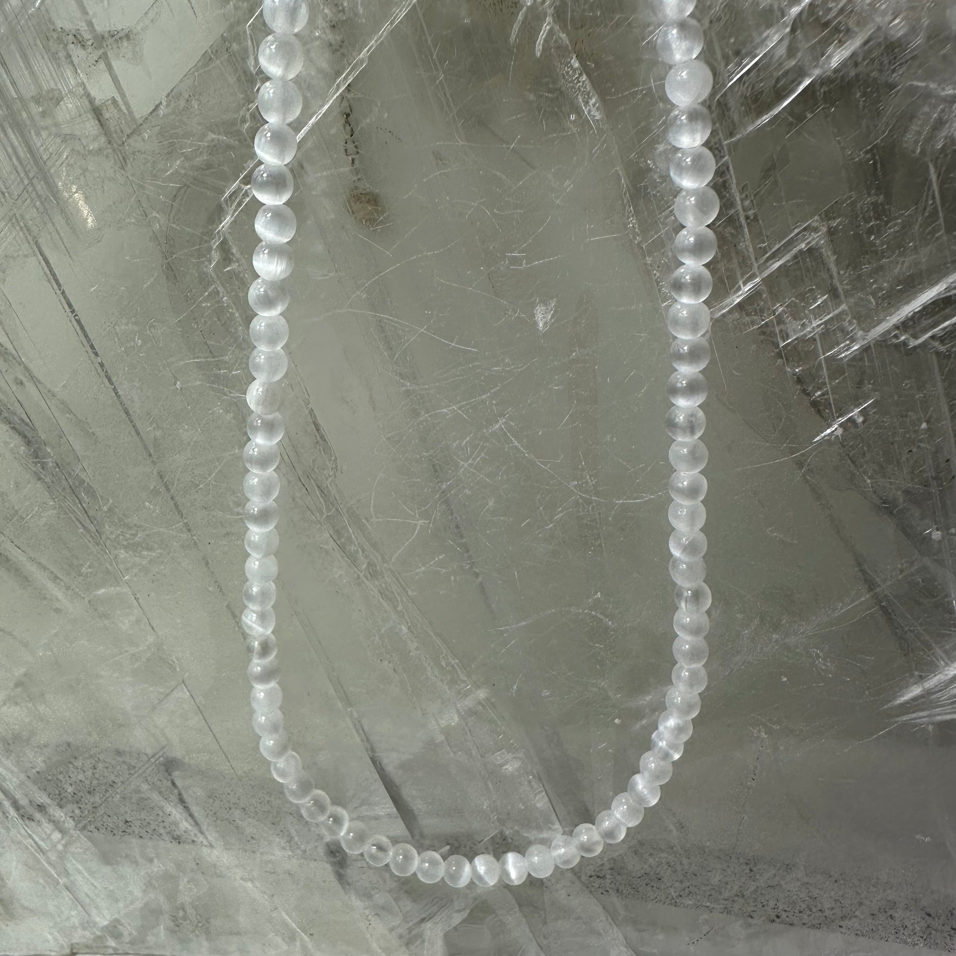 Selenite Beaded Necklace Crafted with 4mm selenite beads strung to a graceful 40cm length, this delicate necklace weighs just 12g, making it effortlessly wearable. Selenite is revered in crystal healing traditions for its purifying and clarifying properties, believed to cleanse negative energy and promote mental clarity. Known as a stone of light, selenite is associated with spiritual awareness and inner peace. Its translucent, luminous quality makes it both a meaningful spiritual tool and an elegant accessory for everyday wear or meditation practice.