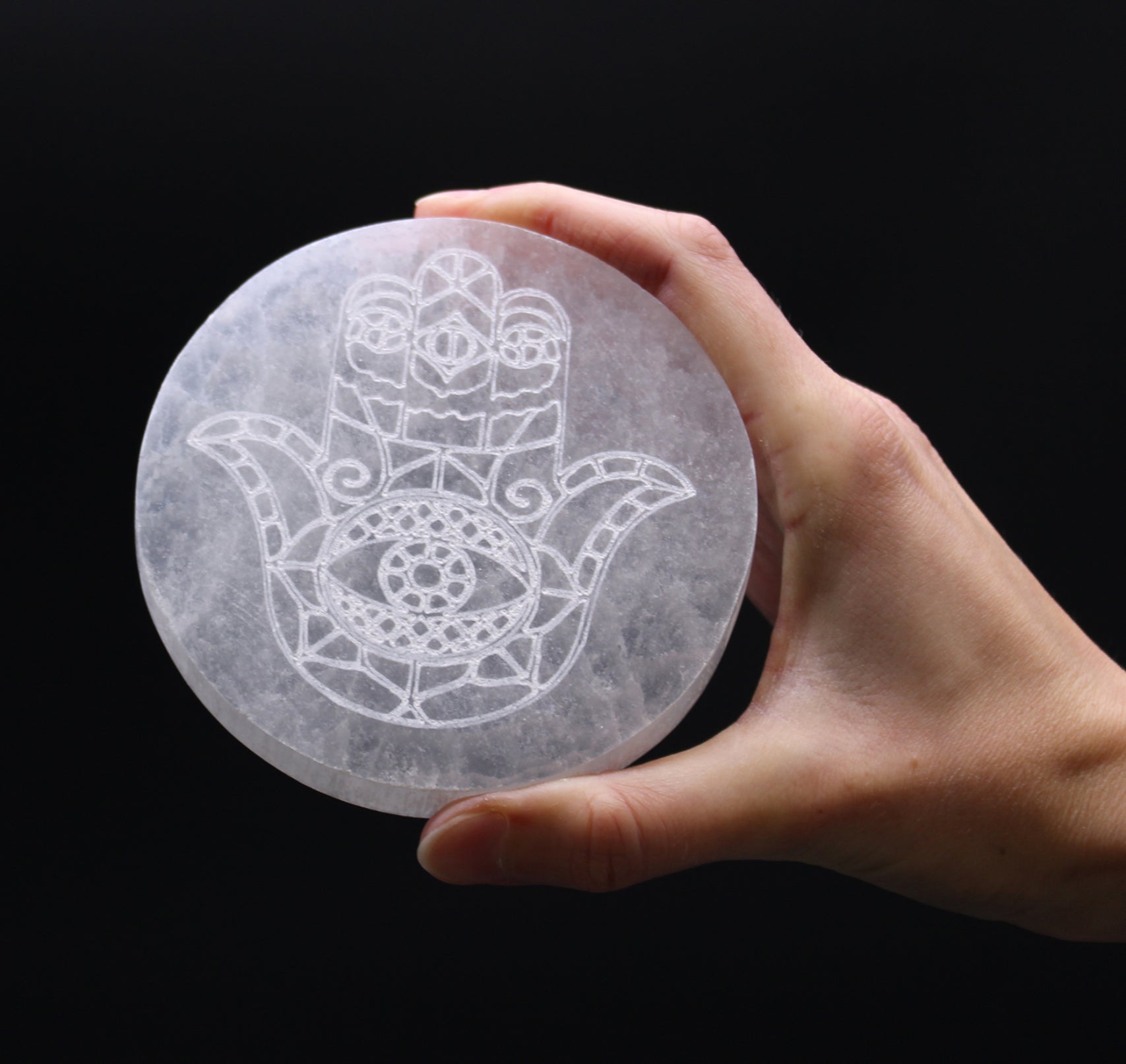 Expertly crafted from selenite, this Hamsa hand plate provides a stunning display for your treasures. With its protective and healing properties, selenite is the perfect material for this intricate design. Add a touch of elegance and positive energy to any space with this beautiful piece.