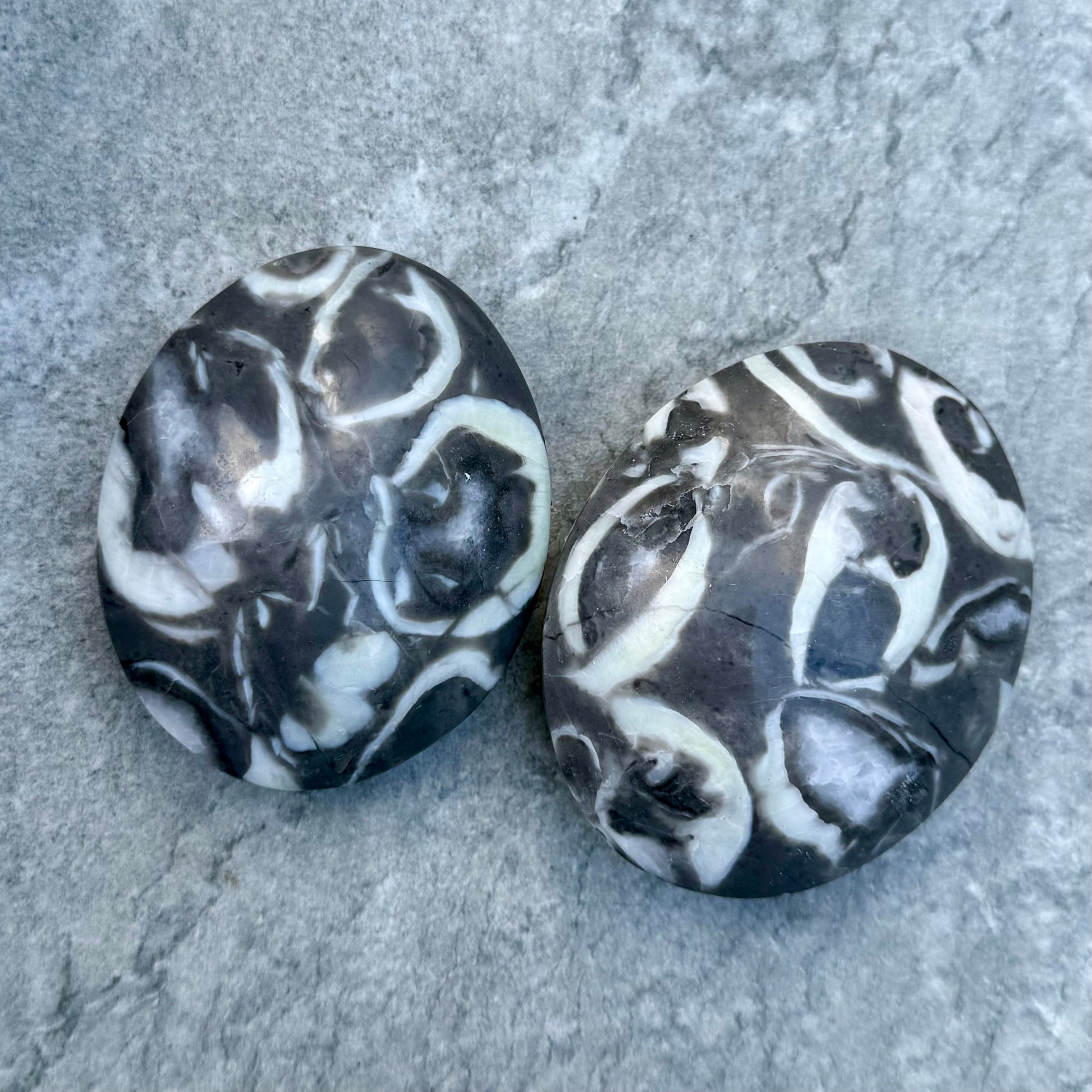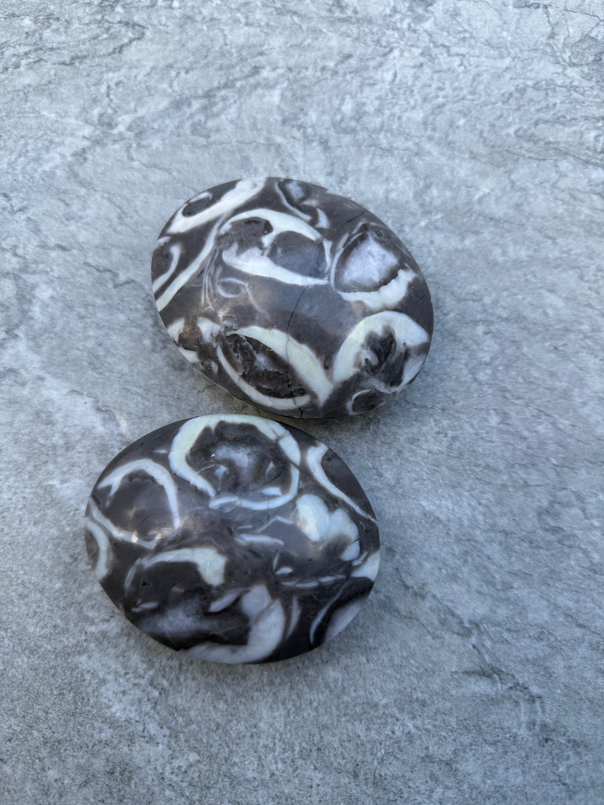 Shell Jasper Palms are compact hand-carved stones, measuring 10cm long and 8cm wide, designed to fit comfortably in your palm. Jasper is prized in crystal healing traditions for its grounding properties and connection to earth energy. These palm stones are ideal for meditation, energy work, or simply carrying as a tactile reminder of calm throughout your day. The natural shell patterns within the jasper create unique variations in each piece, making every palm stone one-of-a-kind. Perfect for collectors, practitioners, or those seeking a meaningful natural object.