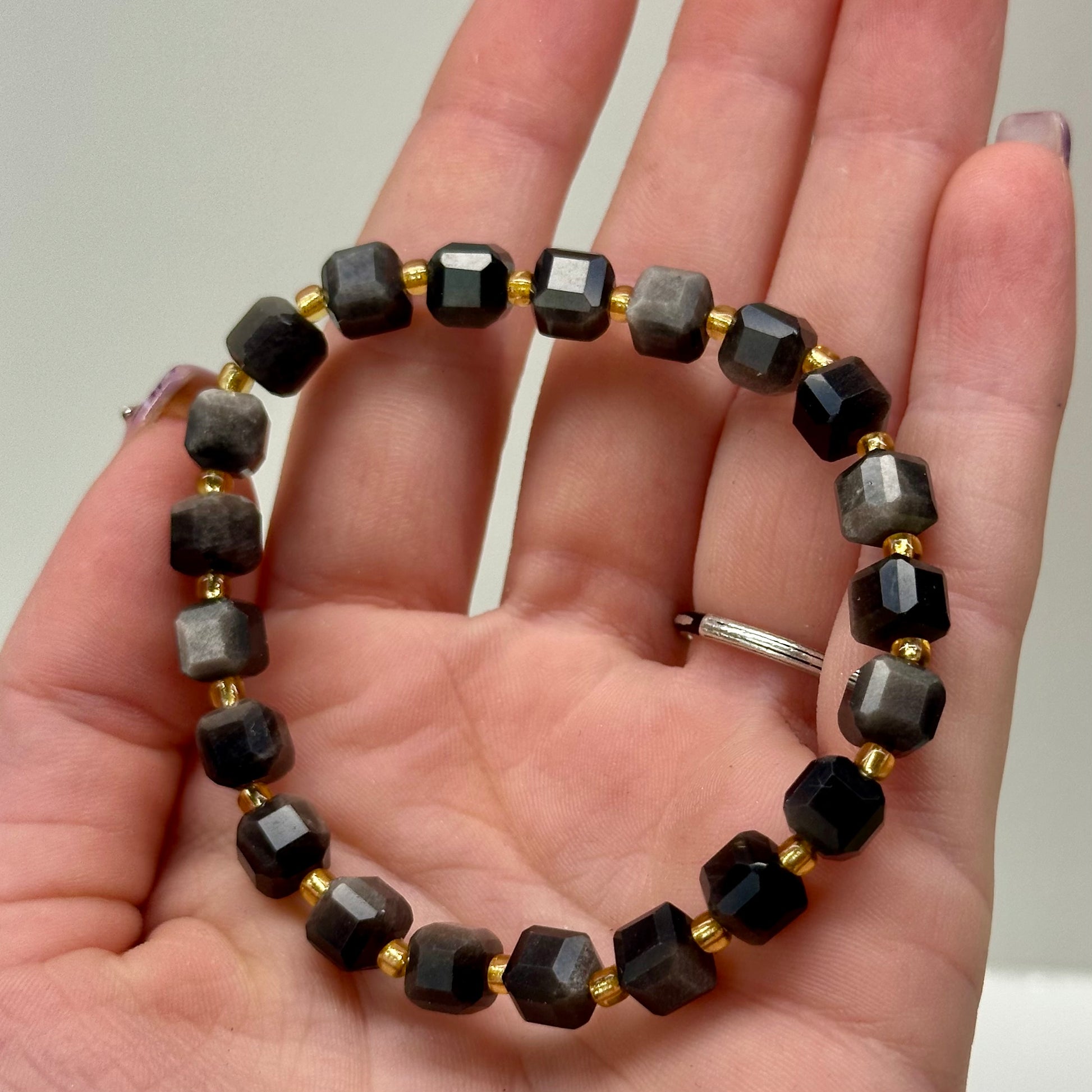 The cube shape of these bracelets amplifies the crystal's natural energy, as cubes symbolise stability, balance, and solid foundations. Wearing a Silver Sheen Obsidian cubed bracelet allows you to carry these supportive vibrations throughout your day, making it a meaningful accessory for meditation, mindfulness, or everyday spiritual practice.