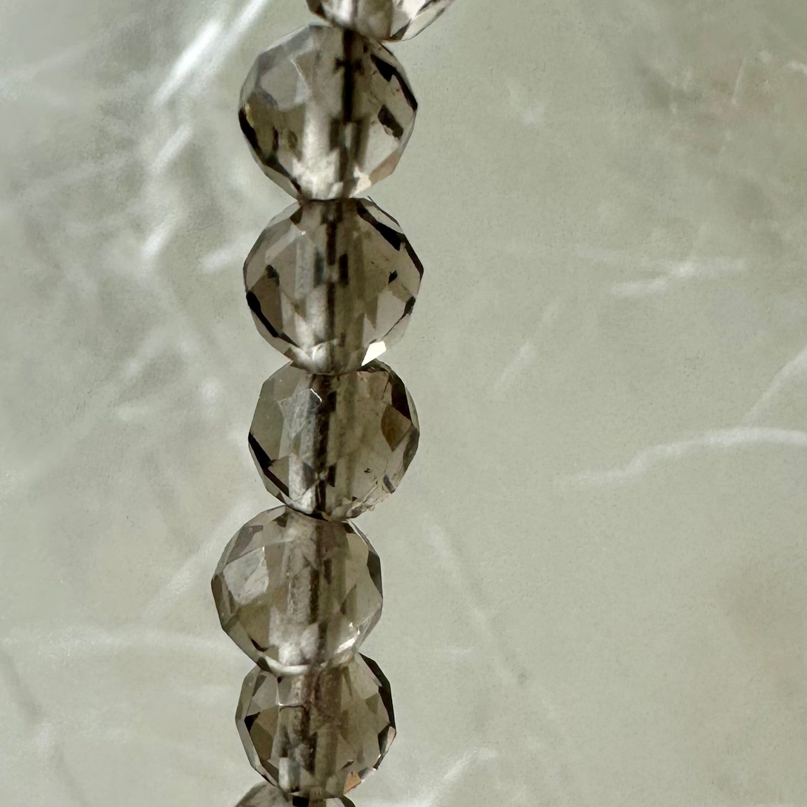 Smokey Quartz Beaded Necklace Crafted with 3mm smokey quartz beads strung along a delicate 39cm strand, this necklace weighs just 6g, making it effortlessly wearable for daily adornment. Smokey quartz is traditionally valued for its grounding properties, believed to anchor energy and promote emotional stability during challenging times. The subtle grey-brown hues of this semi-precious stone complement any wardrobe whilst offering a meaningful connection to natural crystal energy. An ideal choice for those seeking both aesthetic appeal and the contemplative benefits associated with this protective mineral.