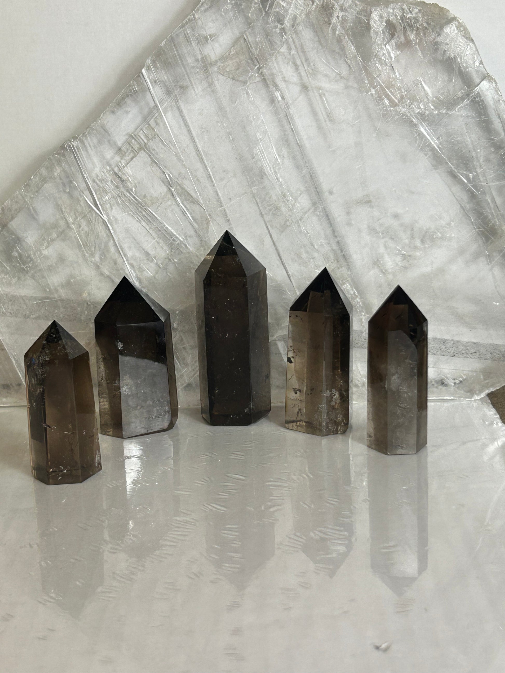 Smokey Quartz Towers are natural crystal formations prized for their grounding energy and sophisticated aesthetic. Each tower features the distinctive smoky-brown hues characteristic of this variety, making them striking display pieces for home or office spaces. Known in crystal practice for promoting stability and mental clarity, these towers work beautifully as meditation focal points or wellness décor. Ideal for collectors, practitioners, and those seeking a premium gift that combines natural beauty with purposeful intention.