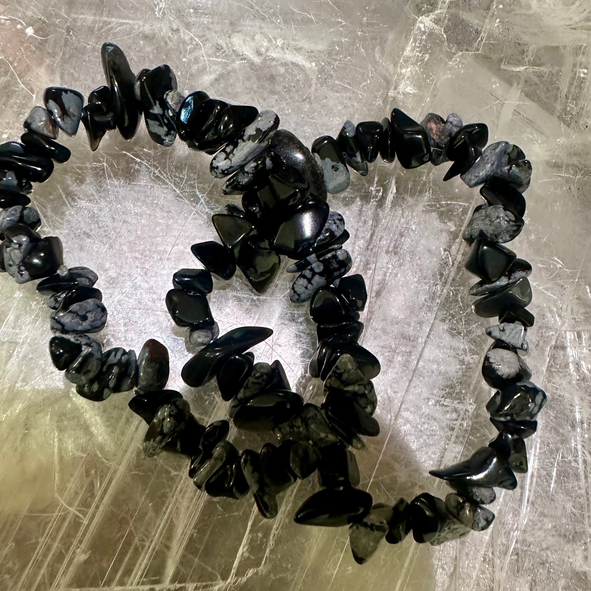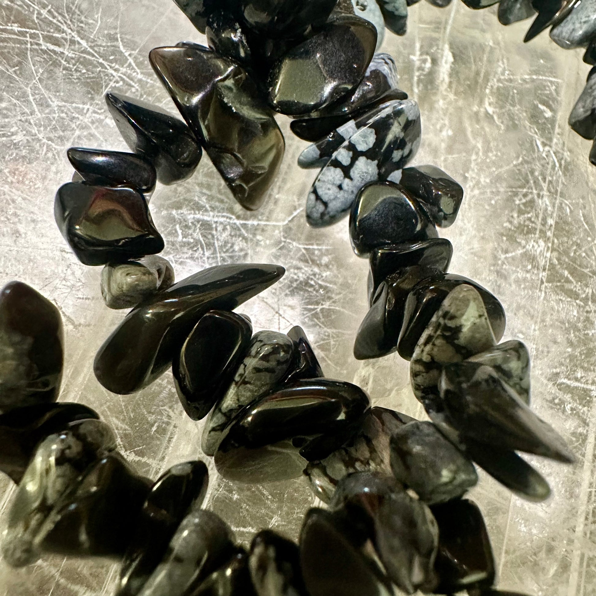 Snow Flake Obsidian Chipped Bracelets are striking pieces featuring the distinctive black and white patterning of natural obsidian. Each bracelet showcases genuine chipped stone beads, creating an organic, textured aesthetic that appeals to crystal enthusiasts and wellness seekers alike. Snowflake Obsidian is traditionally valued for its grounding properties and is believed to promote emotional balance and clarity. These bracelets work beautifully as standalone pieces or layered with other jewellery, making them versatile additions to any collection. Perfect as thoughtful gifts for those drawn to natural gemstones and holistic wellness practices.