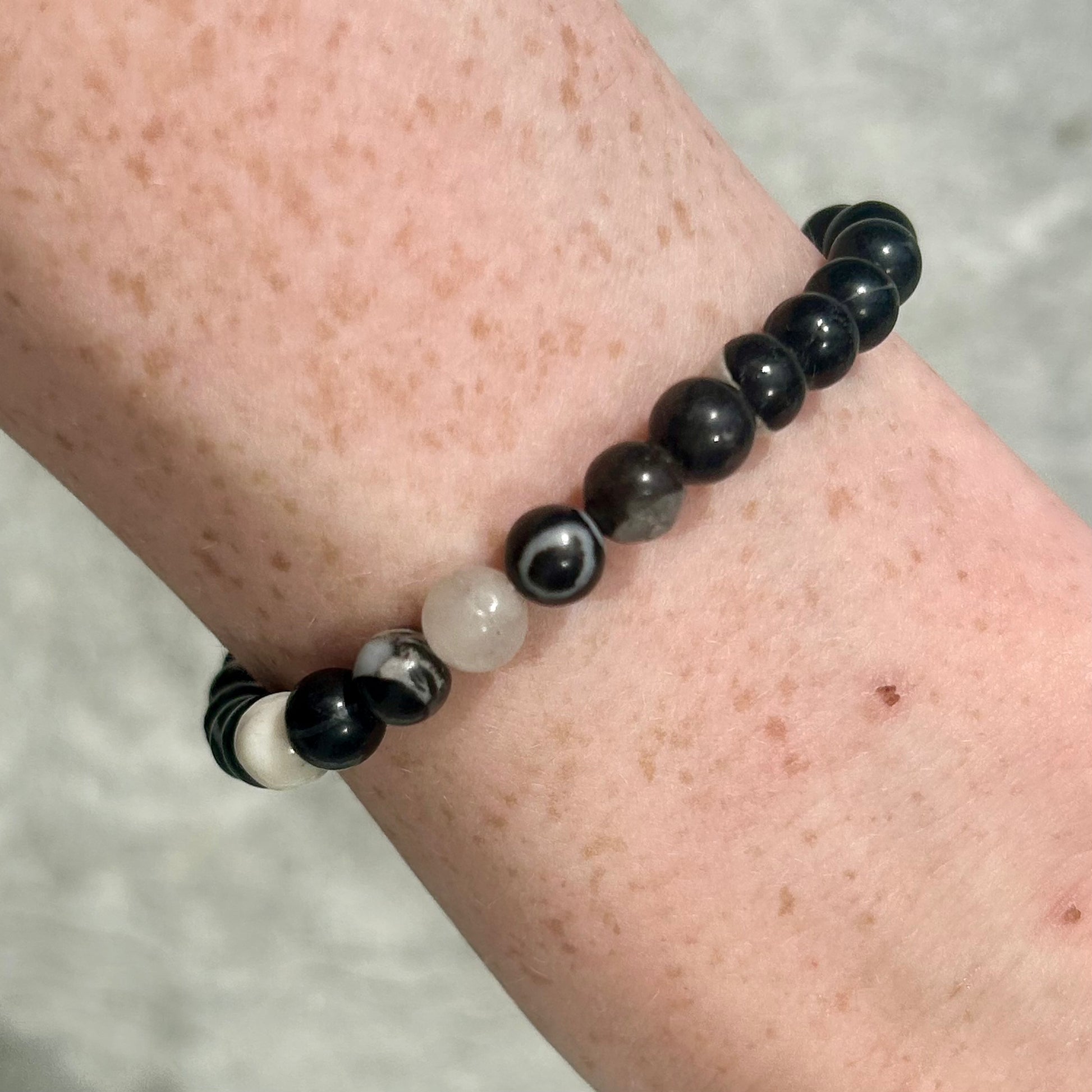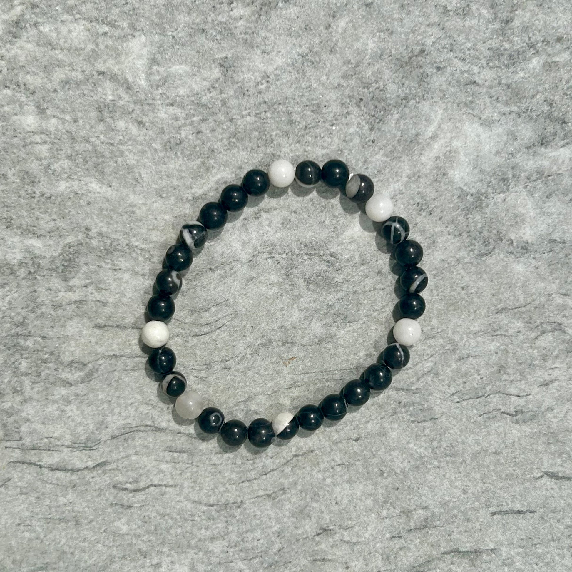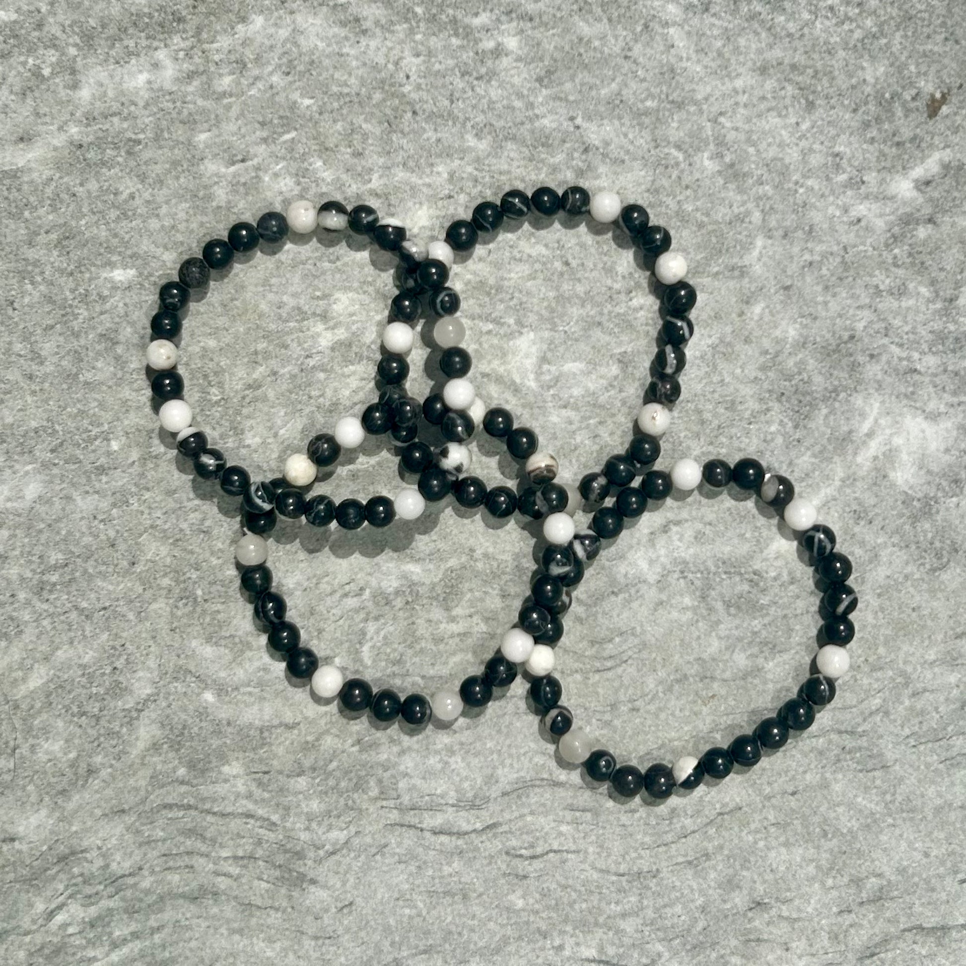 This 6mm Zebra Jasper bracelet features distinctive black and white striped patterns unique to each stone. Known for its grounding properties, this natural gemstone bracelet combines earthy elegance with potential balancing energies, making it a sophisticated addition to your crystal collection.