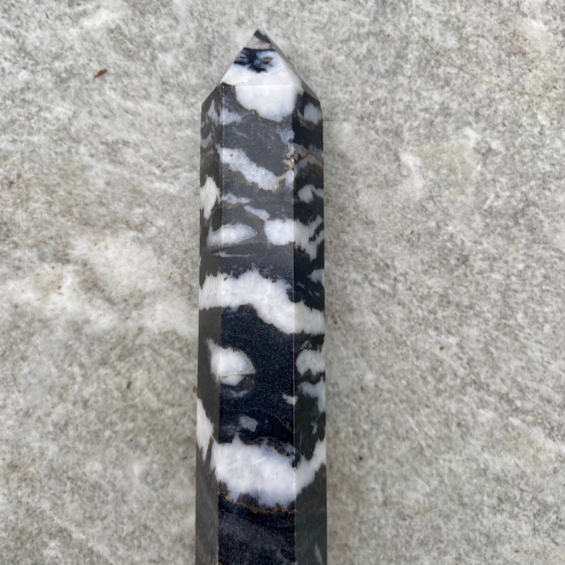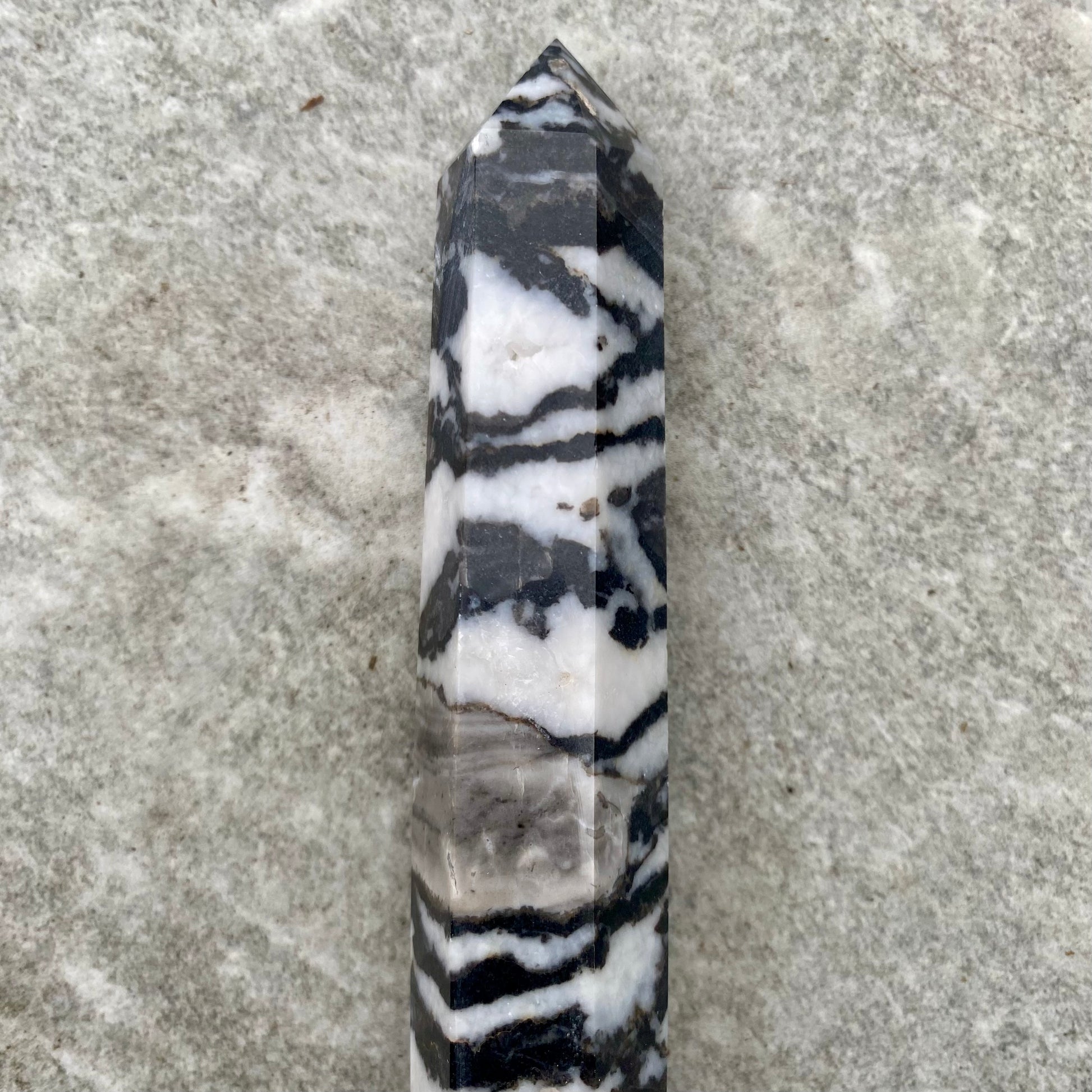 Zebra Jasper Towers stand roughly 10cm tall, showcasing the distinctive black and white striped patterns characteristic of this grounding stone. Each tower is a natural formation, making every piece unique in its banding and mineral composition. Zebra Jasper is traditionally valued for its stabilising properties and is believed to promote balance and resilience. These polished towers serve as striking display pieces for crystal collections or meditation spaces, combining aesthetic appeal with the mineral's reputed calming influence.
